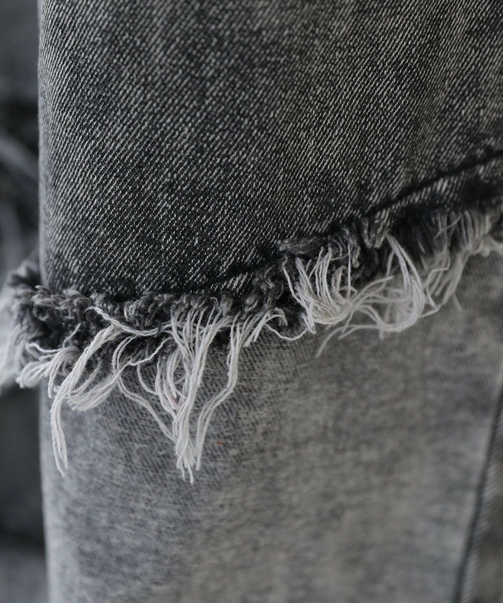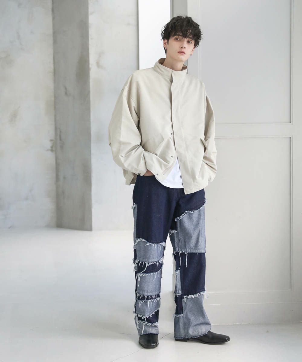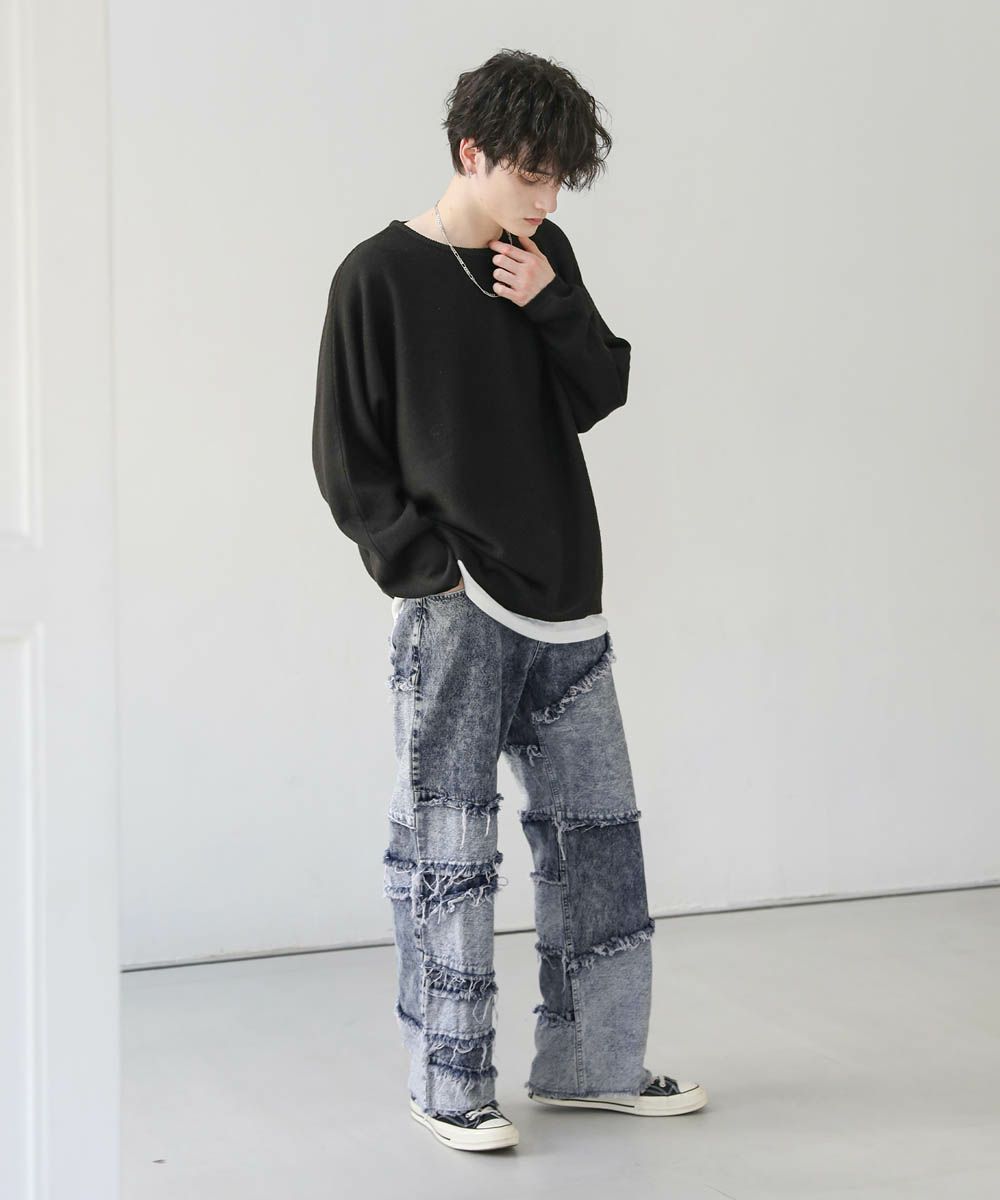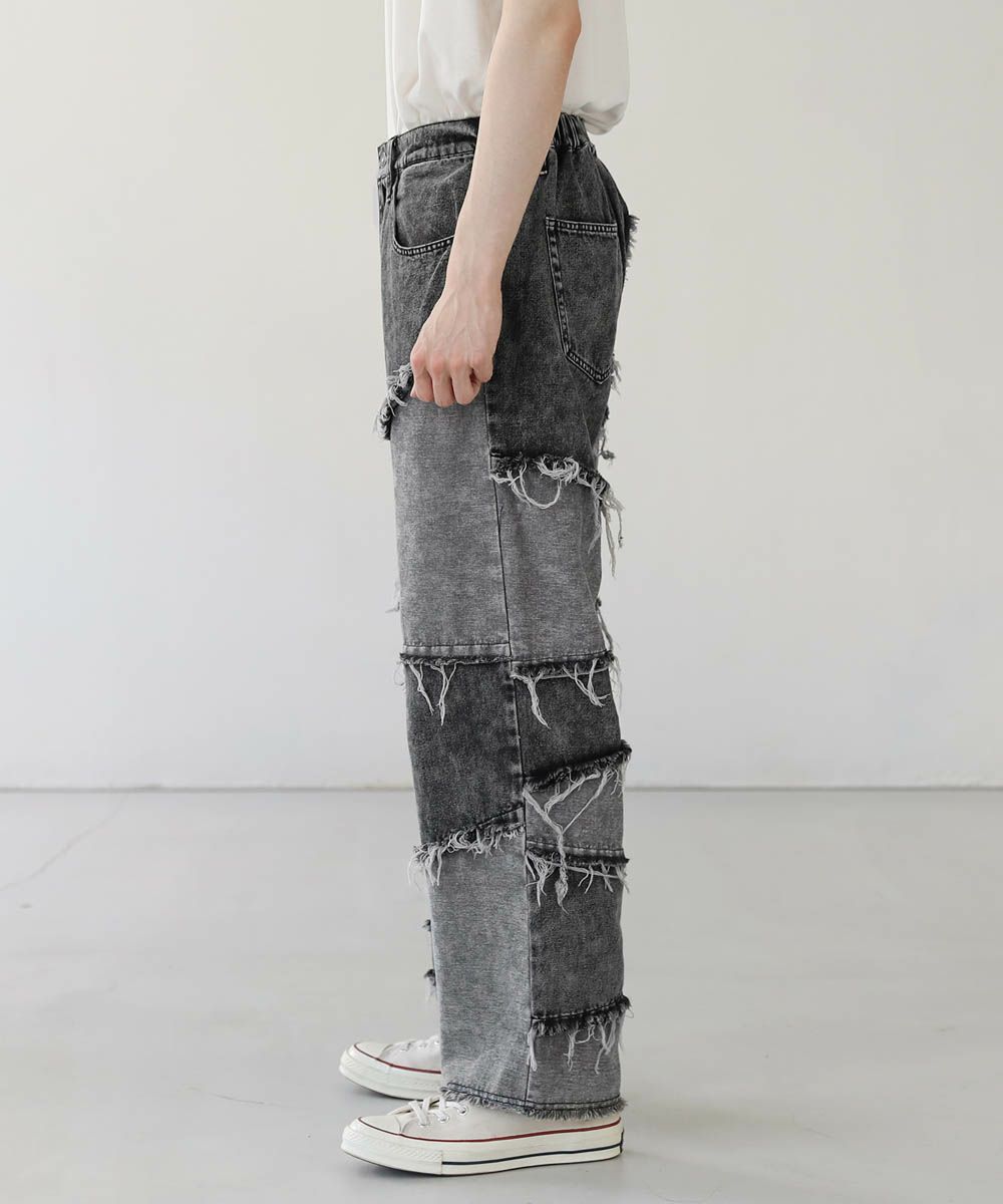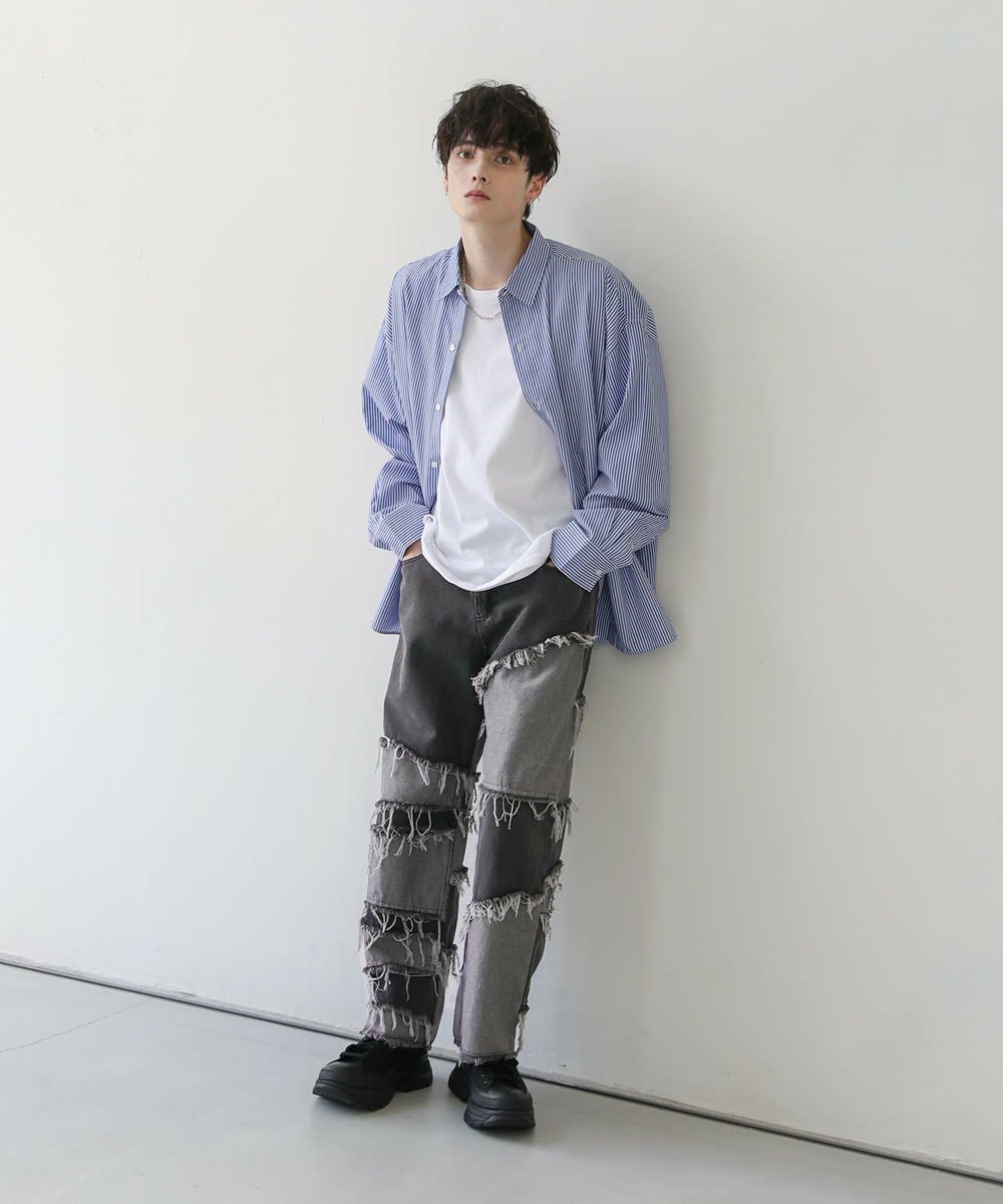 着こなしのメインになるフリンジ切り替えデニム。異なるカラーのデニムを組み合わせたパッチワークのようなデザイン&フリンジがアクセントに。シンプルなトップスと合わせるだけでもインパクトのある着こなしに見せてくれる、デザイン性の高い一本です。生地は程よい厚みのある綿100%デニムを採用し、シーズンを問わずに着用が可能。またウエストのバックはゴム入りになっているので楽に穿けるのもポイント。すとんと裾に向かって落ちるワイドストレートのシルエットは体型を問わずにキレイに穿きこなせます。