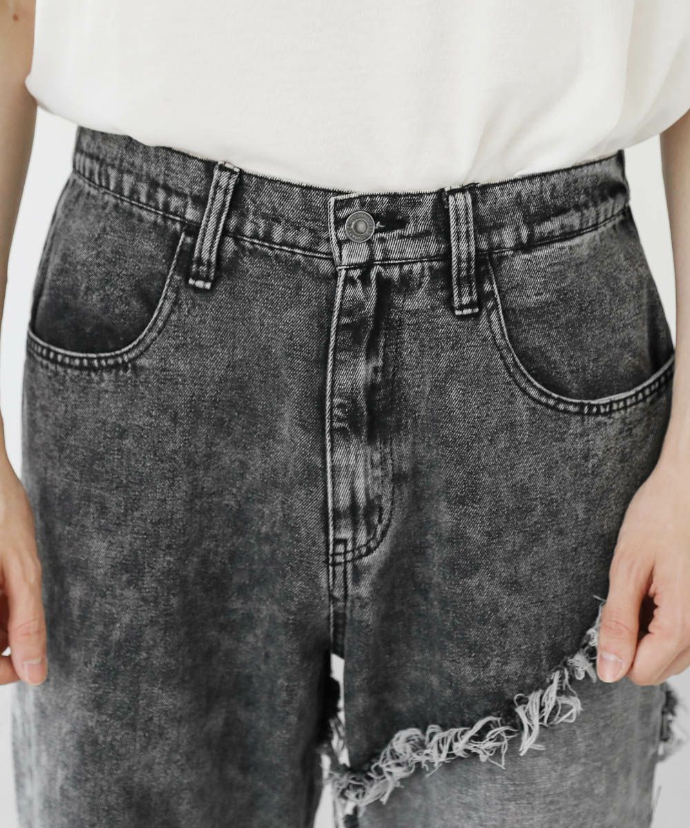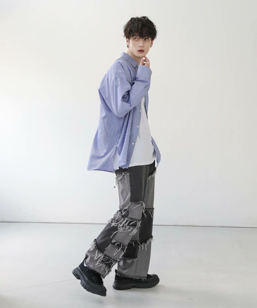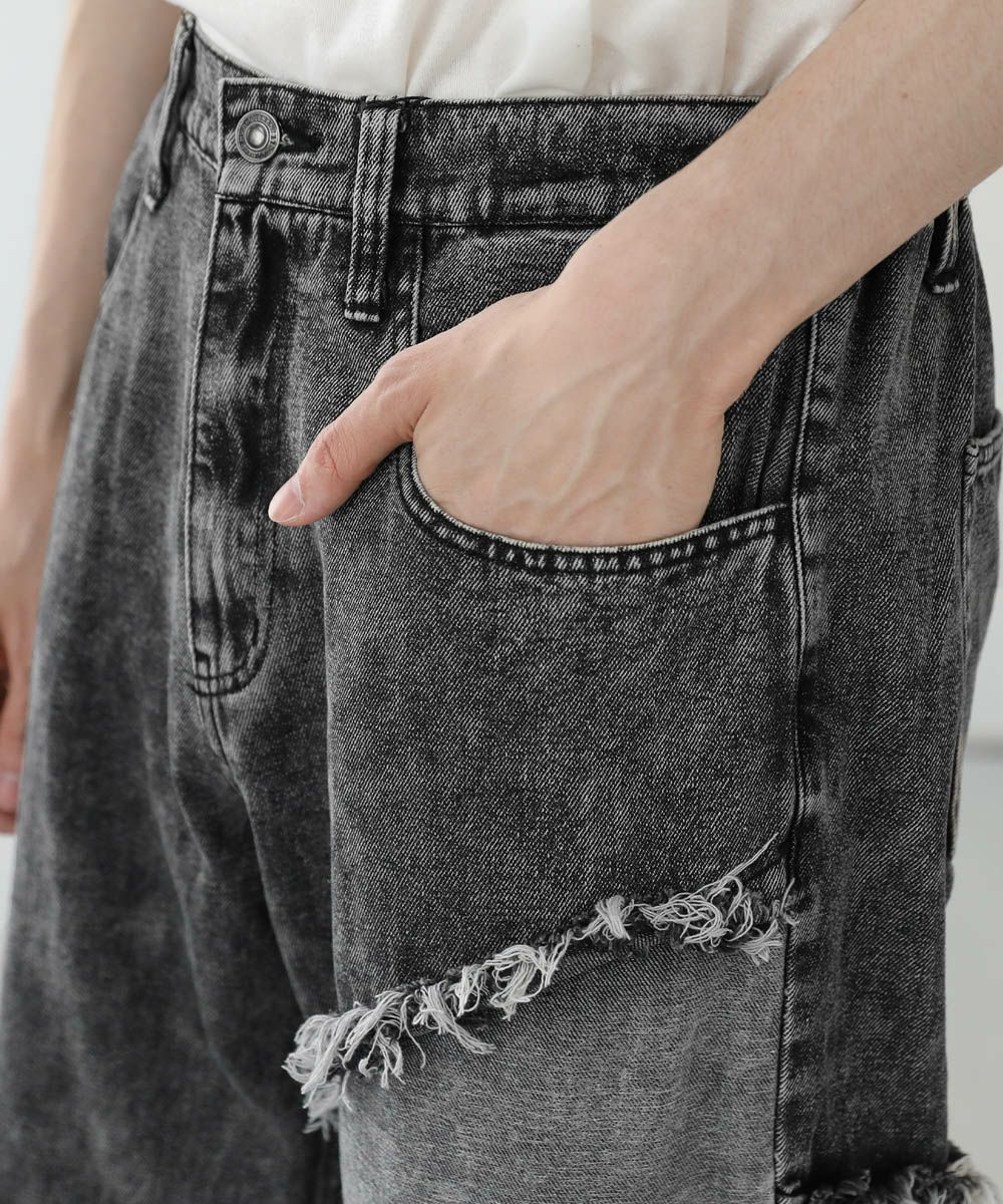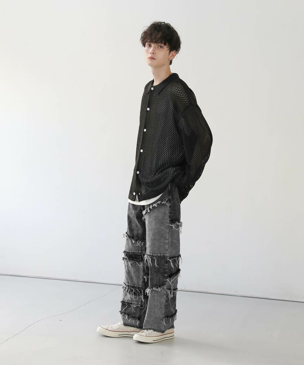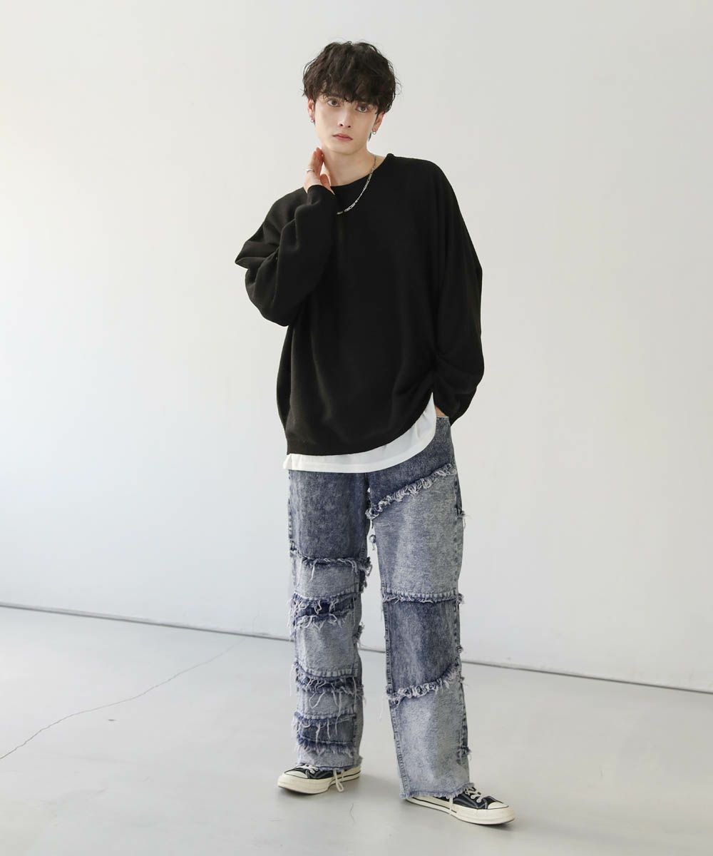 着こなしのメインになるフリンジ切り替えデニム。異なるカラーのデニムを組み合わせたパッチワークのようなデザイン&フリンジがアクセントに。シンプルなトップスと合わせるだけでもインパクトのある着こなしに見せてくれる、デザイン性の高い一本です。生地は程よい厚みのある綿100%デニムを採用し、シーズンを問わずに着用が可能。またウエストのバックはゴム入りになっているので楽に穿けるのもポイント。すとんと裾に向かって落ちるワイドストレートのシルエットは体型を問わずにキレイに穿きこなせます。