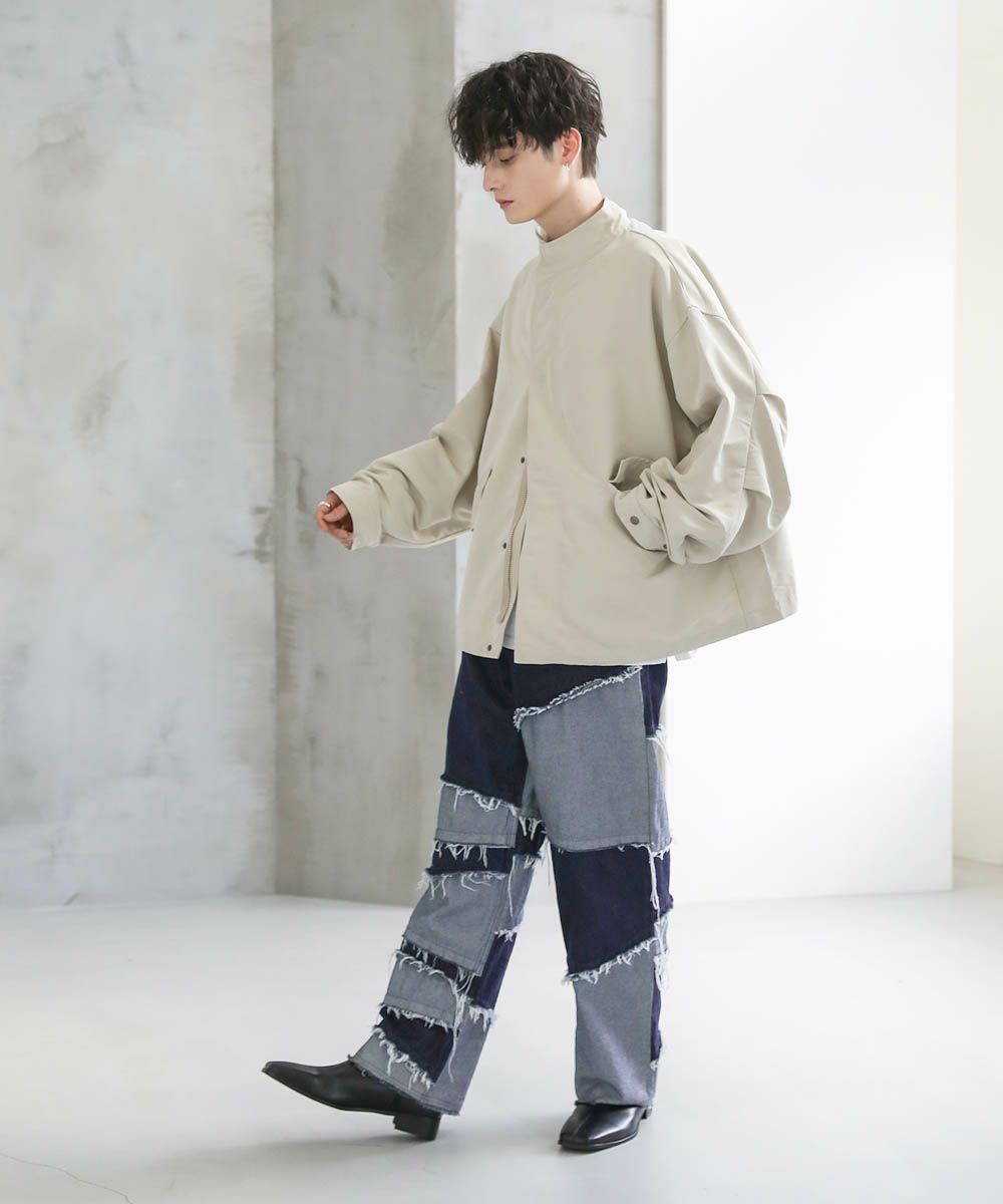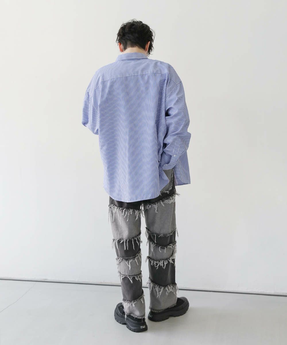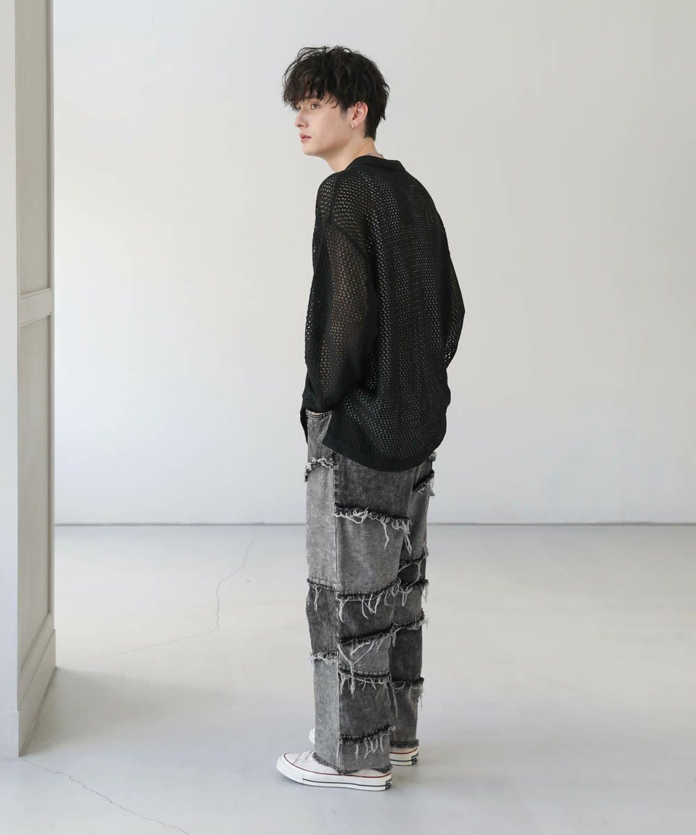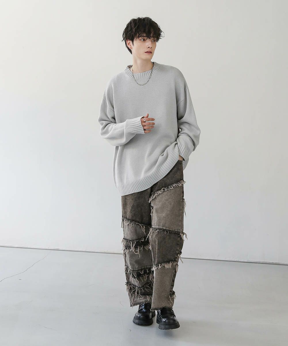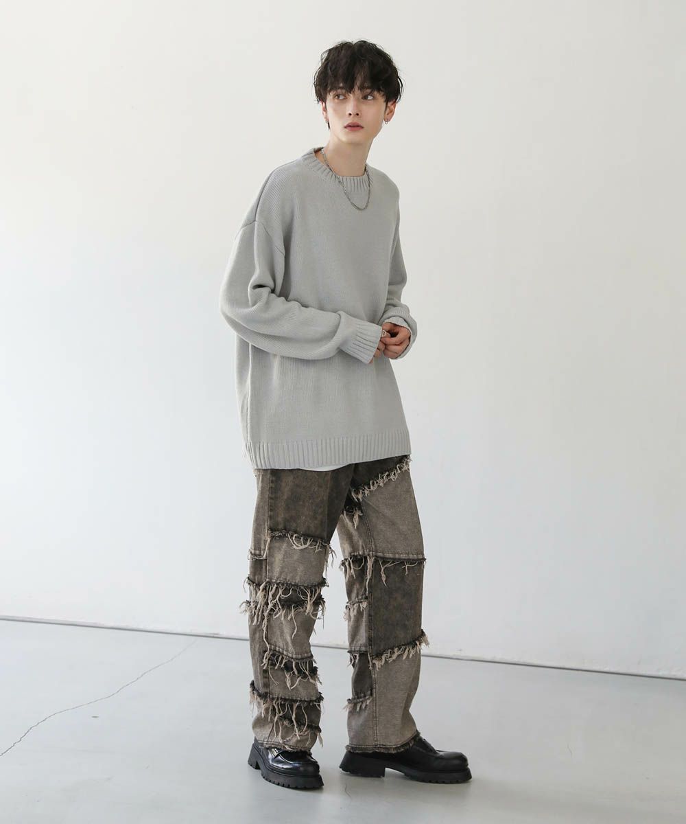 着こなしのメインになるフリンジ切り替えデニム。異なるカラーのデニムを組み合わせたパッチワークのようなデザイン&フリンジがアクセントに。シンプルなトップスと合わせるだけでもインパクトのある着こなしに見せてくれる、デザイン性の高い一本です。生地は程よい厚みのある綿100%デニムを採用し、シーズンを問わずに着用が可能。またウエストのバックはゴム入りになっているので楽に穿けるのもポイント。すとんと裾に向かって落ちるワイドストレートのシルエットは体型を問わずにキレイに穿きこなせます。