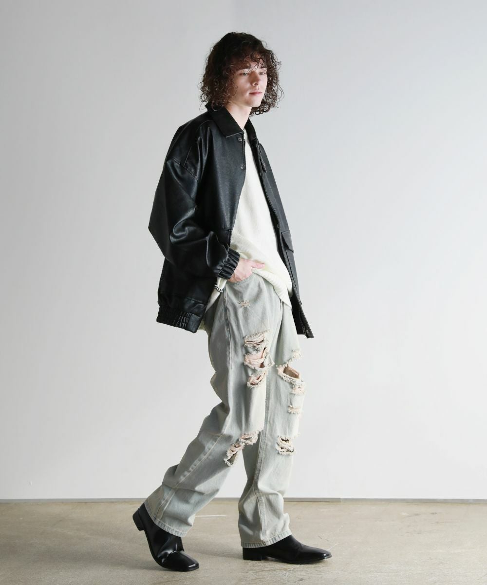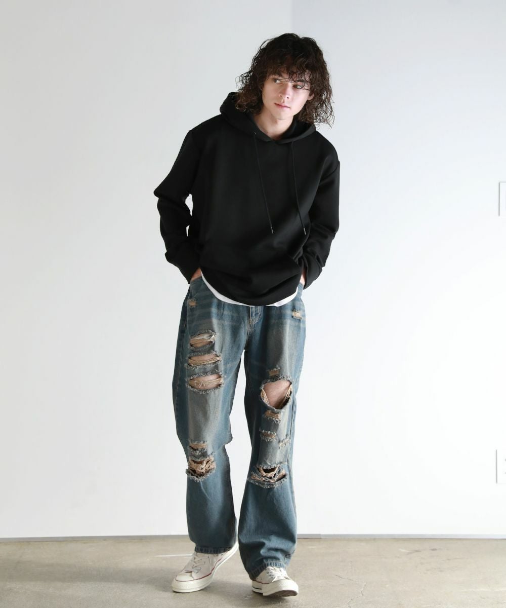 ヴィンテージ感のある風合いと、膝から太腿にかけてダメージ加工を大きく施した他にはない1本。デザイン性がありながらも、ダメージデニム初心者でもチャレンジしやすいシルエットや色合いで仕上げました。またワイド過ぎないストレートシルエットなので、足をまっすぐにすらっと魅せてくれます。ウエスト部分は後ろ部分がゴム、また紐で調節できるのでベルト要らずで楽に着用が可能です。