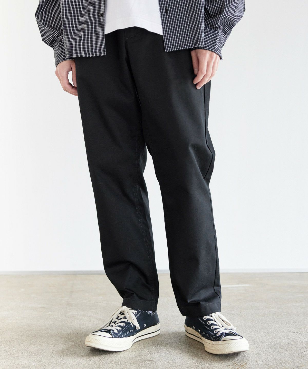 ゆとりを持たせたシルエットと、ストレスフリーな穿き心地が魅力のテーパードパンツ。フロントには深めのタックを入れることにより、立体感をプラスしました。腰周りにゆとりを持たせつつ、裾にかけてやや細くなるテーパードシルエットですっきりとした印象で穿きこなせます。ウエストは後ろ側にゴム、内側に調節紐を施したイージー仕様になっており、紐は内側にしまっても外に出してもサマになる2WAYの着こなしが可能。さらに、ベルトループを備えているため、タックインスタイルもかっこよくキマります。無駄を省いたシンプルなデザインながら、バックに施したブランドロゴがさりげないアクセントに。ディッキーズならではのタフな生地感とベーシックなデザインでヘビロテ必至のアイテムです。