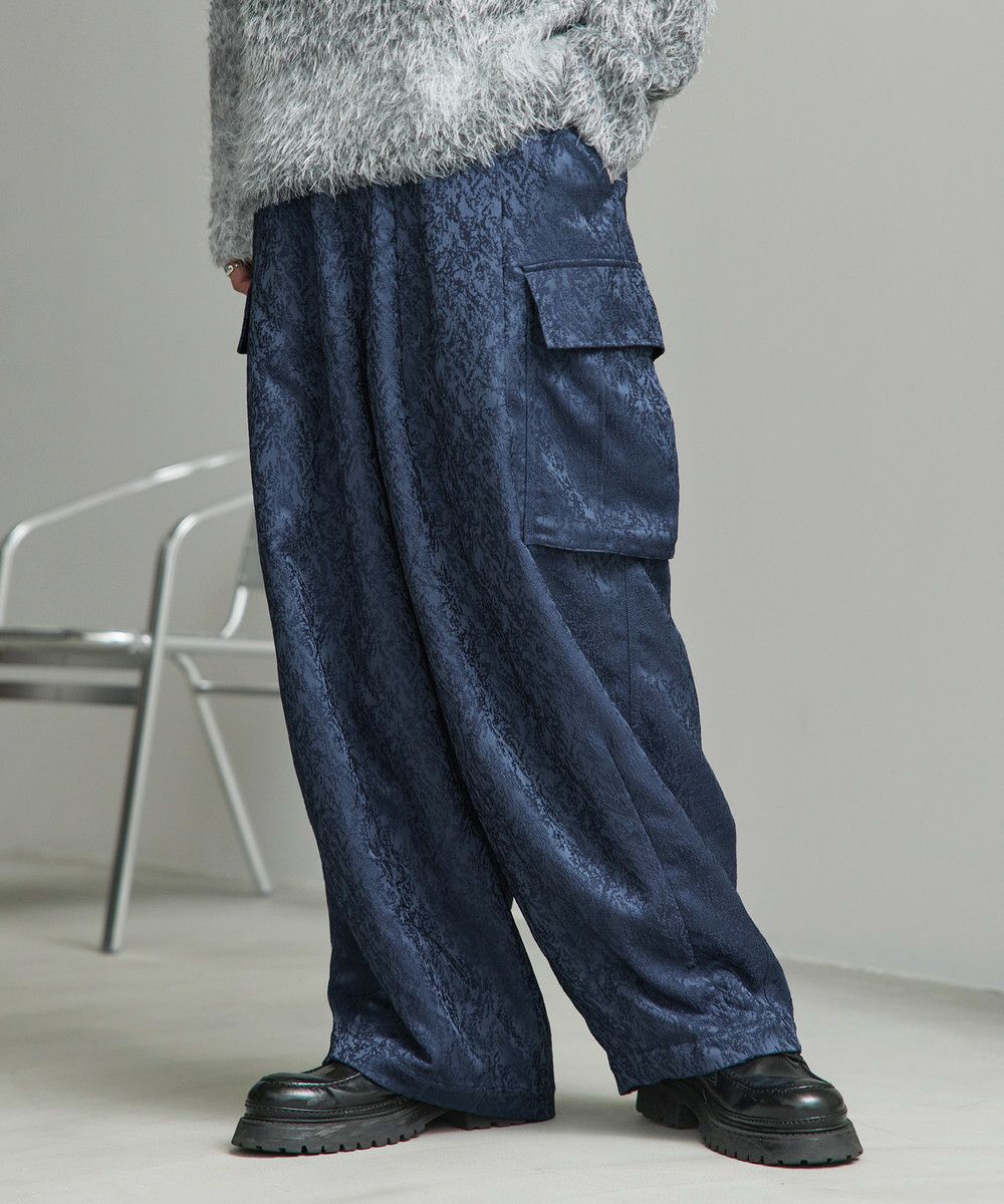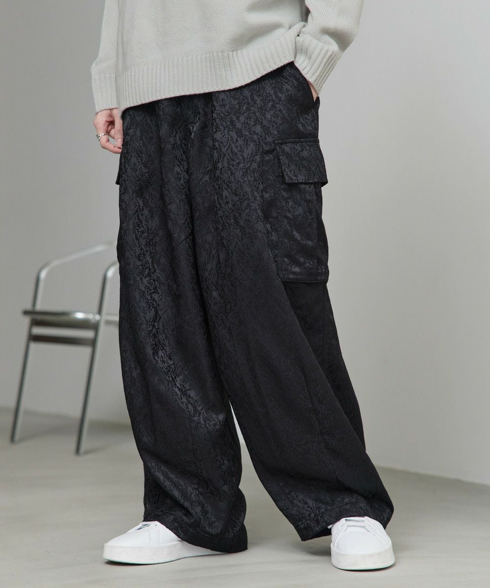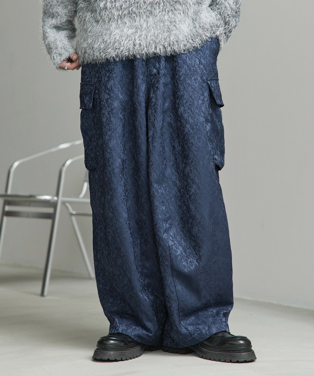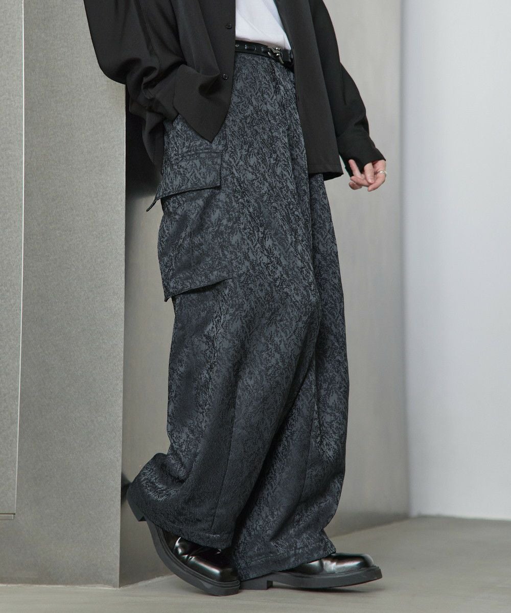今シーズン注目の総柄ジャガードを使用したカーゴパンツ。立体的なシルエットと大きなカーゴポケットが抜け感をプラスしてくれます。生地の凹凸によって柄を作り出したジャガード柄は派手になりすぎず、さり気ないアクセントに。キレイめなルックスながら、ウエストの後ろはゴム入りで穿きやすさも兼ね備えています。また、ベルトループ付きでウエストまわりのアレンジがしやすいのもポイント。タックインスタイルもかっこよくキマるハイウエスト仕様なので、コーディネートの幅が広がります。