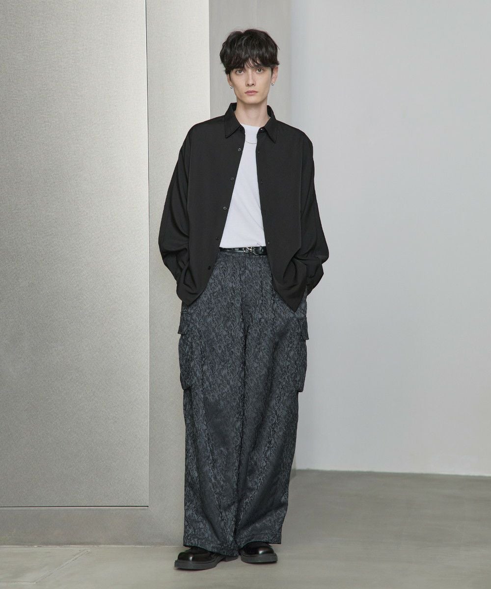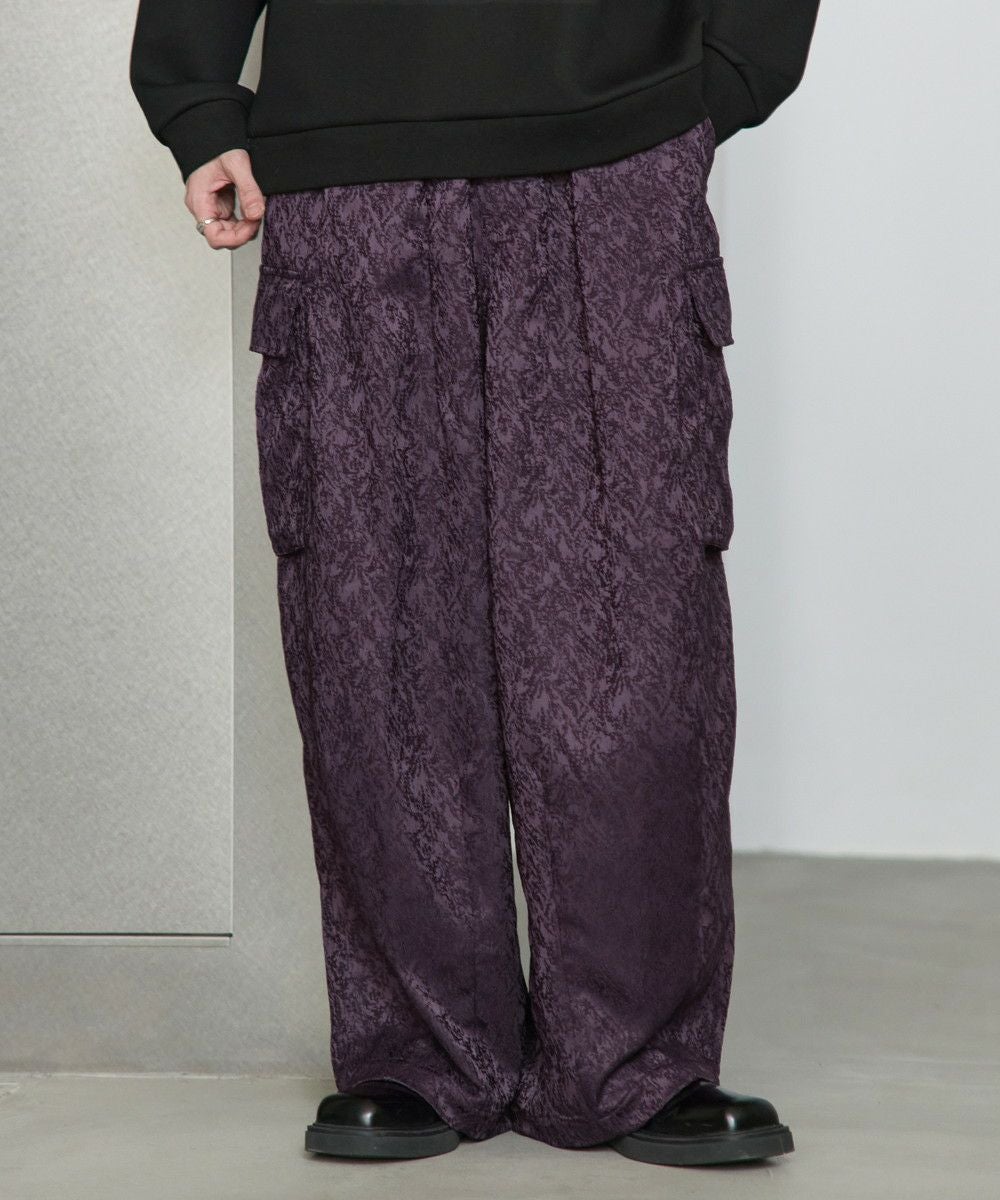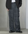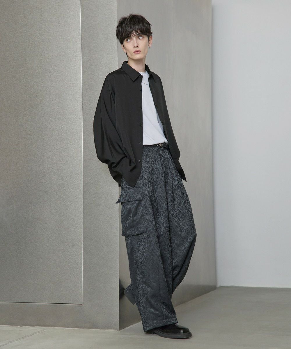 今シーズン注目の総柄ジャガードを使用したカーゴパンツ。立体的なシルエットと大きなカーゴポケットが抜け感をプラスしてくれます。生地の凹凸によって柄を作り出したジャガード柄は派手になりすぎず、さり気ないアクセントに。キレイめなルックスながら、ウエストの後ろはゴム入りで穿きやすさも兼ね備えています。また、ベルトループ付きでウエストまわりのアレンジがしやすいのもポイント。タックインスタイルもかっこよくキマるハイウエスト仕様なので、コーディネートの幅が広がります。
