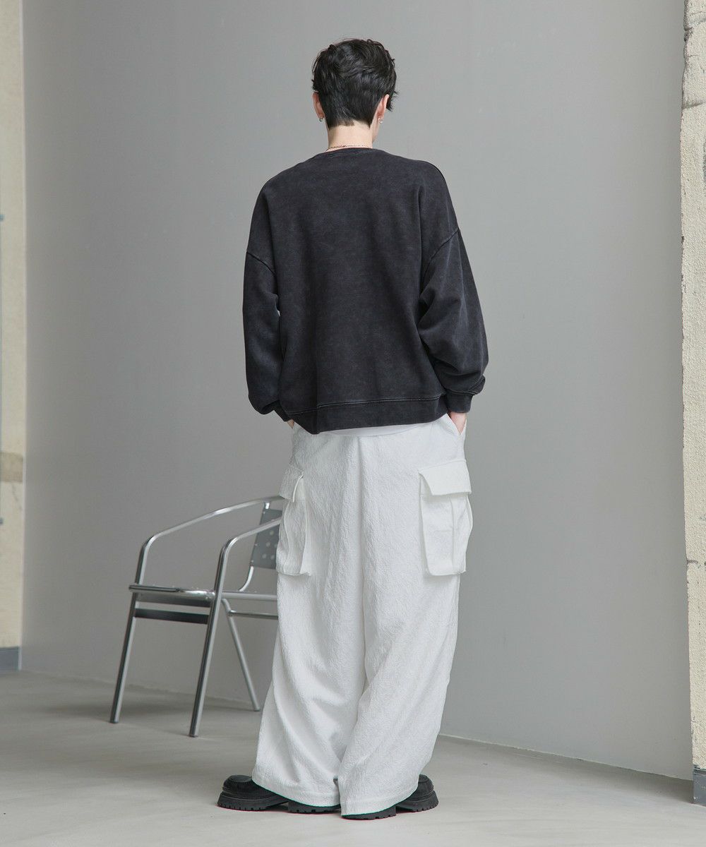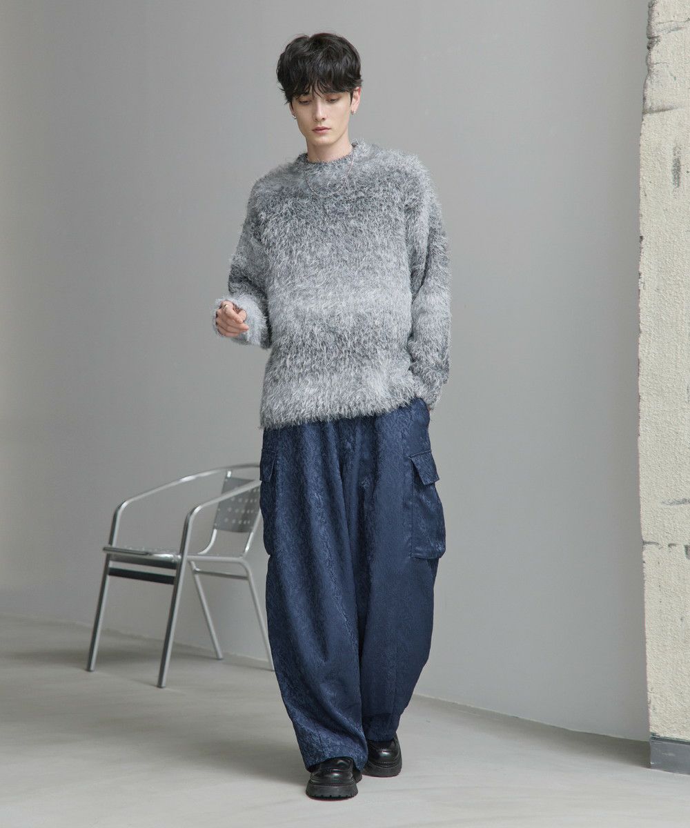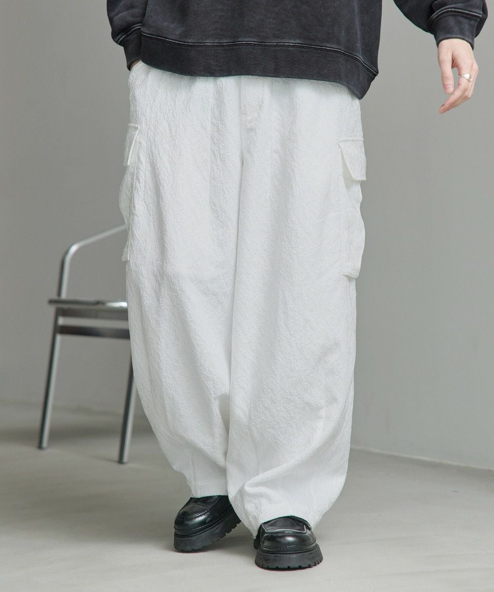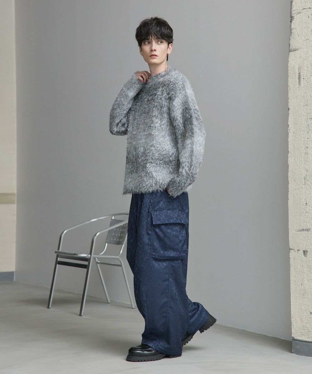 今シーズン注目の総柄ジャガードを使用したカーゴパンツ。立体的なシルエットと大きなカーゴポケットが抜け感をプラスしてくれます。生地の凹凸によって柄を作り出したジャガード柄は派手になりすぎず、さり気ないアクセントに。キレイめなルックスながら、ウエストの後ろはゴム入りで穿きやすさも兼ね備えています。また、ベルトループ付きでウエストまわりのアレンジがしやすいのもポイント。タックインスタイルもかっこよくキマるハイウエスト仕様なので、コーディネートの幅が広がります。