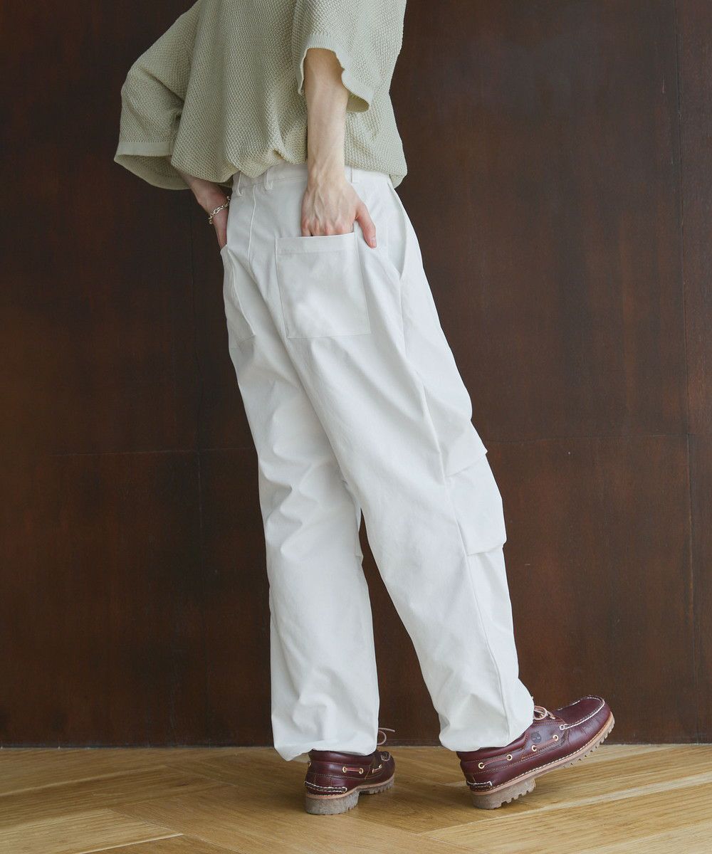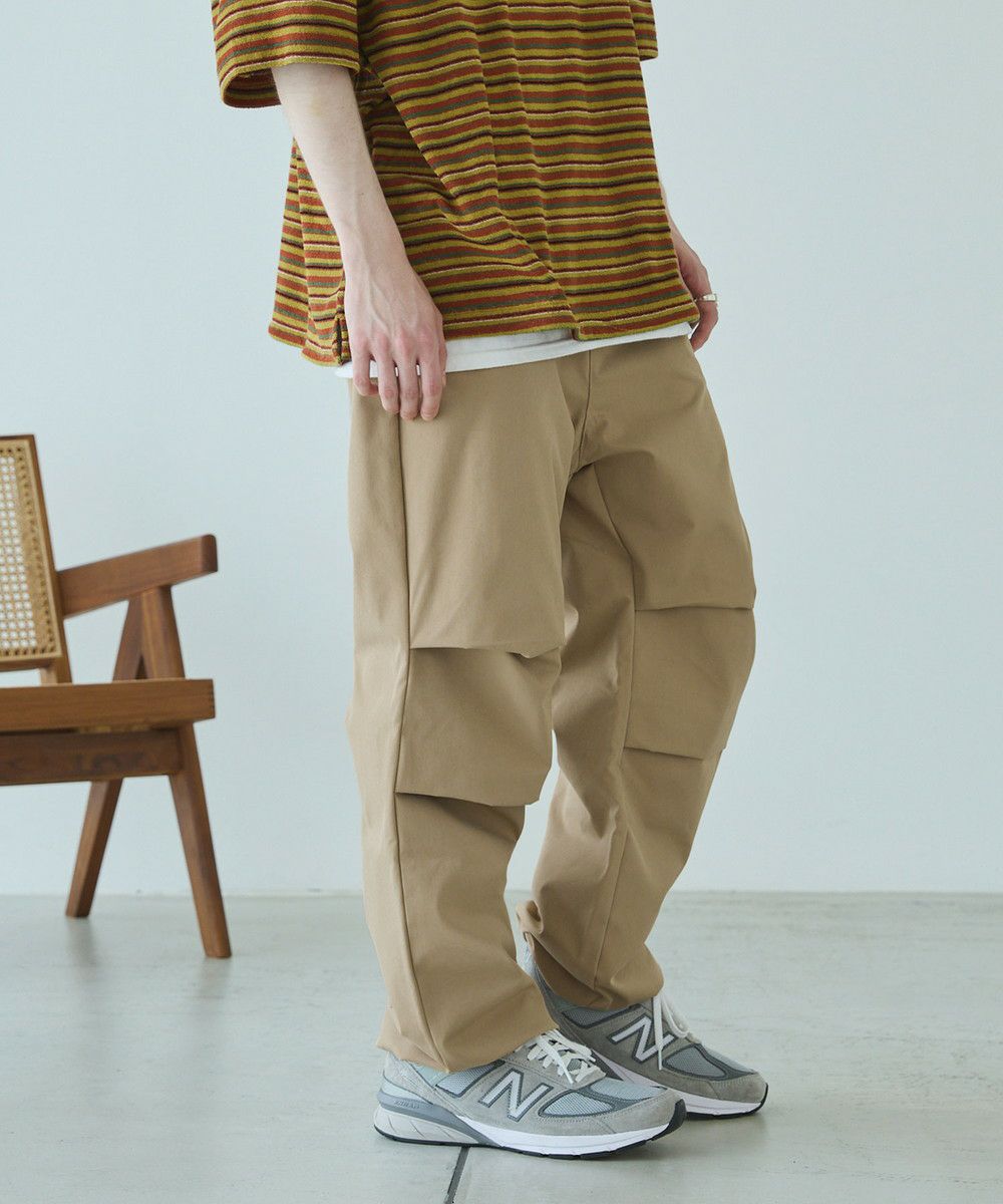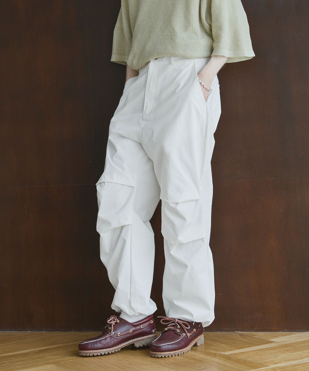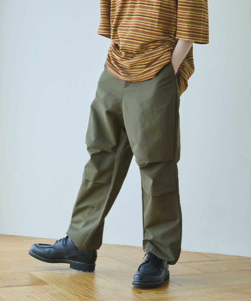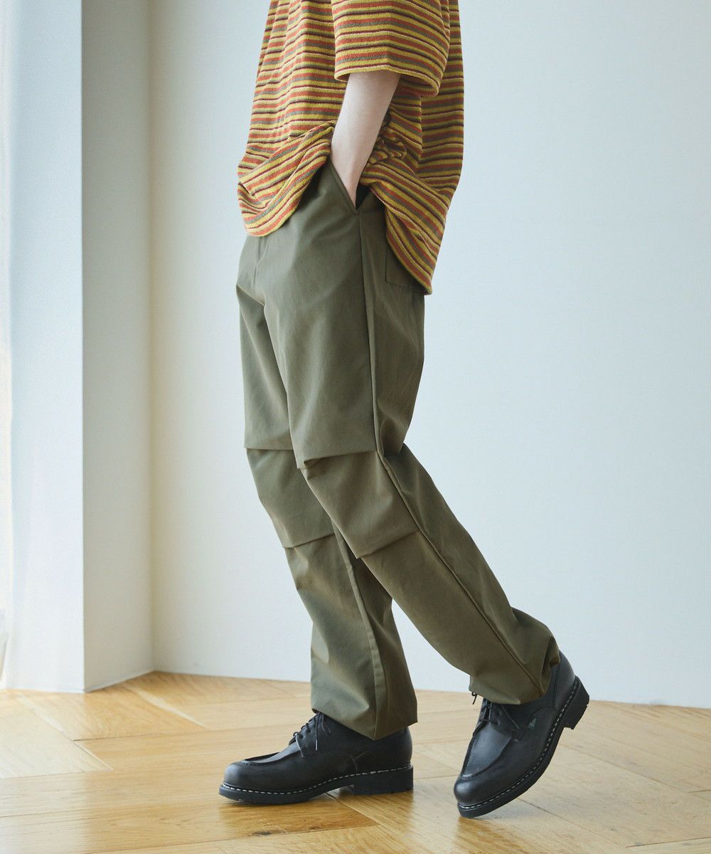 ミリタリーのオーバーパンツをモチーフにした上品なコーデにも馴染むパンツ。足元まですっきりとしたラインで穿けるので、カジュアルになり過ぎない絶妙なバランスのアイテムです。アウトドアらしい裾のドローコードや膝のアクションプリーツなどのテイストはそのままに、タウンユースでも合わせやすいようアップデートしました。ブラック、アイボリー、カーキ、ベージュのスタイリングに合わせやすいカラー展開。いつものボトムをスタイルチェンジするだけで、ひと味違った大人カジュアルを楽しめます。