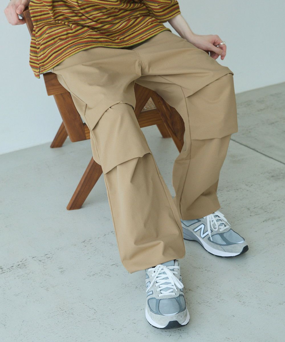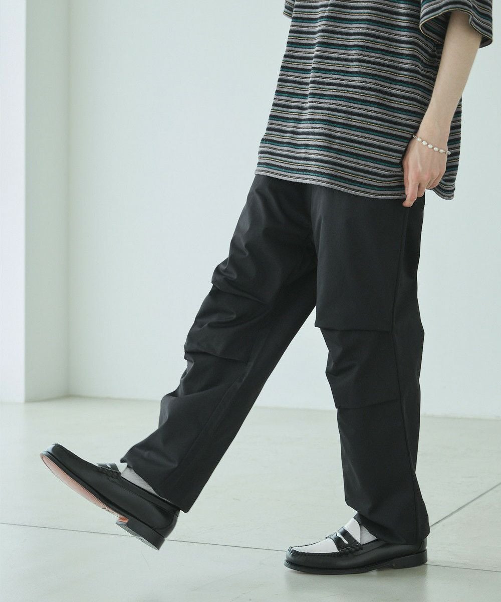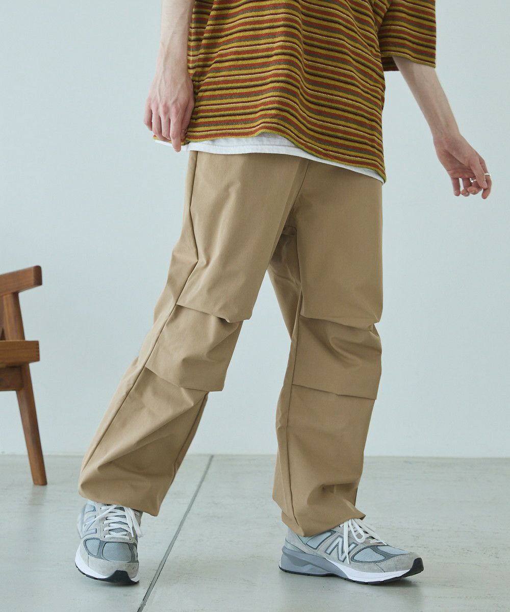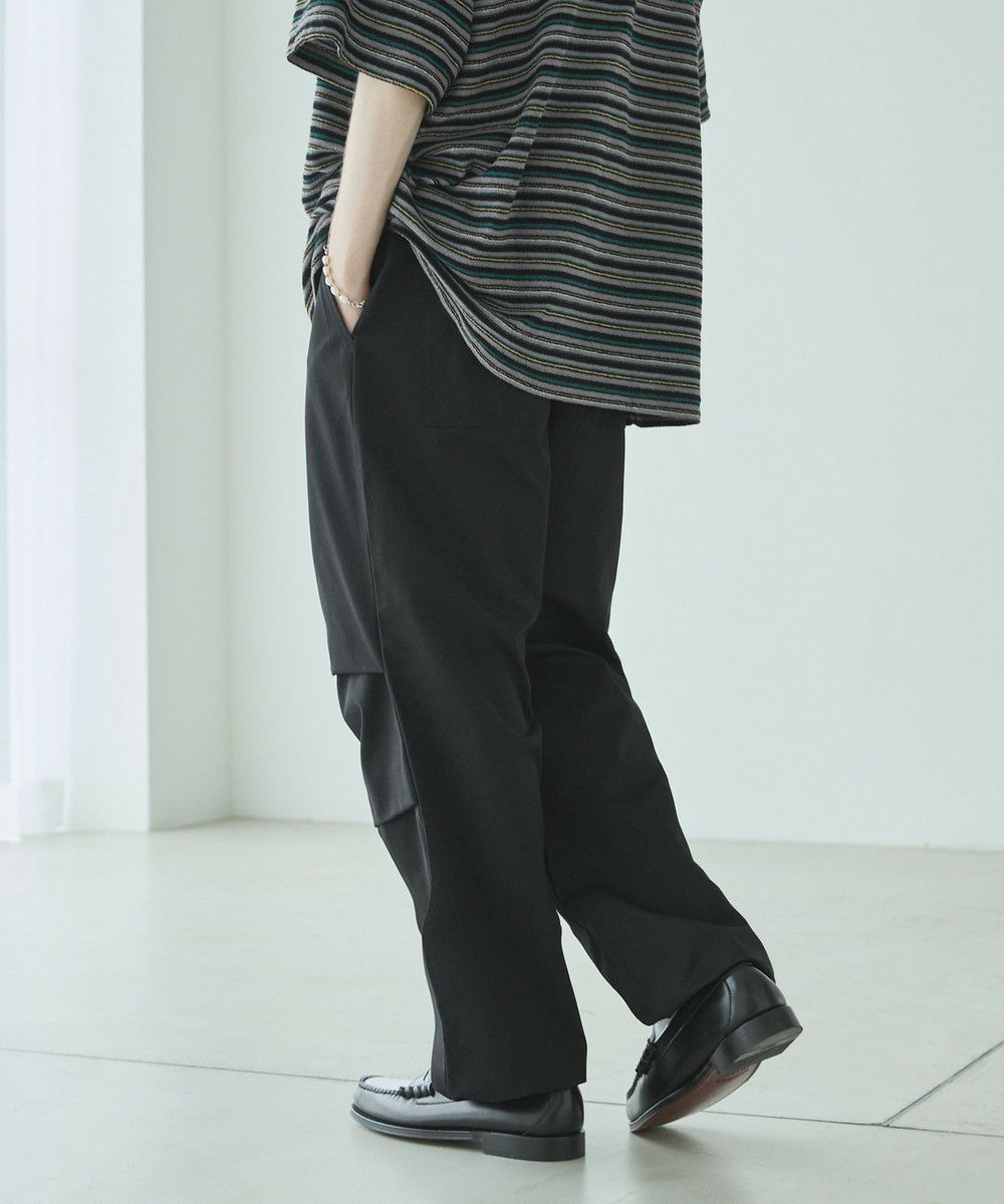 ミリタリーのオーバーパンツをモチーフにした上品なコーデにも馴染むパンツ。足元まですっきりとしたラインで穿けるので、カジュアルになり過ぎない絶妙なバランスのアイテムです。アウトドアらしい裾のドローコードや膝のアクションプリーツなどのテイストはそのままに、タウンユースでも合わせやすいようアップデートしました。ブラック、アイボリー、カーキ、ベージュのスタイリングに合わせやすいカラー展開。いつものボトムをスタイルチェンジするだけで、ひと味違った大人カジュアルを楽しめます。