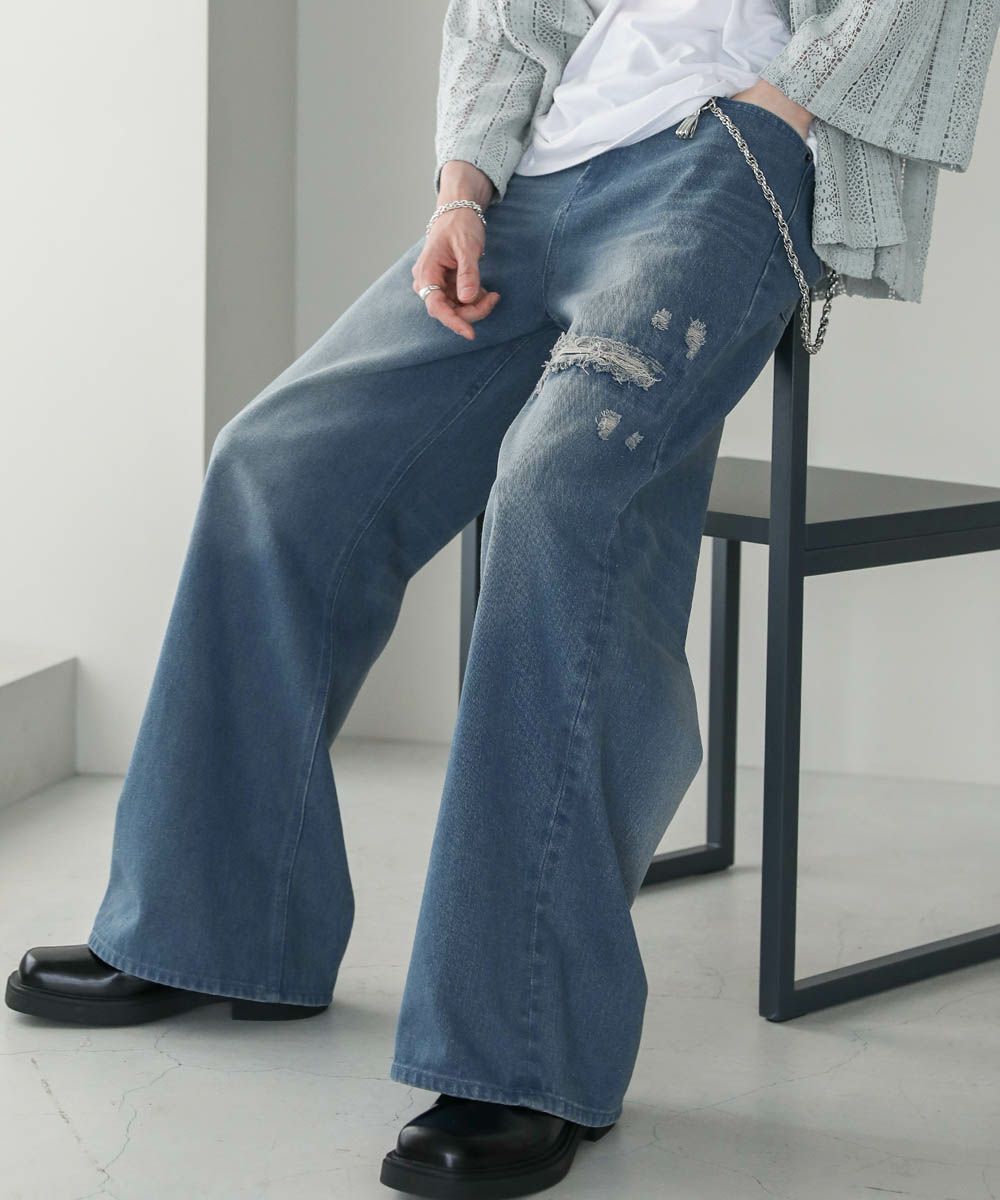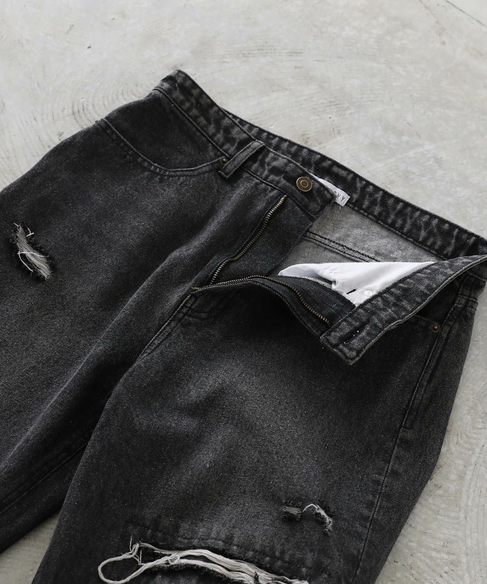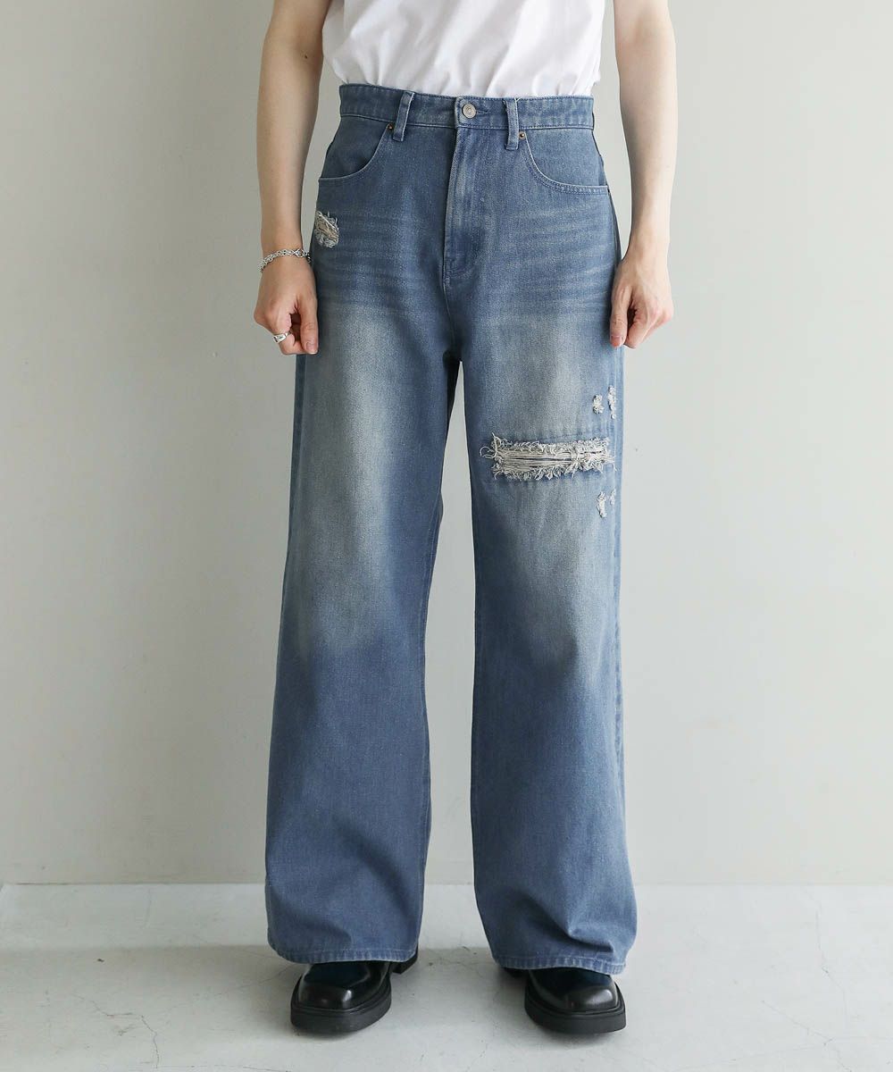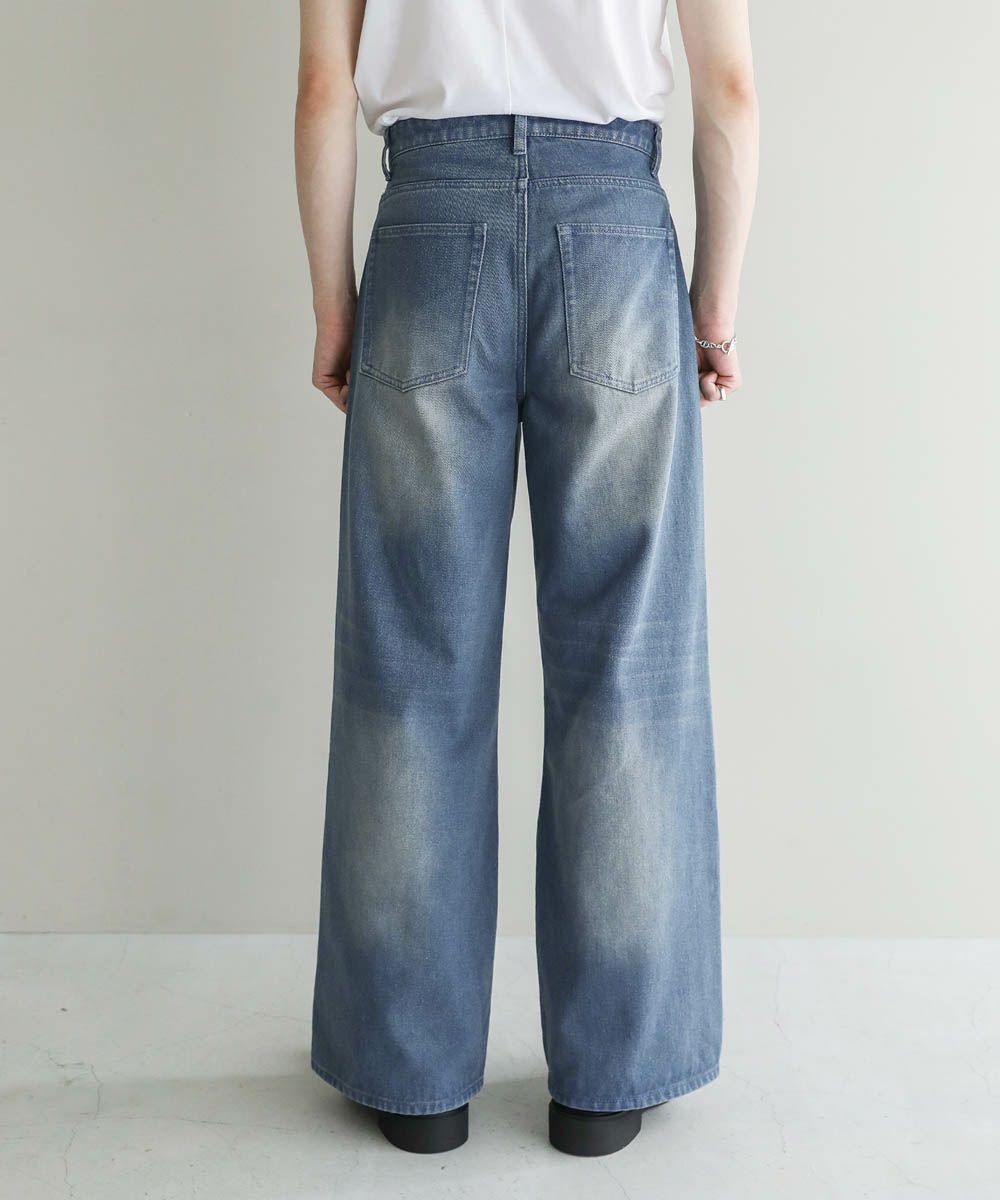 美シルエットのワイドバギーダメージデニム。ストン落ちるワイドストレートのシルエットとダメージ加工がこなれた雰囲気を演出します。アクセントになるダメージ部分は肌が見えないようになっており、季節を問わず活躍するアイテム。生地には12.3ozデニムを使用。程よい厚みでシルエットを綺麗に保ちつつも、固すぎず楽に穿いていただけます。またジップは信頼のおけるYKKジップを採用し、ディティールにもこだわりのある1本。