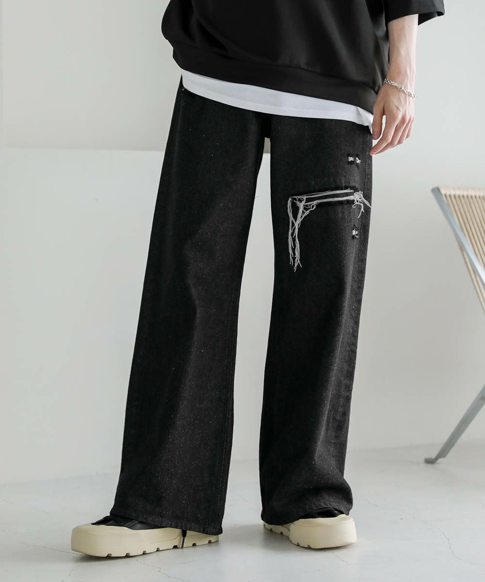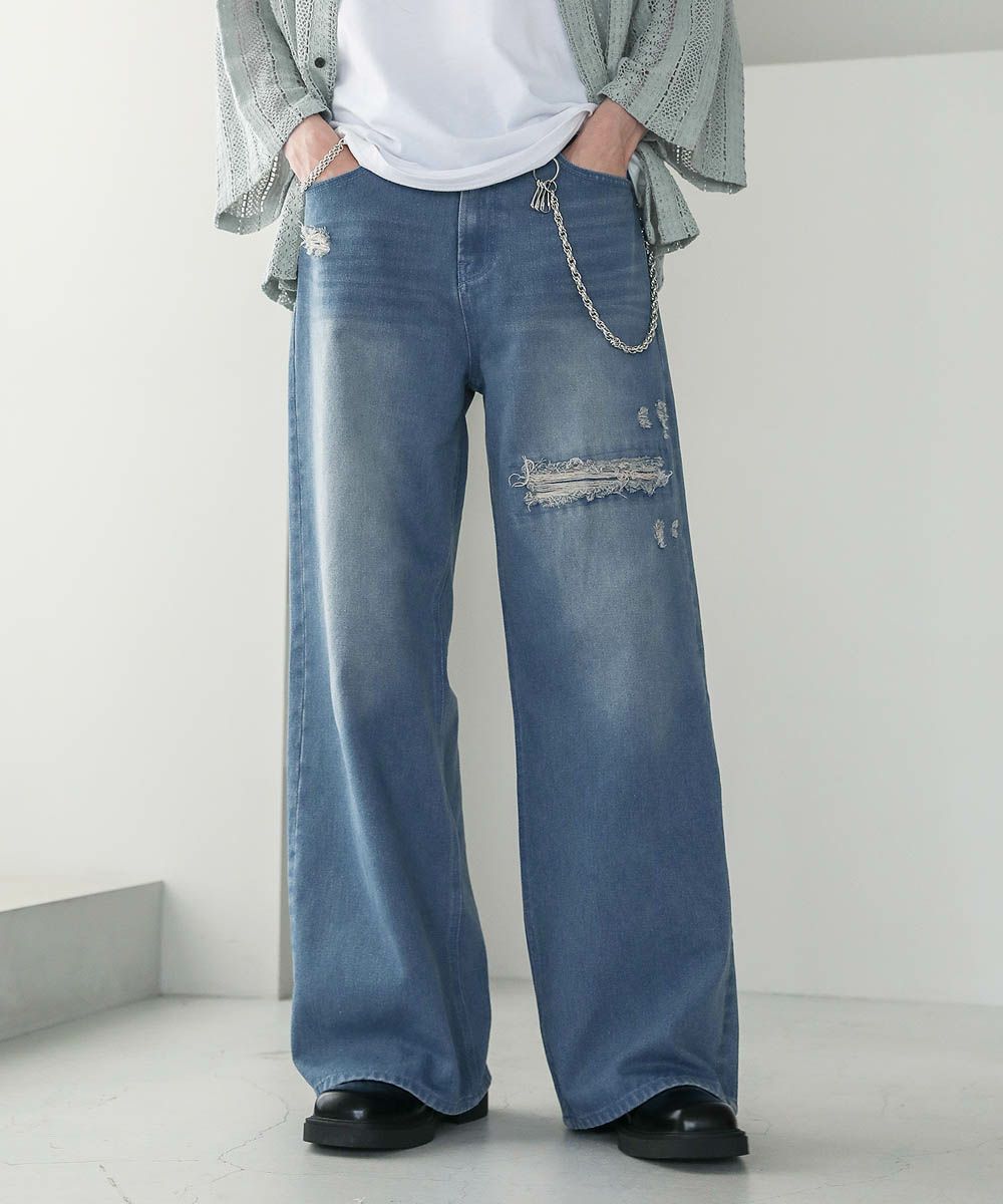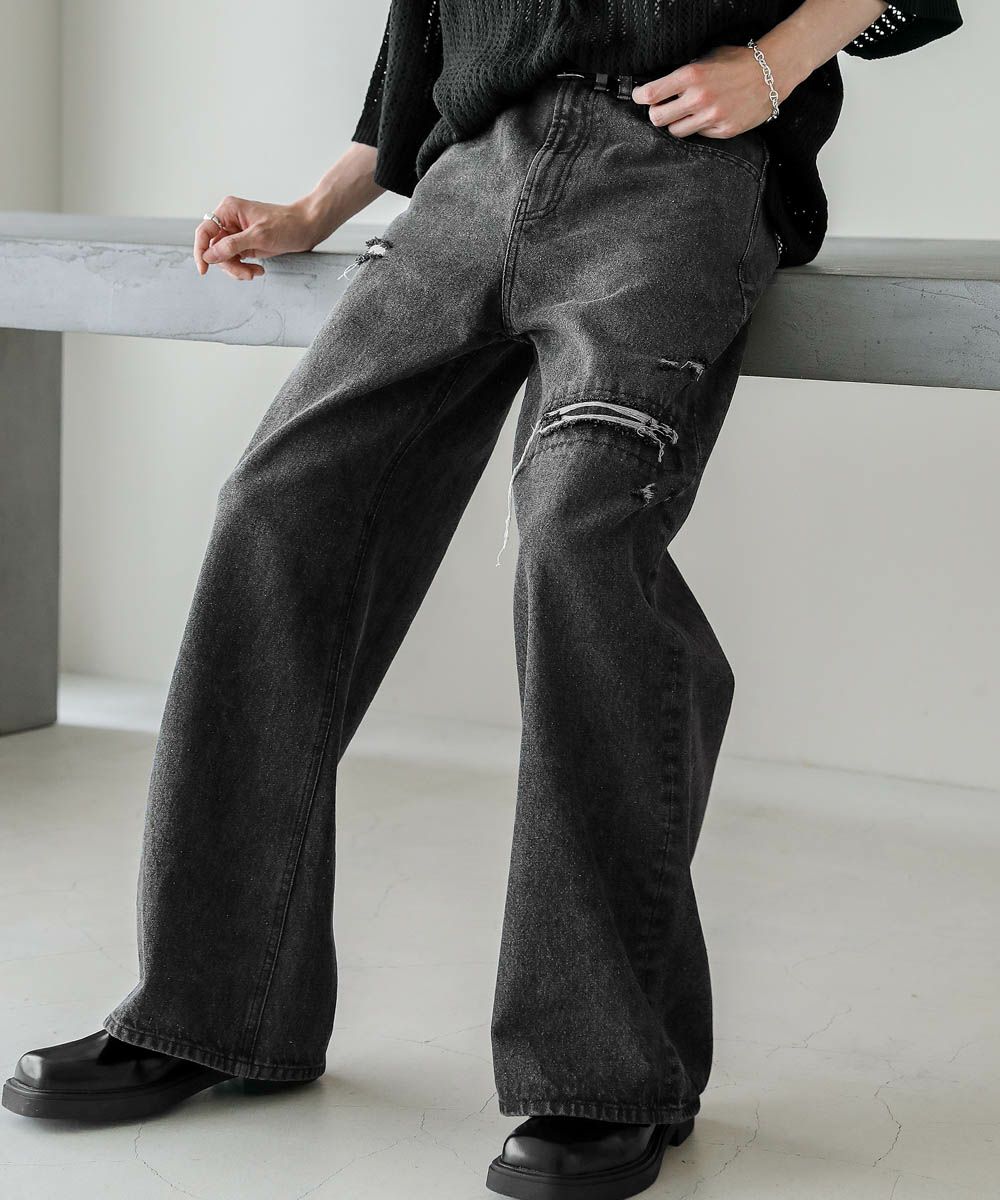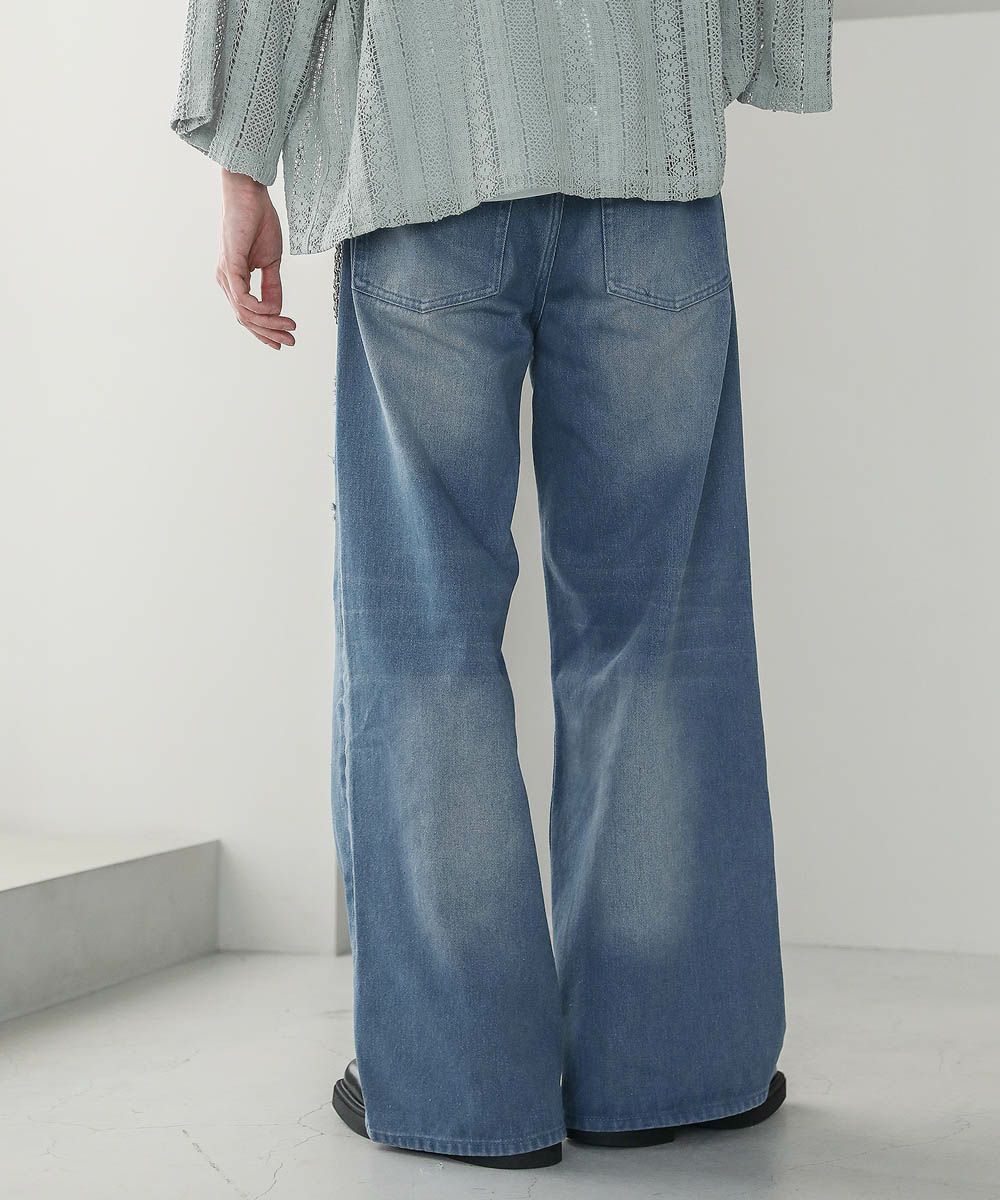 美シルエットのワイドバギーダメージデニム。ストン落ちるワイドストレートのシルエットとダメージ加工がこなれた雰囲気を演出します。アクセントになるダメージ部分は肌が見えないようになっており、季節を問わず活躍するアイテム。生地には12.3ozデニムを使用。程よい厚みでシルエットを綺麗に保ちつつも、固すぎず楽に穿いていただけます。またジップは信頼のおけるYKKジップを採用し、ディティールにもこだわりのある1本。