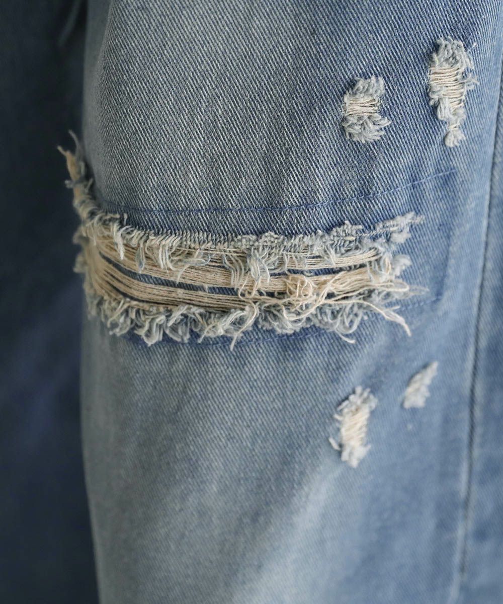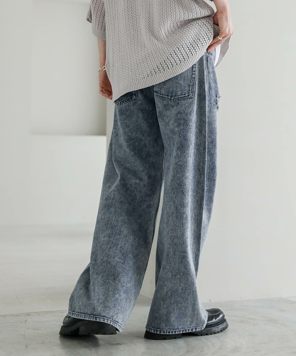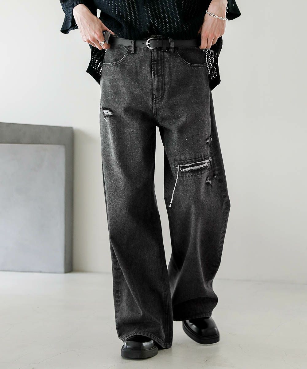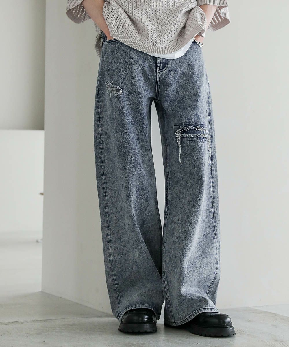 美シルエットのワイドバギーダメージデニム。ストン落ちるワイドストレートのシルエットとダメージ加工がこなれた雰囲気を演出します。アクセントになるダメージ部分は肌が見えないようになっており、季節を問わず活躍するアイテム。生地には12.3ozデニムを使用。程よい厚みでシルエットを綺麗に保ちつつも、固すぎず楽に穿いていただけます。またジップは信頼のおけるYKKジップを採用し、ディティールにもこだわりのある1本。