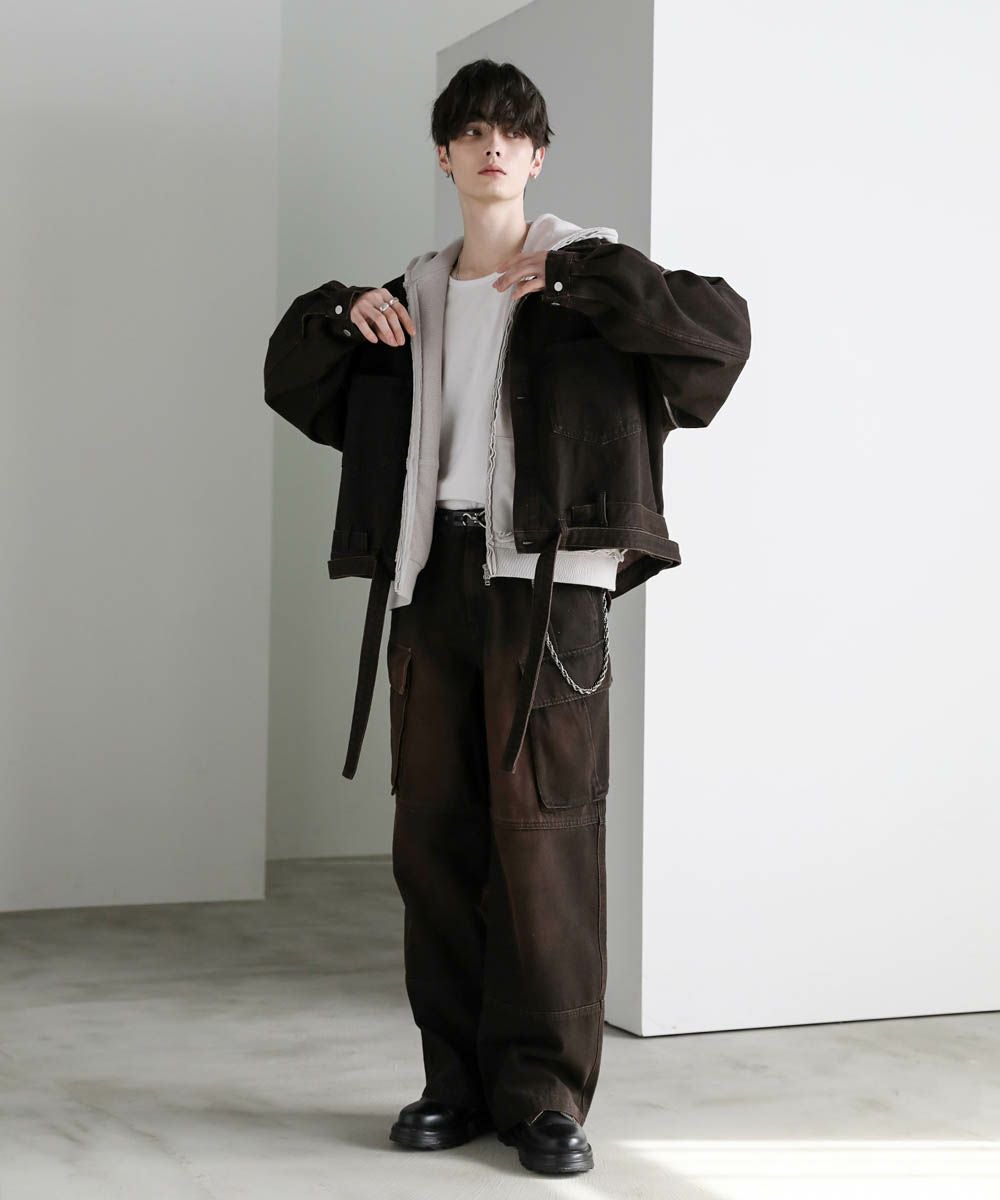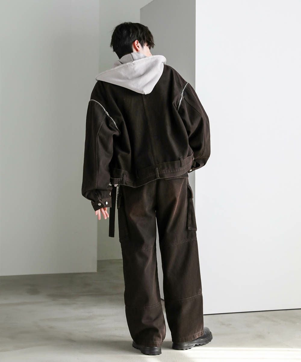 同生地のデニムブルゾンと合わせた、セットアップの着こなしが可能。セットで着用することで雰囲気抜群のスタイルに。加工感やティディールがアクセントになり、カットソーやパーカーなどシンプルなトップスと合わせるだけでもコーディネートが完成します。