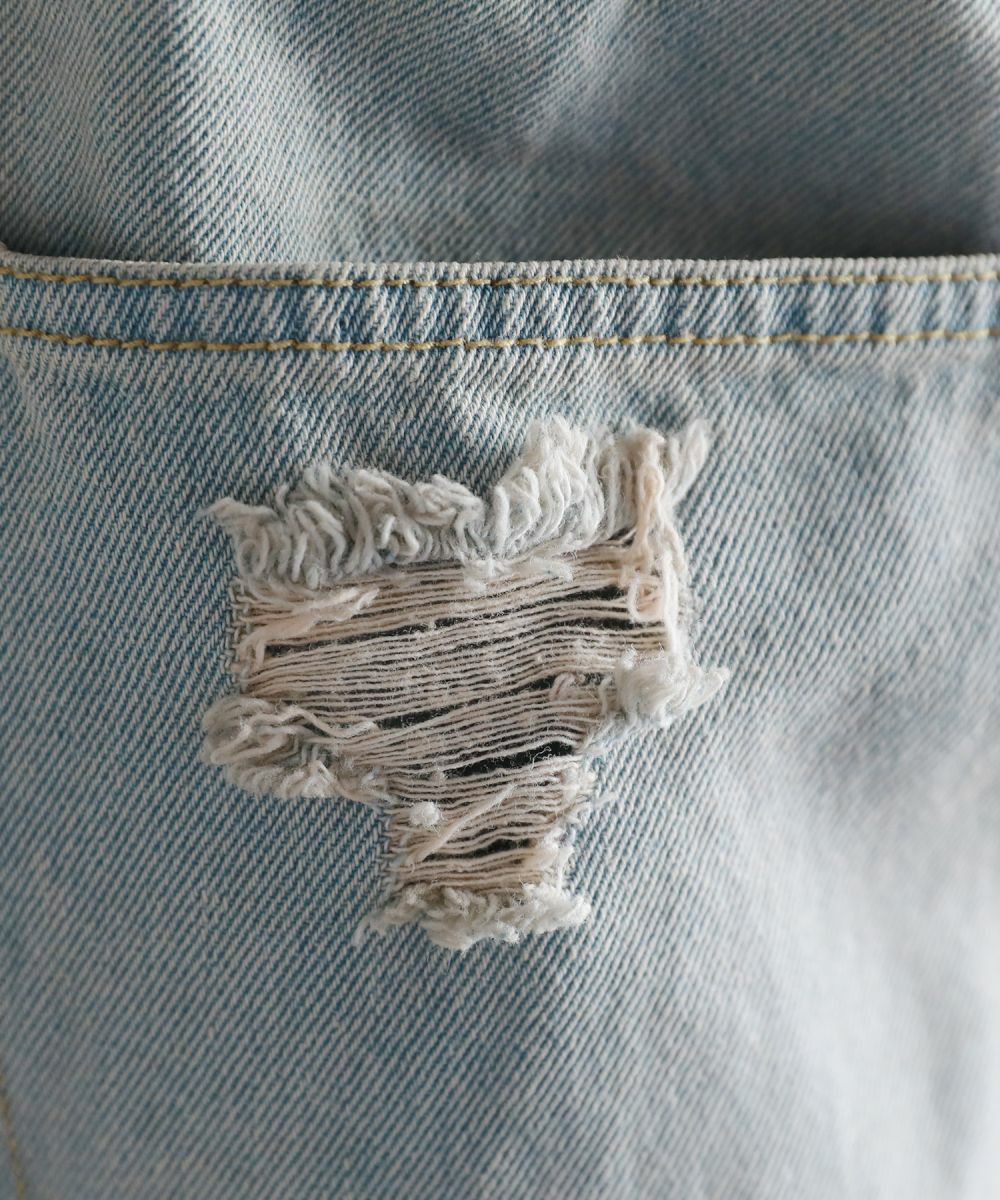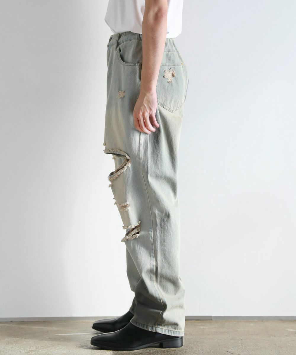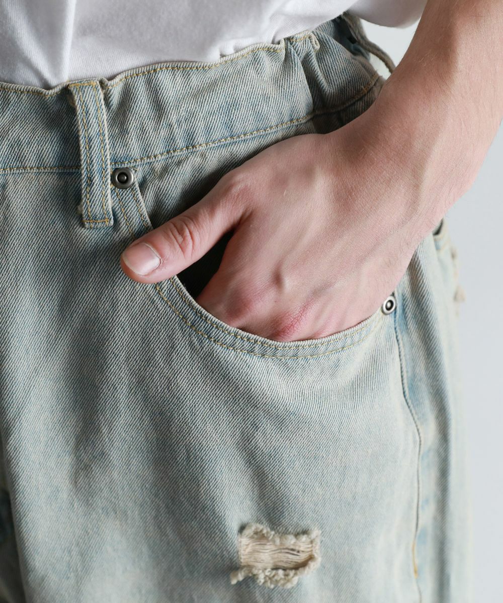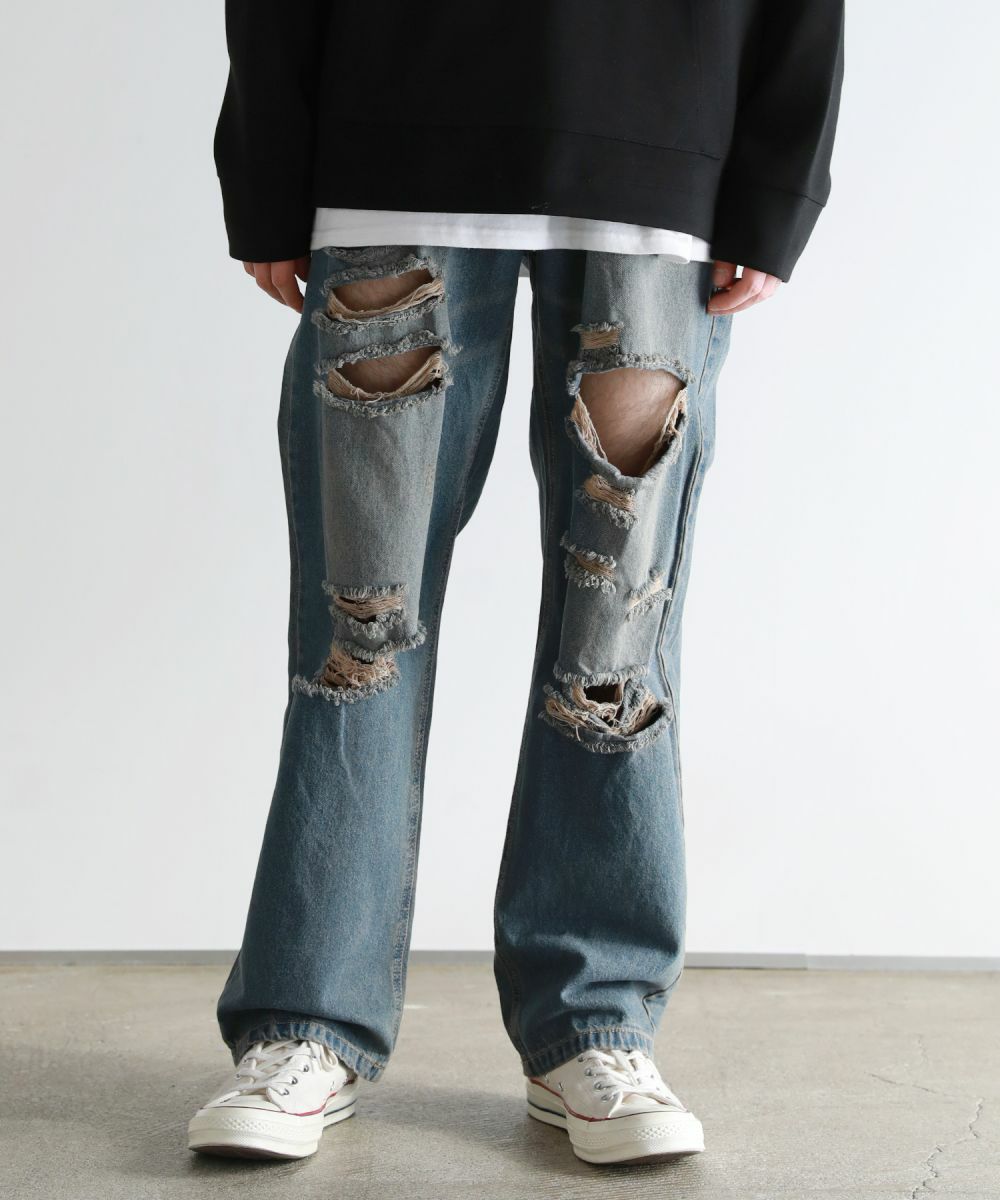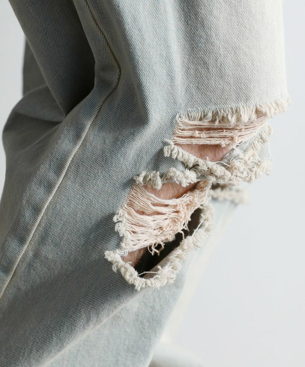 ヴィンテージ感のある風合いと、膝から太腿にかけてダメージ加工を大きく施した他にはない1本。デザイン性がありながらも、ダメージデニム初心者でもチャレンジしやすいシルエットや色合いで仕上げました。またワイド過ぎないストレートシルエットなので、足をまっすぐにすらっと魅せてくれます。ウエスト部分は後ろ部分がゴム、また紐で調節できるのでベルト要らずで楽に着用が可能です。