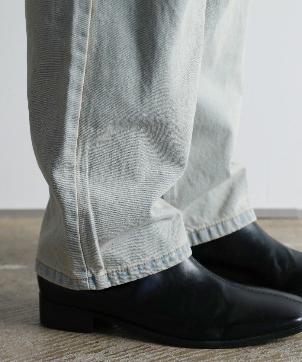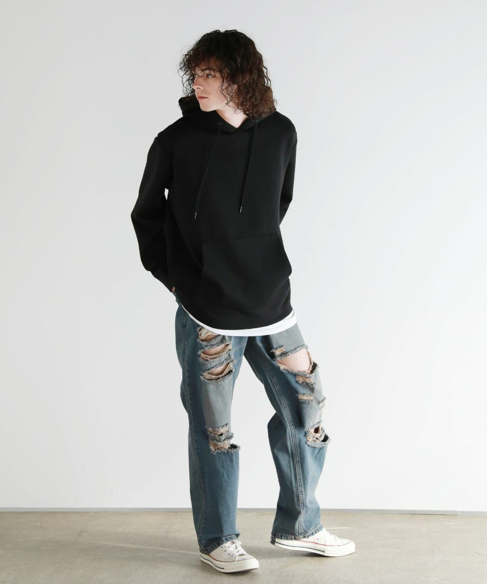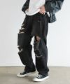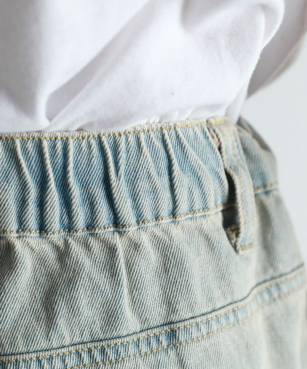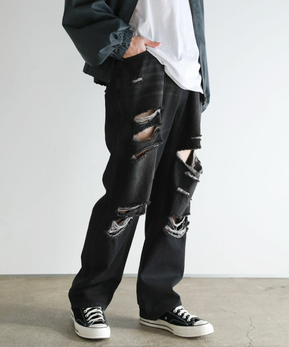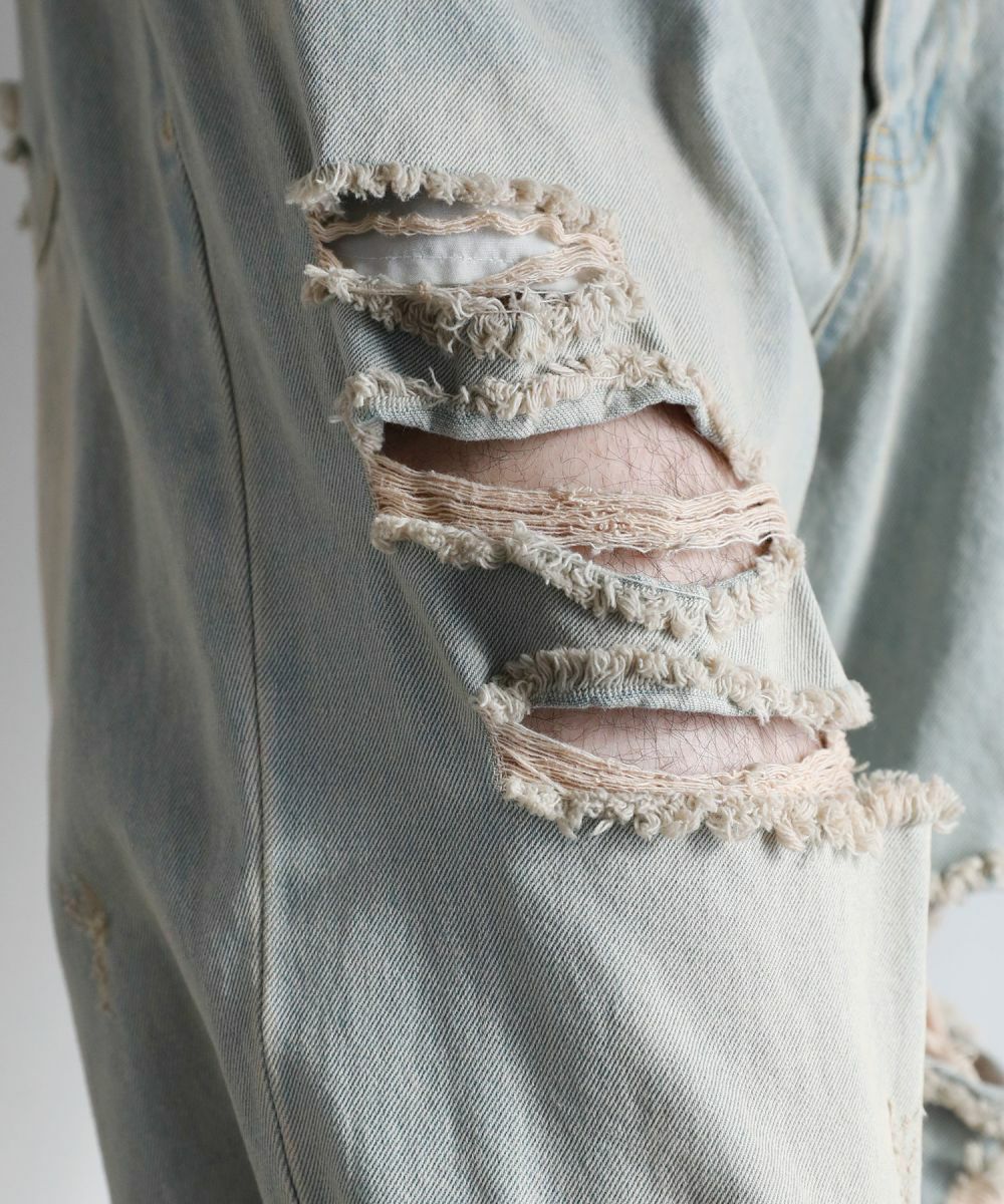 ヴィンテージ感のある風合いと、膝から太腿にかけてダメージ加工を大きく施した他にはない1本。デザイン性がありながらも、ダメージデニム初心者でもチャレンジしやすいシルエットや色合いで仕上げました。またワイド過ぎないストレートシルエットなので、足をまっすぐにすらっと魅せてくれます。ウエスト部分は後ろ部分がゴム、また紐で調節できるのでベルト要らずで楽に着用が可能です。