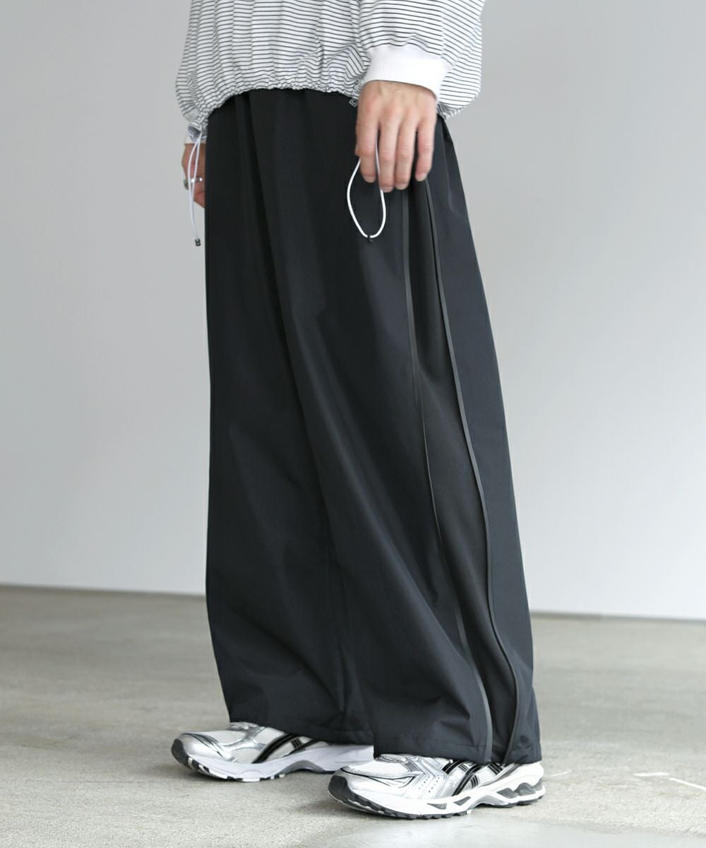 ウエストからつま先にかけて止水ジップを配したデザインが特徴のワイドストレートパンツは、サイドジップを開閉することで、シルエットやデザインに変更を付けながらご着用いただくことが可能です。