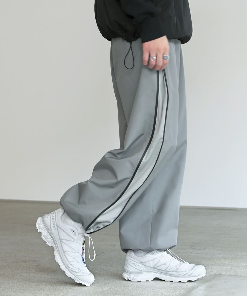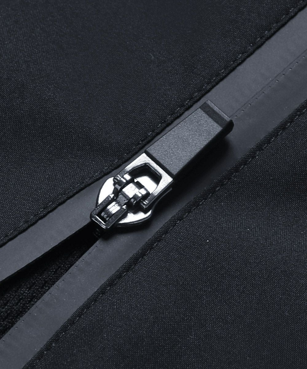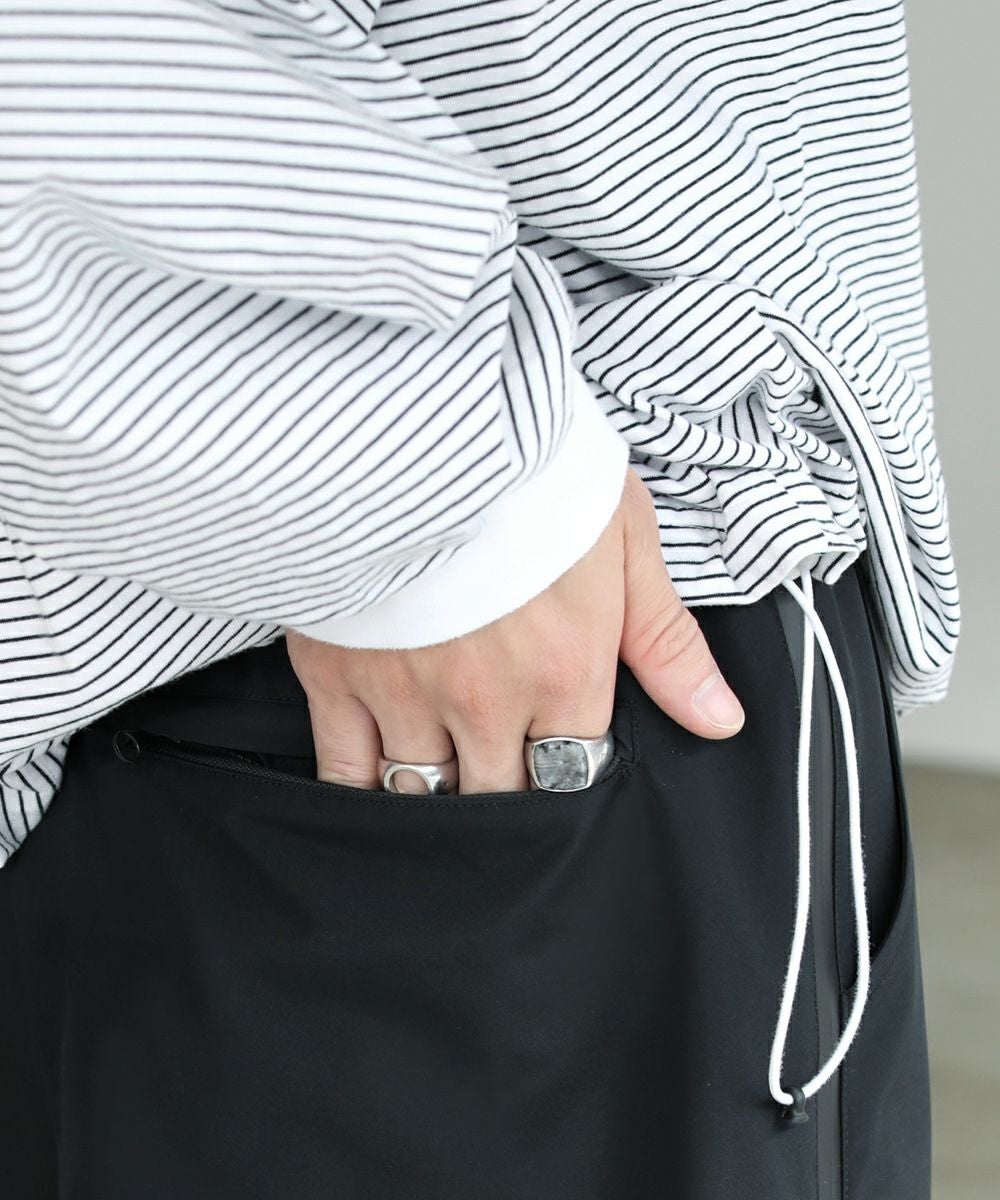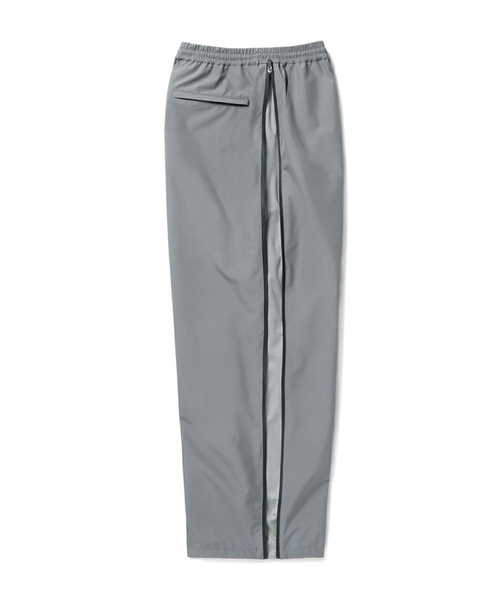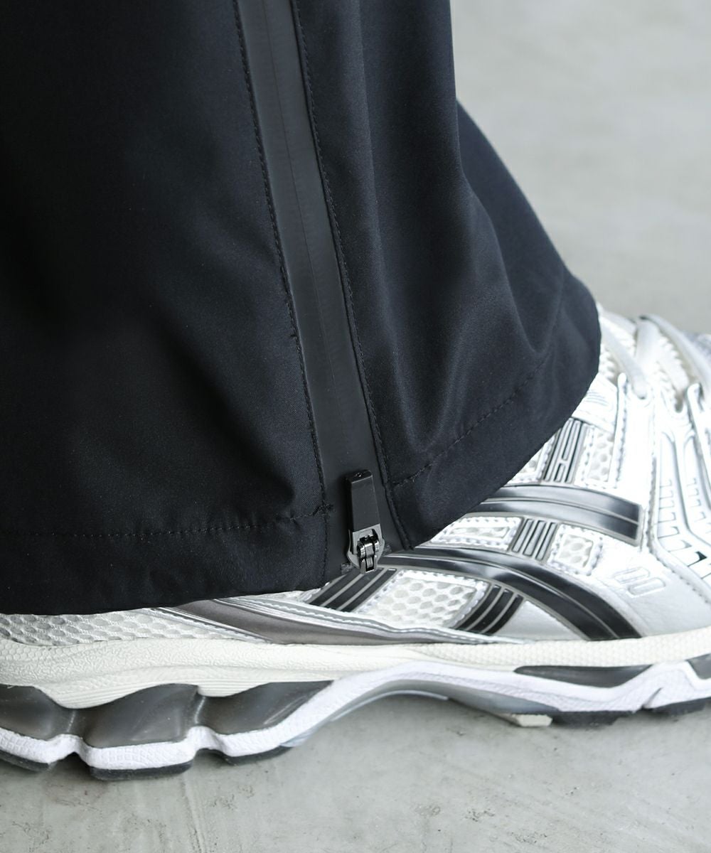 また、サイドのジップ部分にはメッシュ素材を採用しているため、サイドジップを開けることでベンチレーションとしてご活用いただくことも可能です。ウエストはゴム仕様+ウエスト紐の仕様となっており、サイズ調整を容易に行っていただくことが可能です。ポケットはフロントに2つ、バックに2つ配しており、バックポケットはジップ仕様となっております。ウエストにはアクセサリーを付けることのできるループを採用し、裾にはドローコードを採用しています。欲しい機能を全て詰め込んだ、渾身の一本をどうぞお楽しみください。