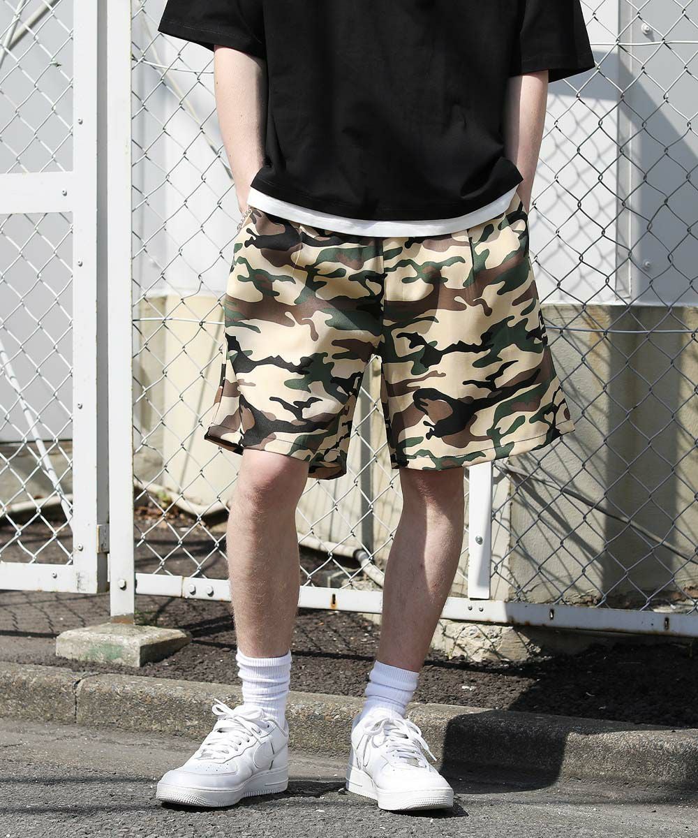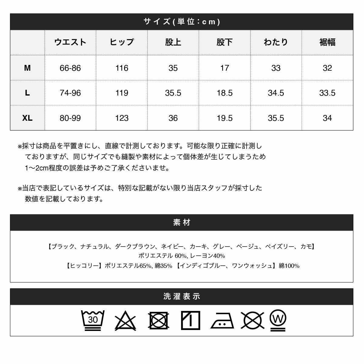無地(ブラック、グレー、ダークブラウン、ベージュ、ナチュラル、カーキ、ネイビー)とネイビー系、カモフラージュはサラリとした生地感のポリエステル・レーヨン素材。やや光沢感があり柔らかく涼しげな穿き心地です。