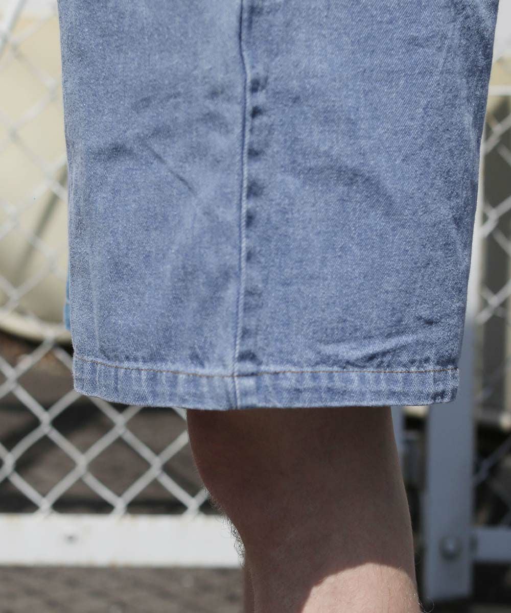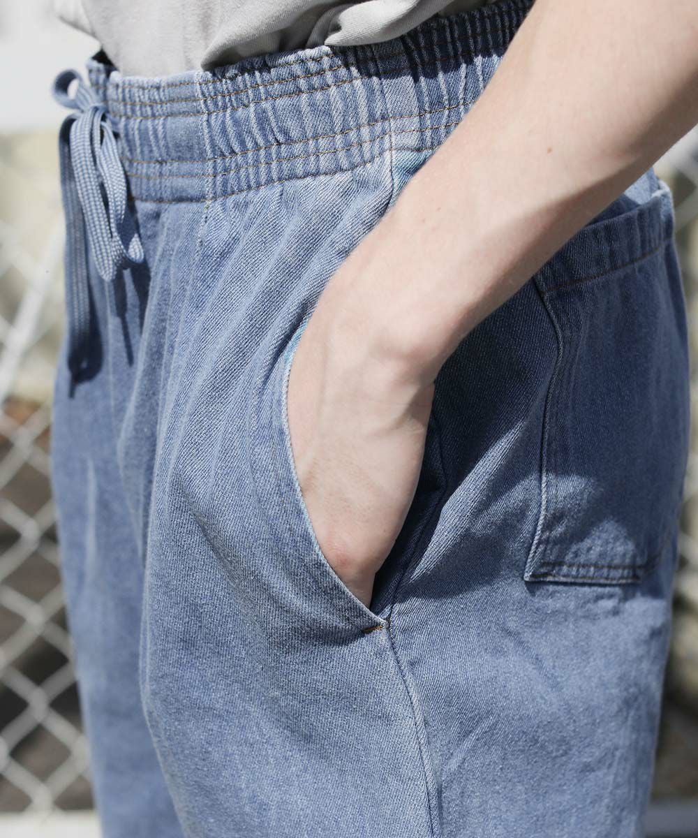 デニム(インディゴブルー、ワンウォッシュ)は綿100%素材で穿くほどに馴染む素材です。