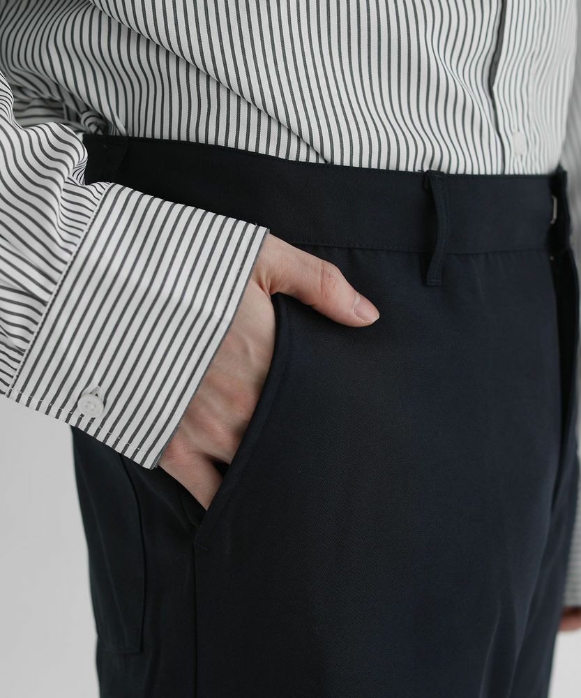 キレイめな印象を与えるセンタープレス入りのスラックスパンツ。裾に向かって窄まっていくテーパードシルエットが、美しいラインと上品な雰囲気を生み出しています。程よい光沢感を残しつつ、センタープレスが入ることでキレイめな印象をプラス。スニーカーなどと合わせたカジュアルコーデとも相性が良い、絶妙なバランスのアイテムです。