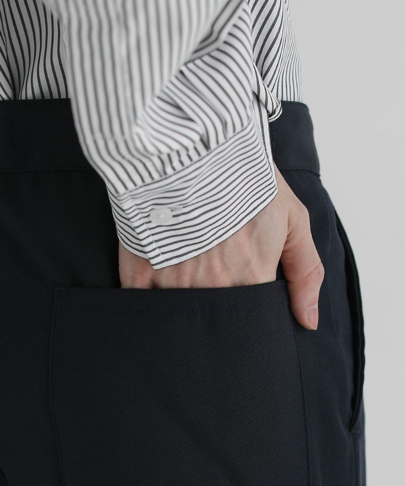 程良い光沢とハリ感のあるポリエステル素材を使用。なめらかな手触りと程よい厚みの生地感で、幅広いシーズンにお使いいただけるアイテムとなっております。