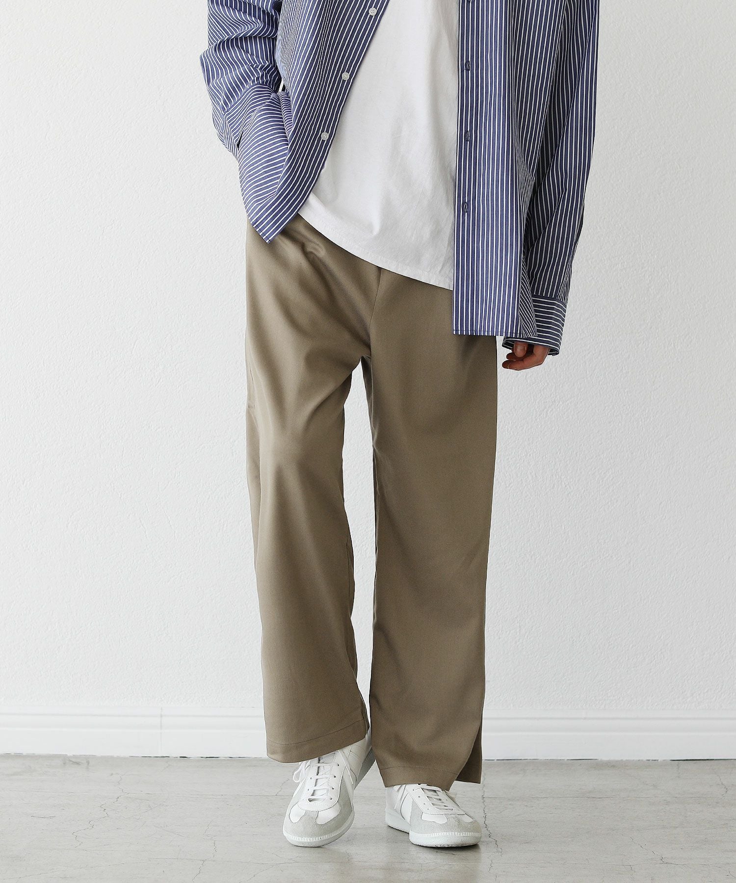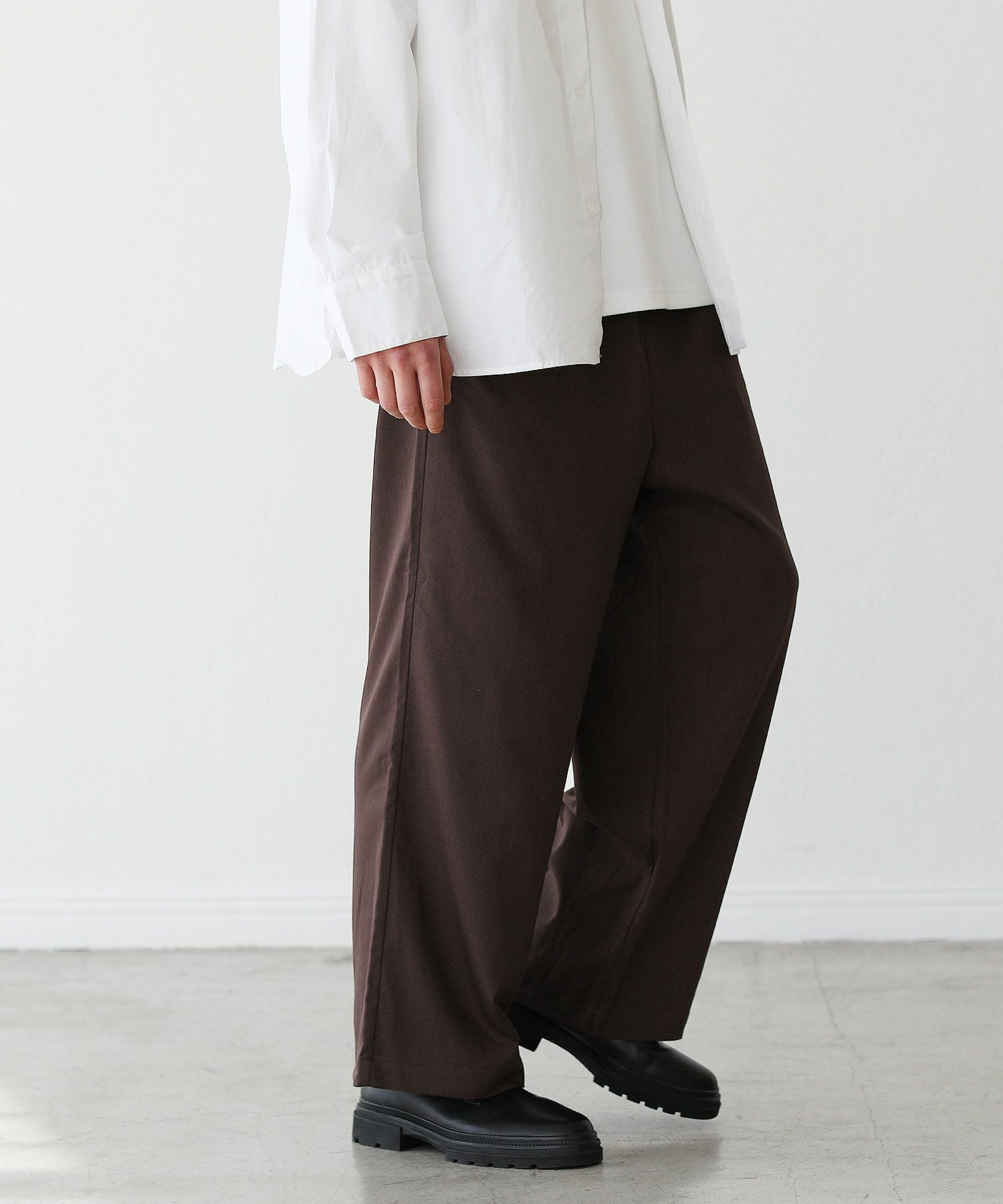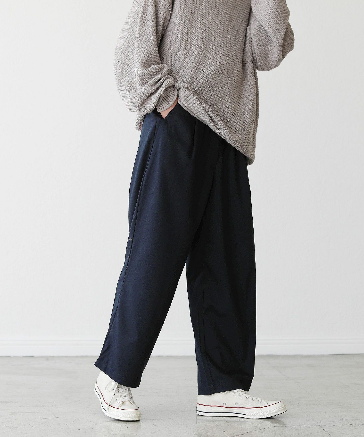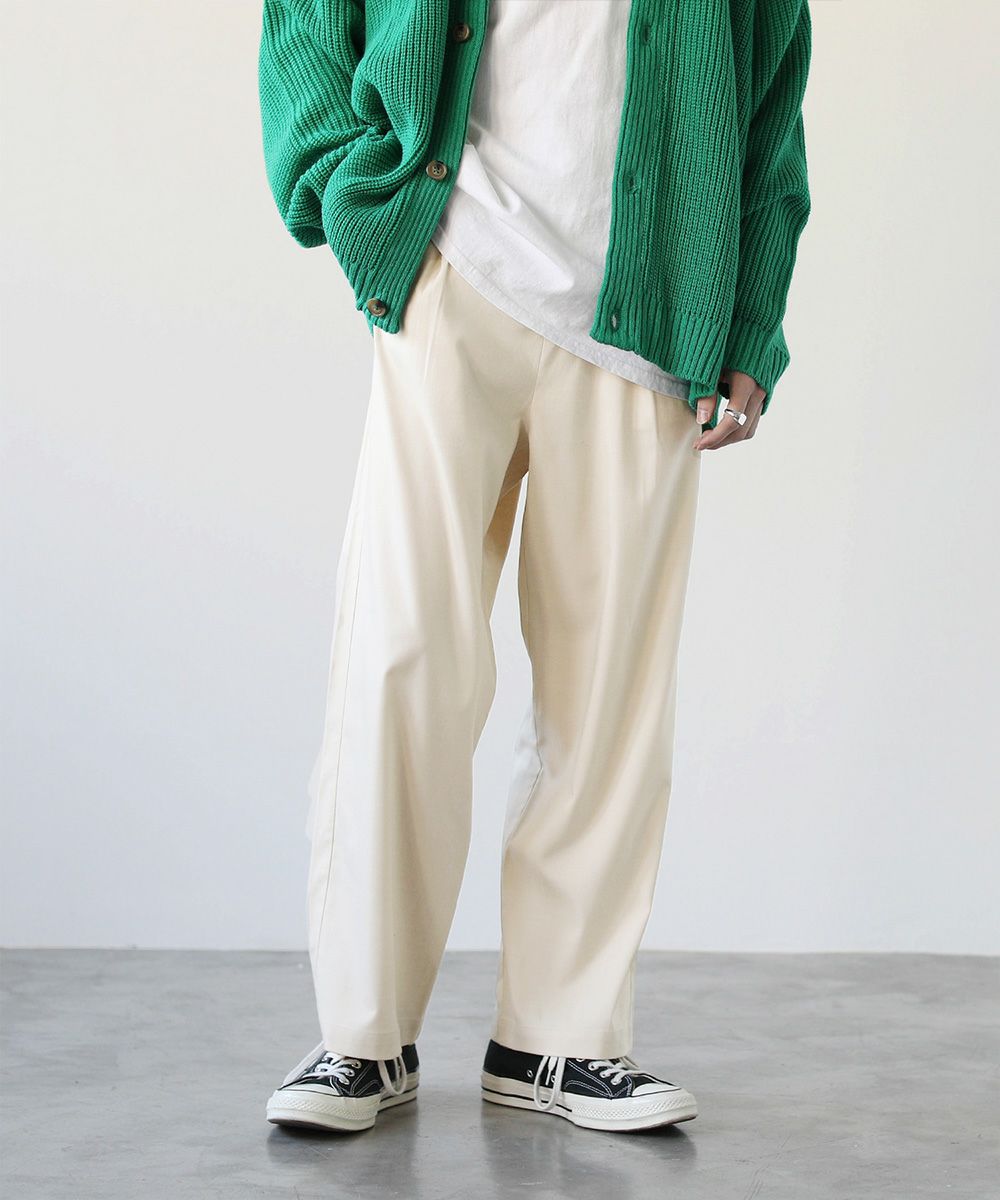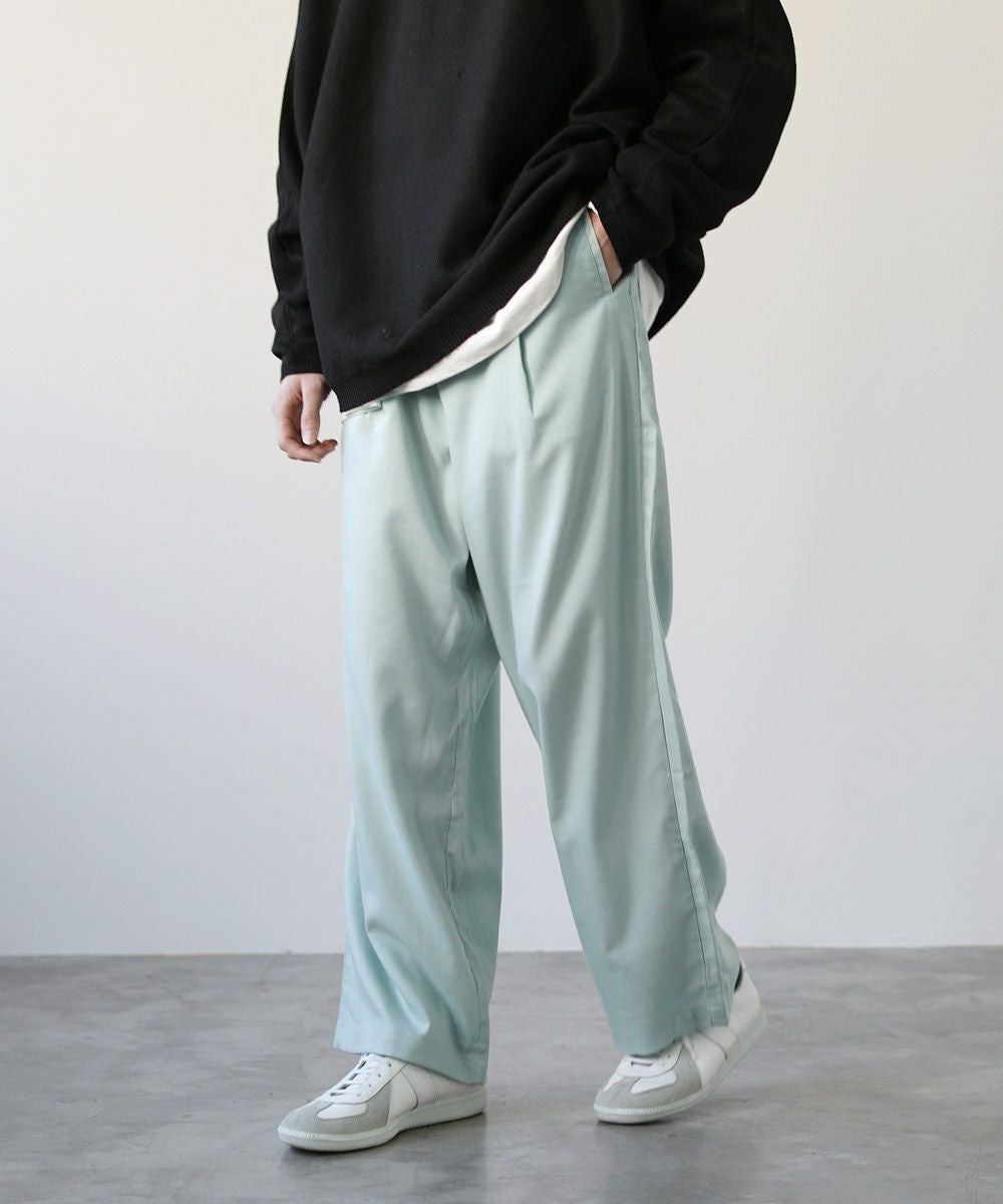キレイめスタイルをワンランク上に仕上げてくれる光沢感のあるTR素材と今年から新たに加わったデニム素材の2パターンのワイドパンツ。