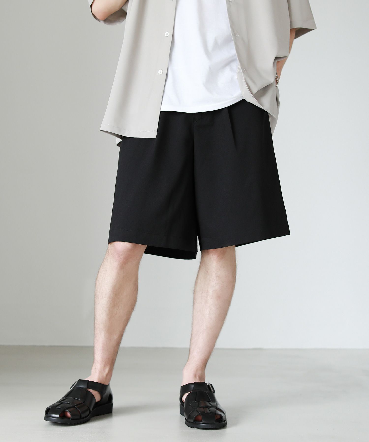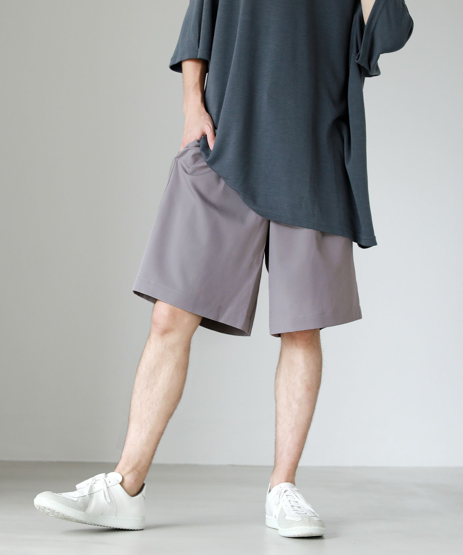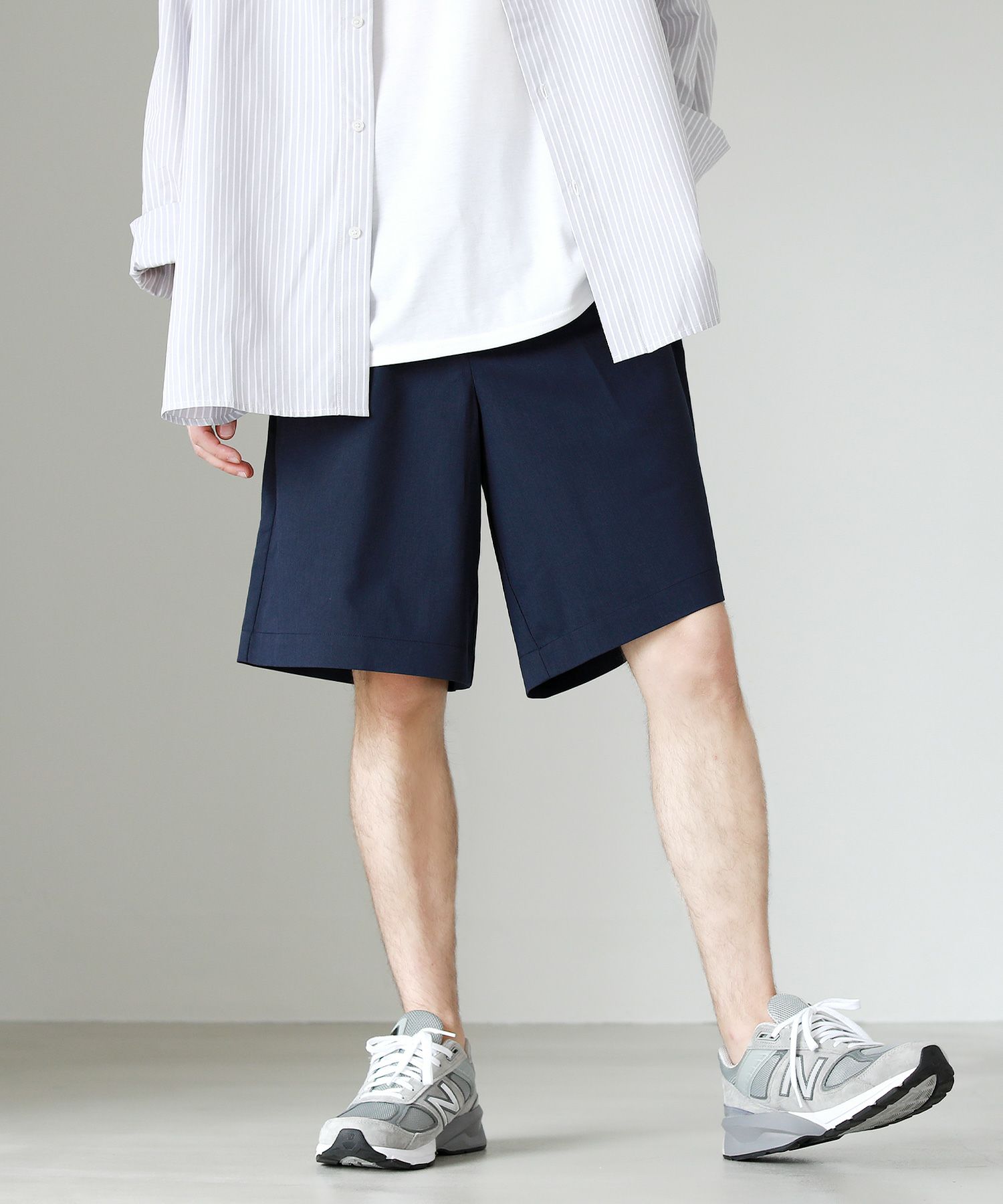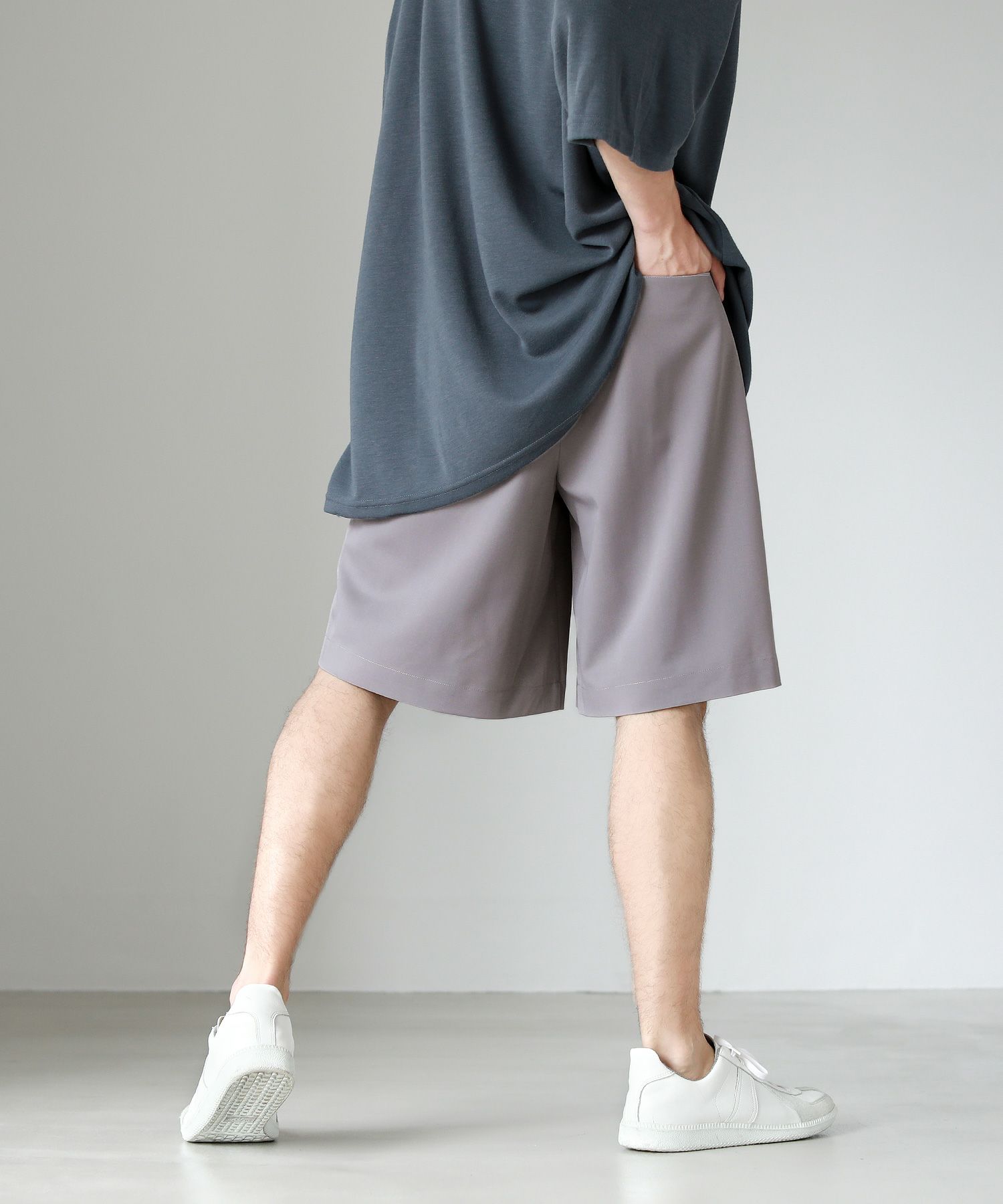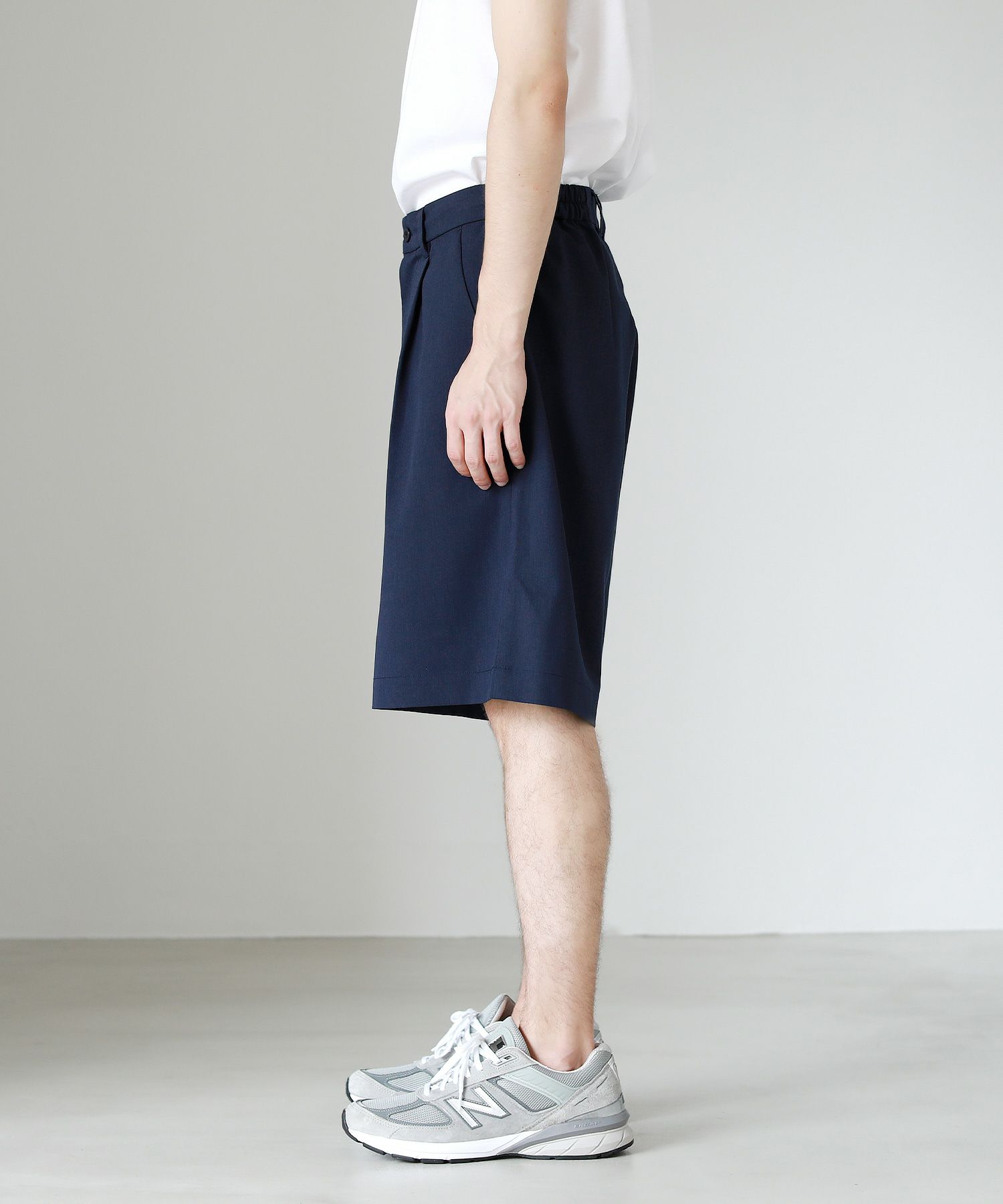 短すぎず長すぎない計算された丈感とワンタック入りの上品なデザイン。裾に向かって適度なゆとりを持たせたワイドシルエットが今の気分に合うショーツです。また滑らかな質感と艶のあるTR素材が、シックで上品な印象を着こなしにプラスしてくれます。