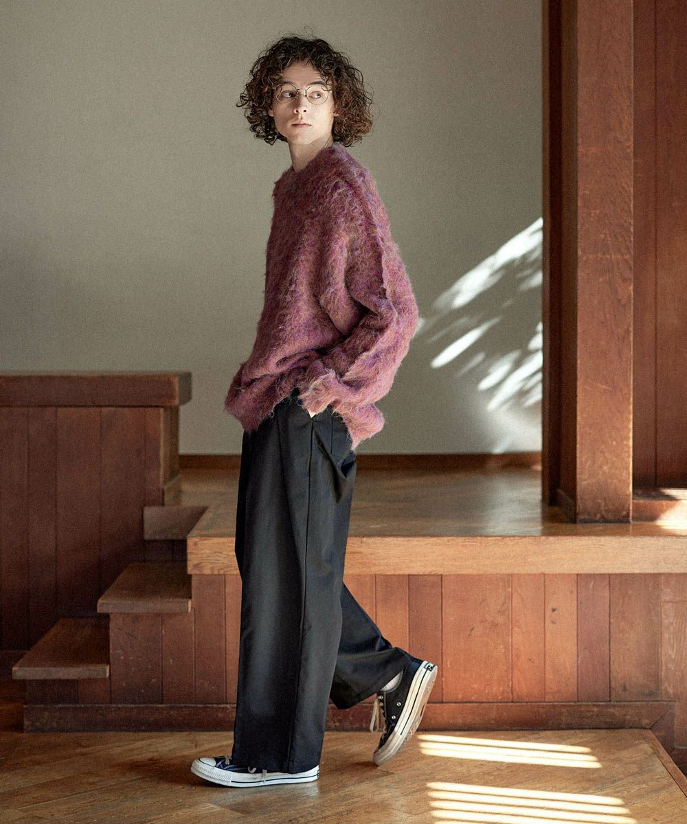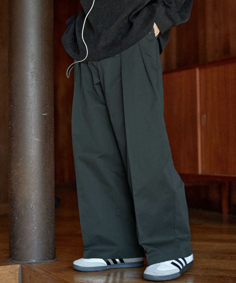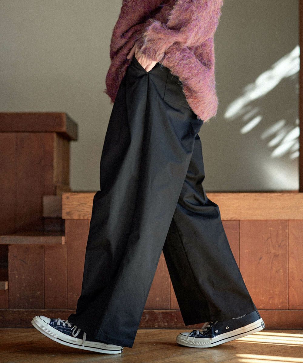 ヘビーツイル生地を使用したワイドバギーパンツ。センタープレス入りなので、カジュアルだけでなくキレイめなスタイルにもはまる1本です。ウエストはタック入りで立体感をプラスし、タックインスタイルもキレイに決まります。後ろポケットにはブランドのロゴ刺繍入りで、さりげないアクセントに。しっかりとした生地感とベーシックなデザインで、オールシーズンお使いいただけるアイテムです。