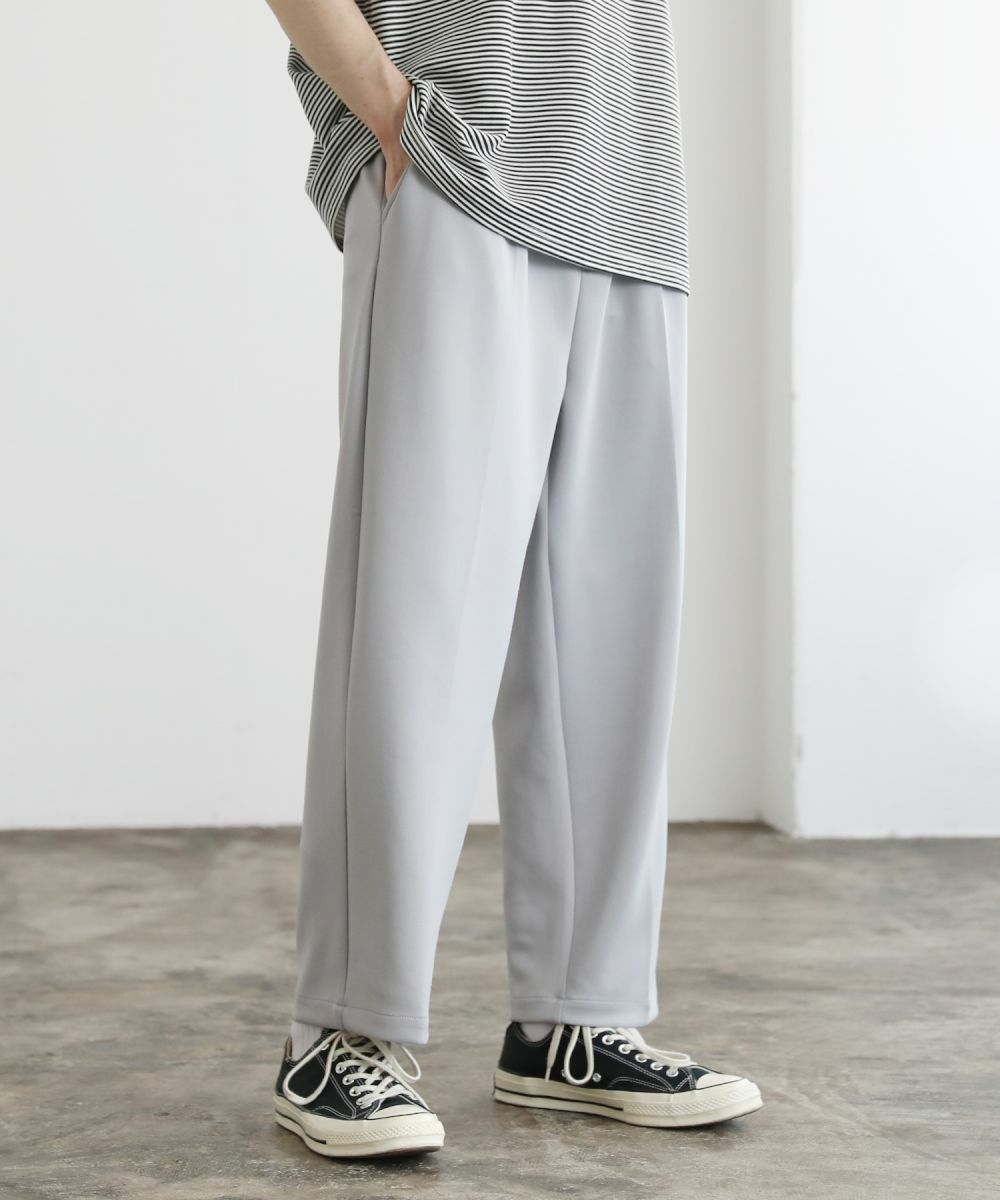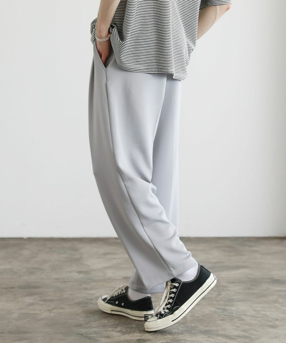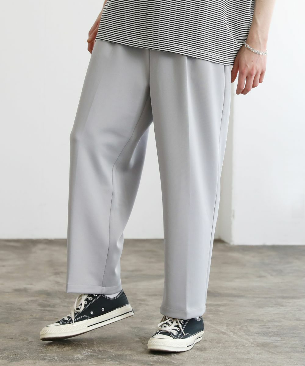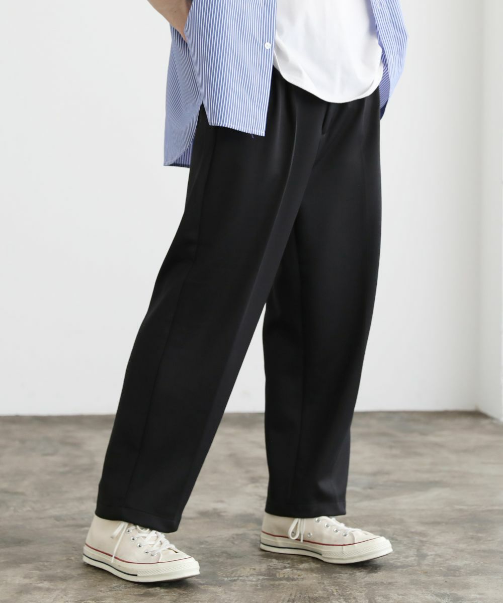 ゆったりとしたルーズシルエットが魅力のワイドスラックス。センタープレスが入っており、キレイなシルエットに仕上がっております。ウエスト後ろにゴムが入ったイージパンツ仕様。夏に嬉しいドライタッチなポンチ生地で、伸縮性に優れており楽な着心地が魅力。ほんのりと光沢感があり、シンプルなアイテムながら1枚で上品でキレイめな印象を与えてくれます。