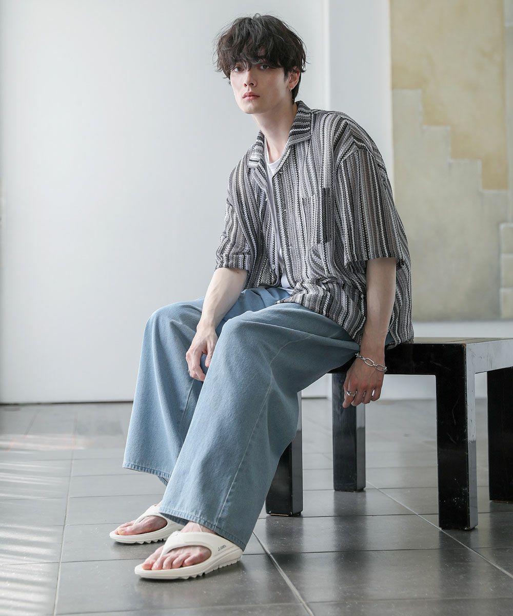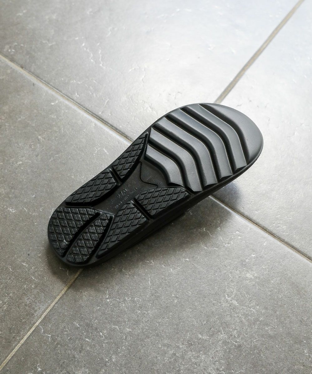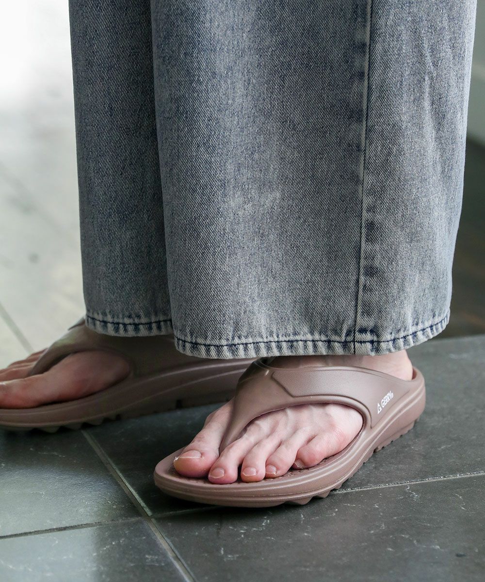 素材には軽量で耐久性の高い材質のEVAを採用。ゴムと似た素材で、柔軟性と弾力性を持つため、足に優しい履き心地です。ビーチサンダルのような形状で、親指と人差し指の間でホールドできる安定感のあるタイプ。開放感のある涼し気な印象を作り出し、素足でサッと気軽に脱ぎ履きできるデザインです。
