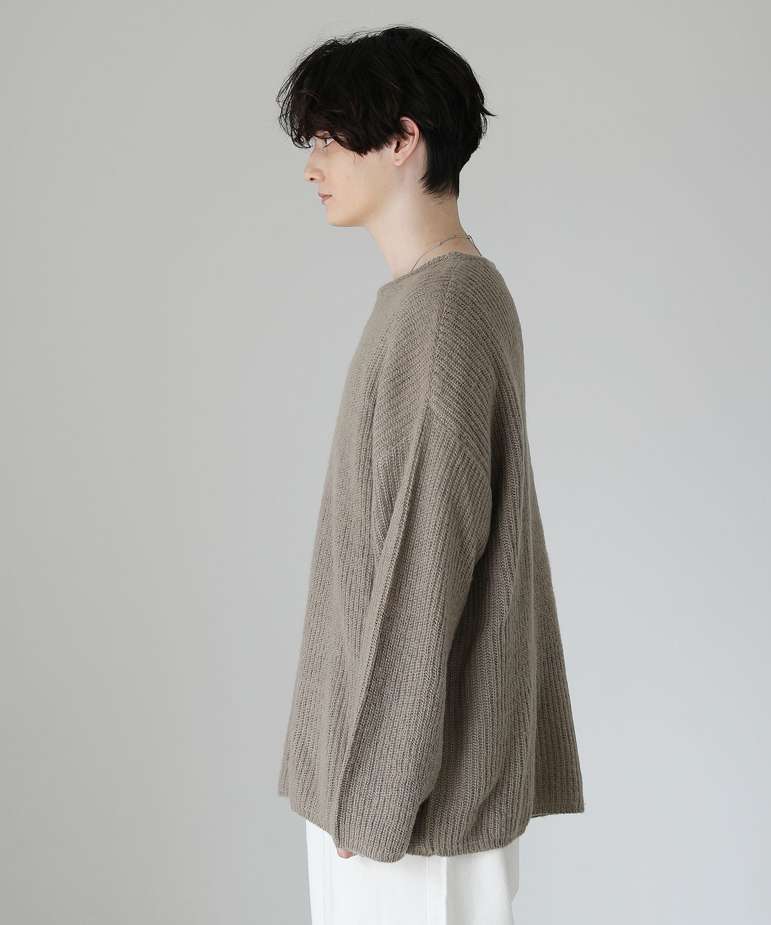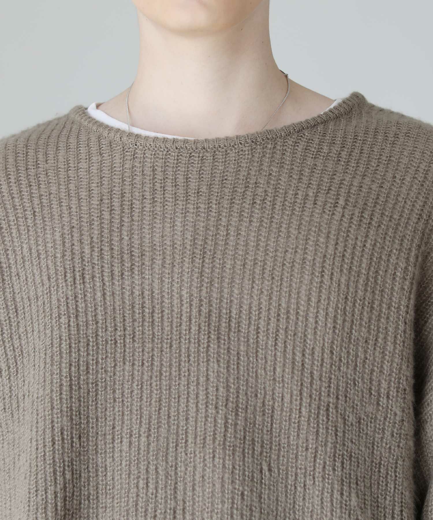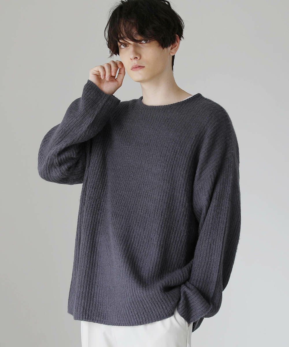 注目のモヘアタッチニット。ゆったり取られた身幅に肩の落ちたドロップショルダーデザインのルーズな雰囲気が魅力です。首回り、袖、裾のリブをやや細めにし、また緩めのネックの開き具合でどことなく上品な雰囲気の漂うアイテム。ソフトタッチでやや長めの毛足の質感が秋冬らしい温かみを着こなしにプラスします。