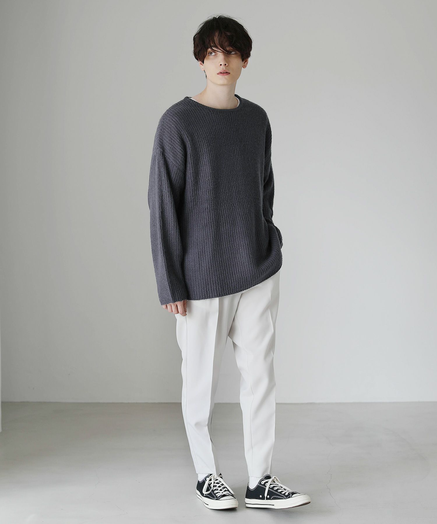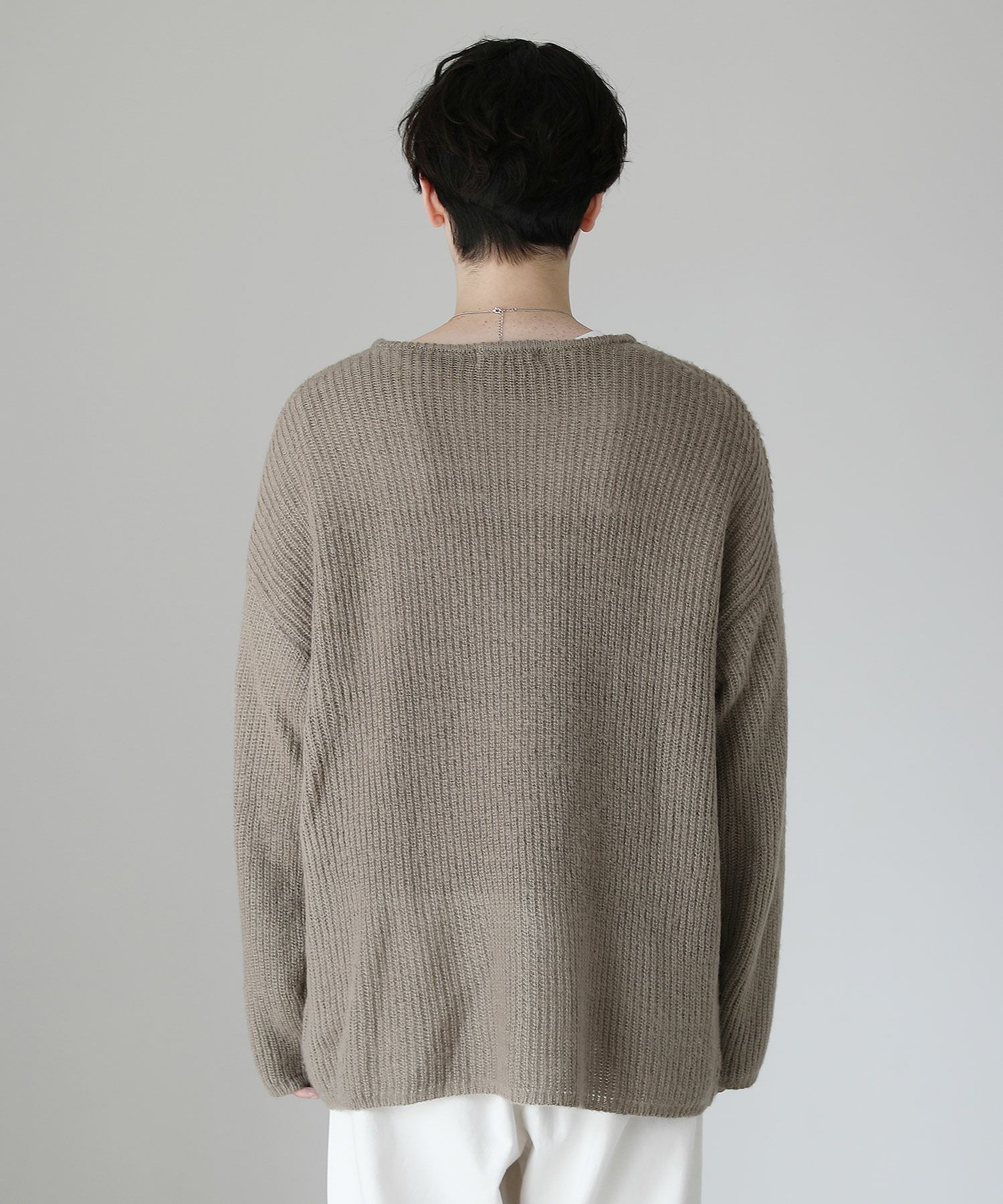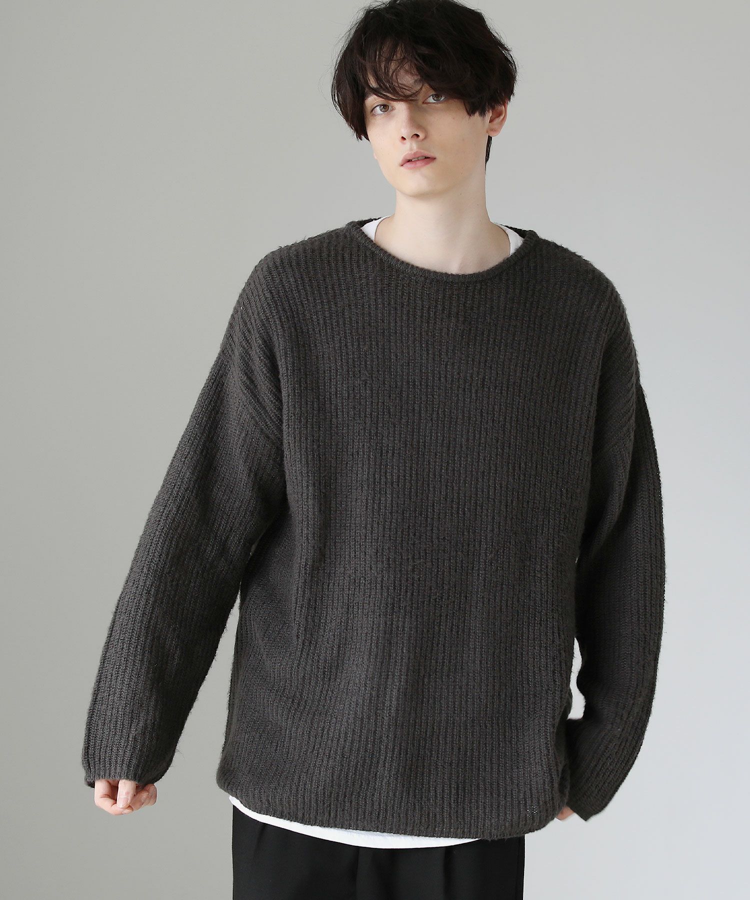 注目のモヘアタッチニット。ゆったり取られた身幅に肩の落ちたドロップショルダーデザインのルーズな雰囲気が魅力です。首回り、袖、裾のリブをやや細めにし、また緩めのネックの開き具合でどことなく上品な雰囲気の漂うアイテム。ソフトタッチでやや長めの毛足の質感が秋冬らしい温かみを着こなしにプラスします。