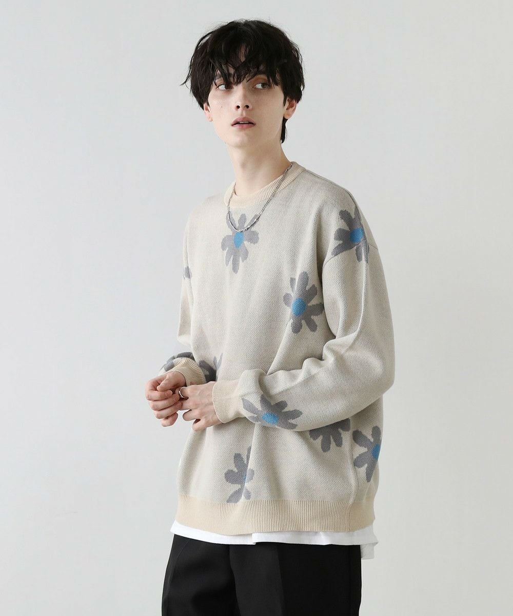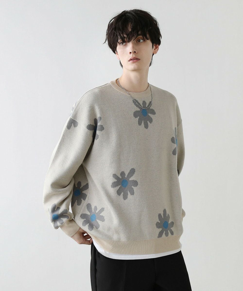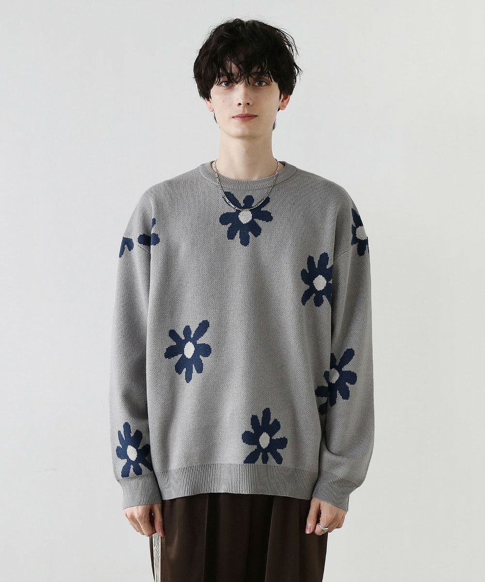 ビックシルエットフラワー柄ダブルジャガードクルーニット