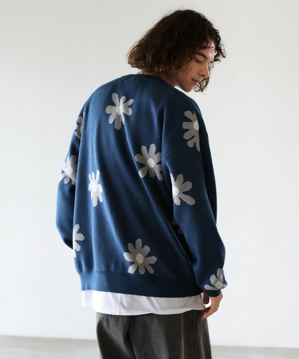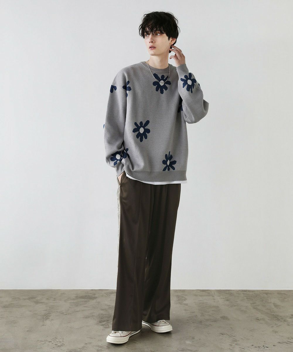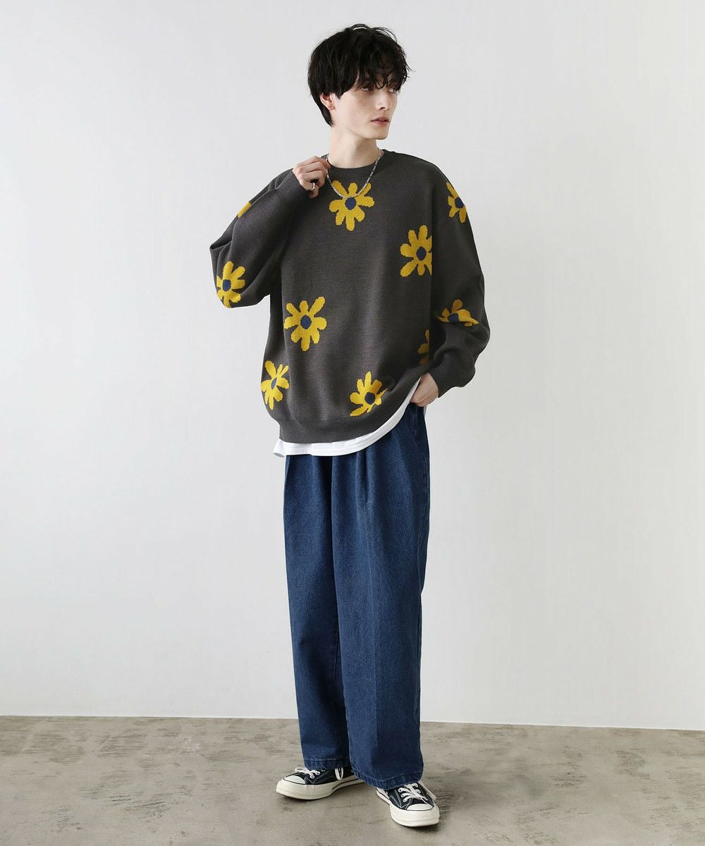 ビックシルエットフラワー柄ダブルジャガードクルーニット