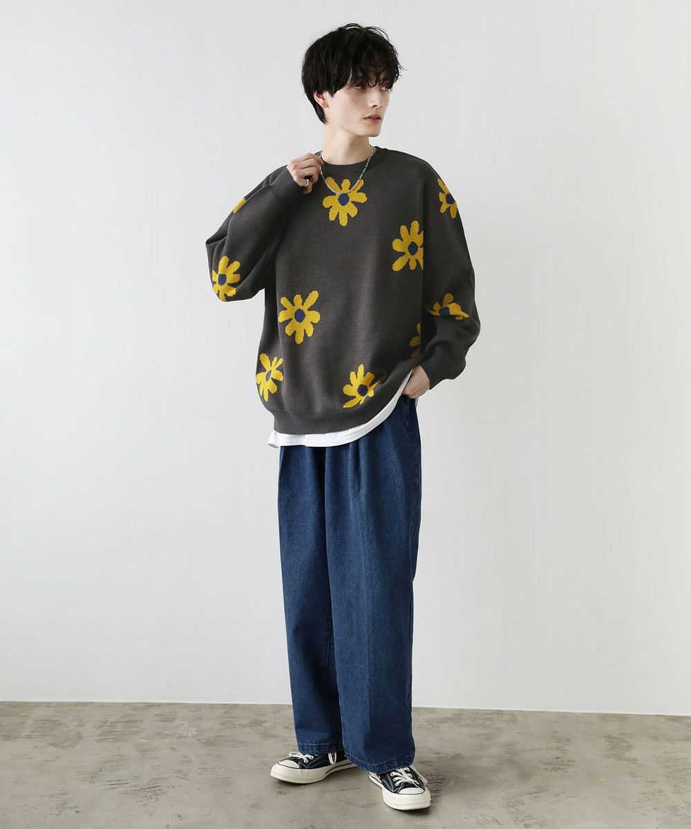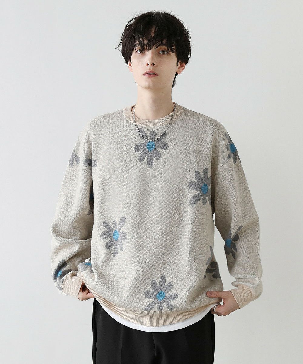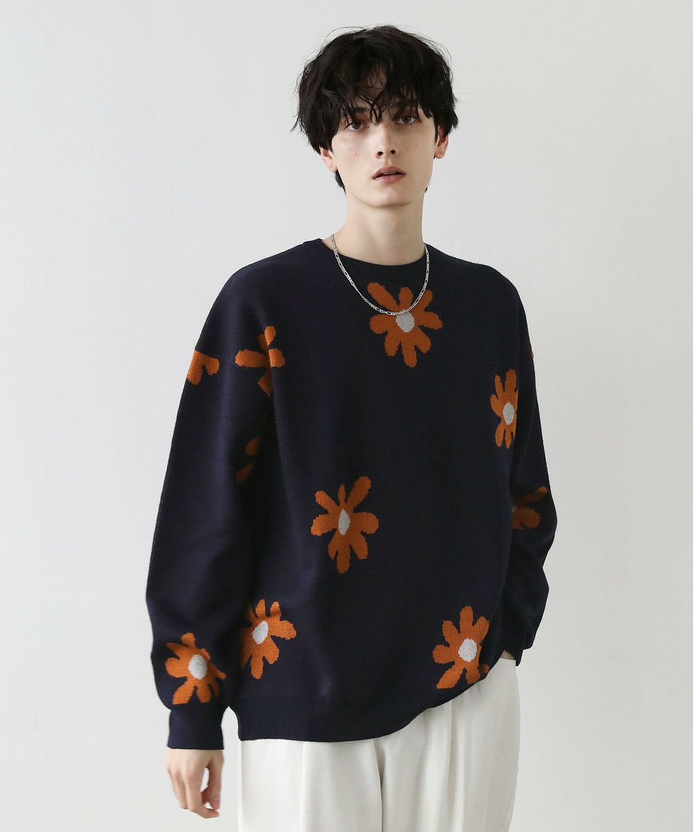 フラワーパターンがヴィンテージライクな小花柄ニットです。シンプルなデザインの花柄を奥行きのあるジャガード編みで表現。トレンド感とこなれ感溢れる着こなしが楽しめるニットアイテムです。一着あるとコーデのポイントになる、シンプルながらもインパクトのあるアイテム。