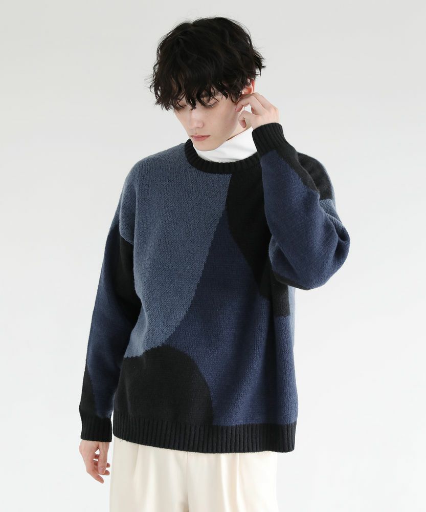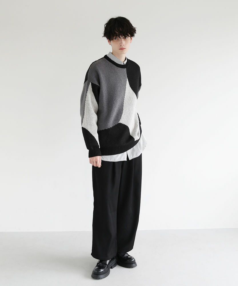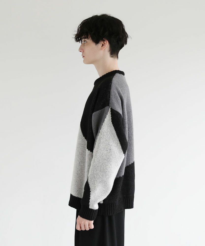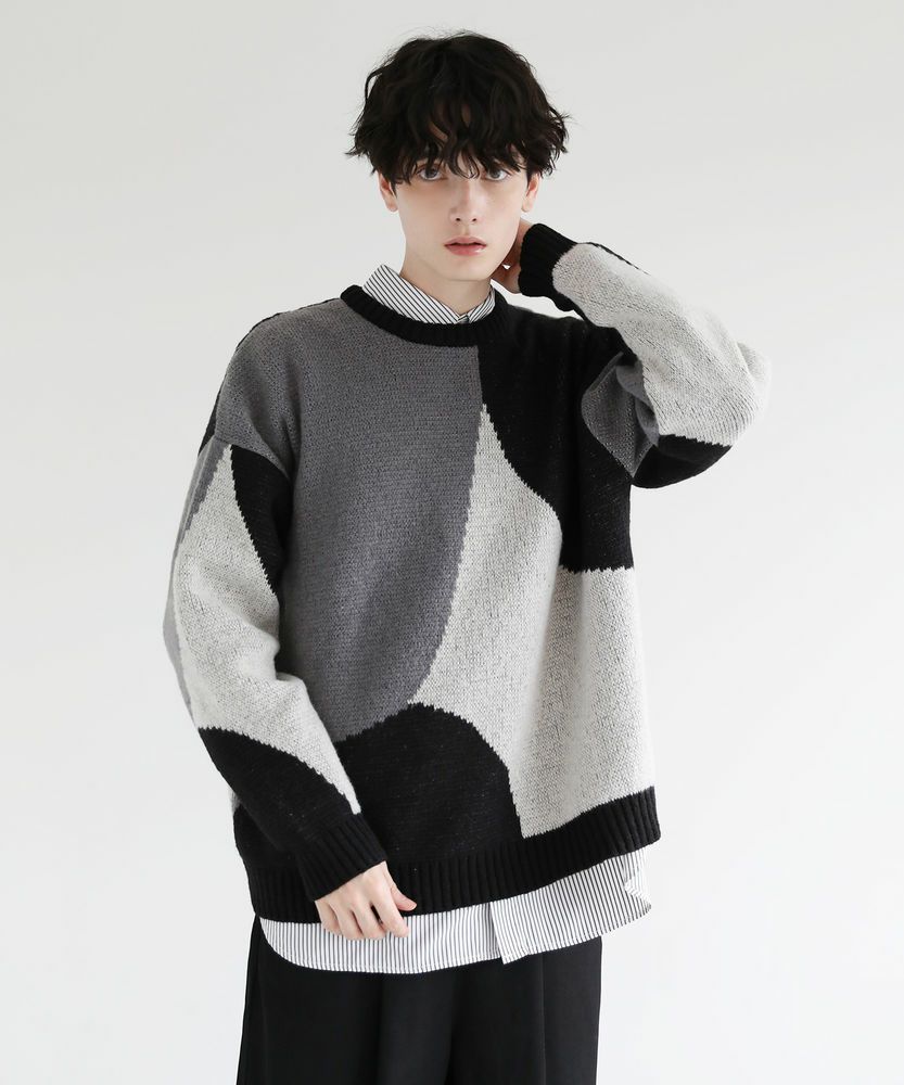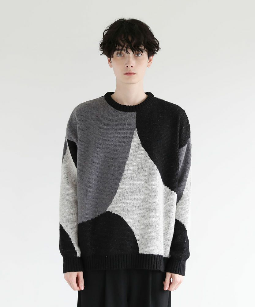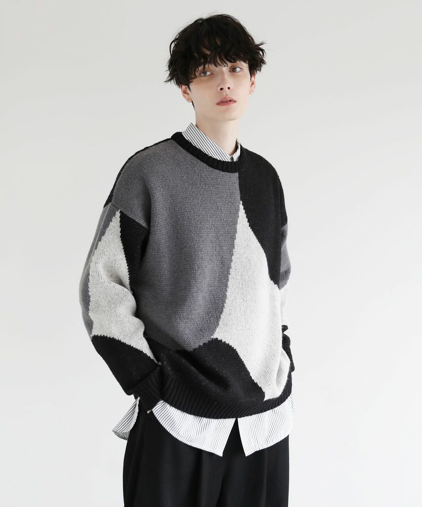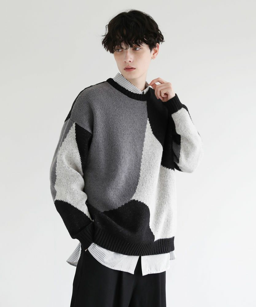 3. ビックシルエット変則柄ダブルジャガードクルーニット