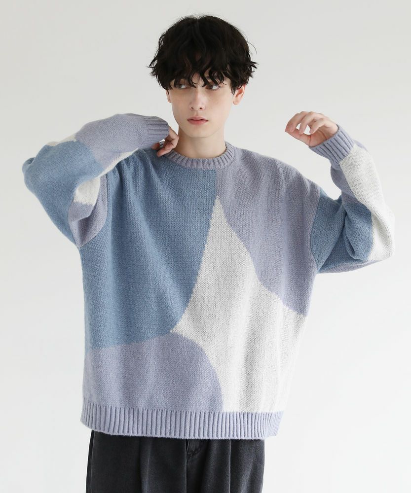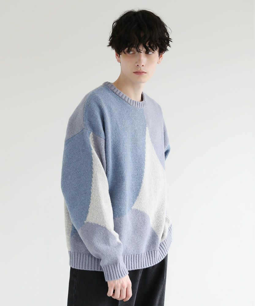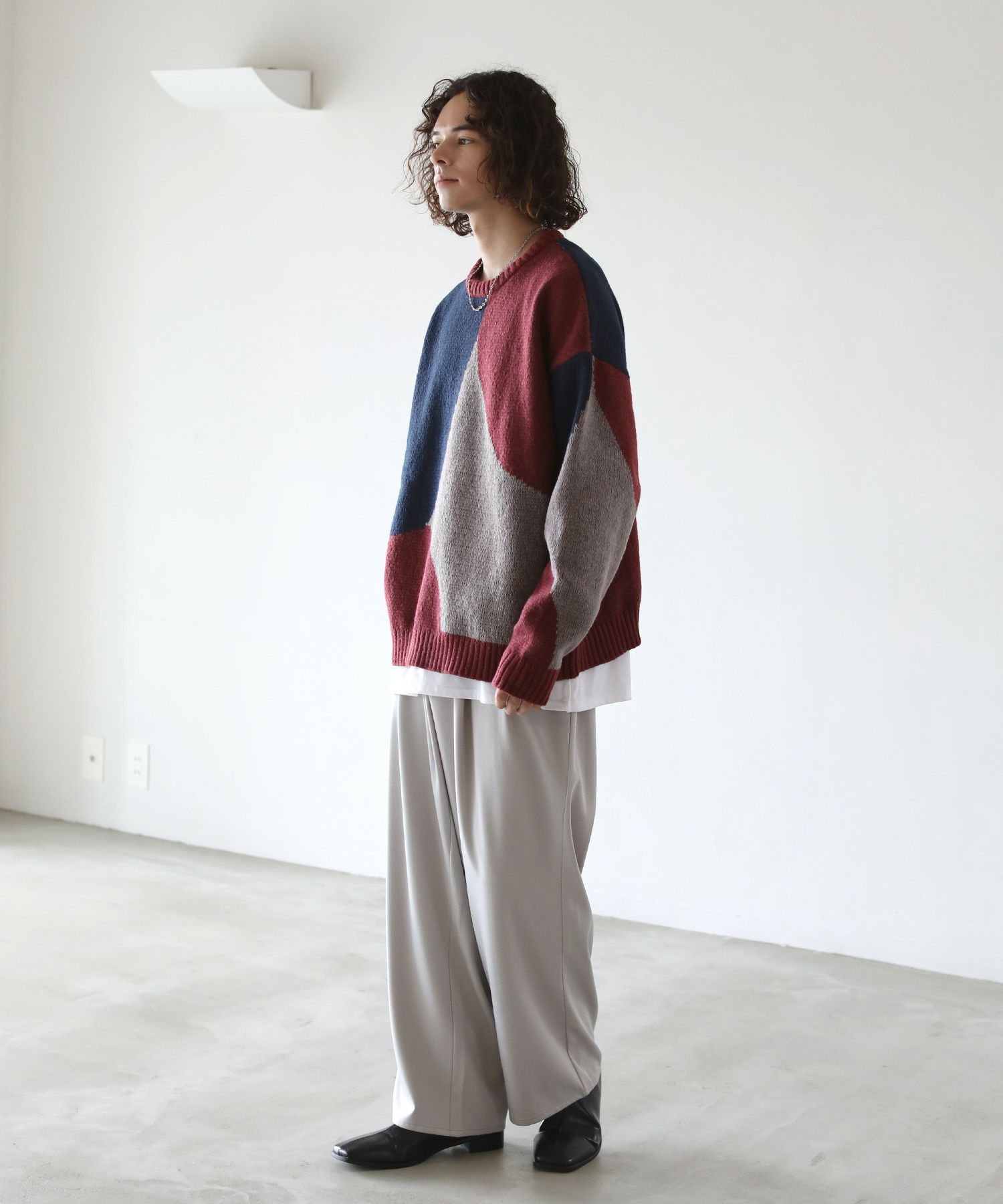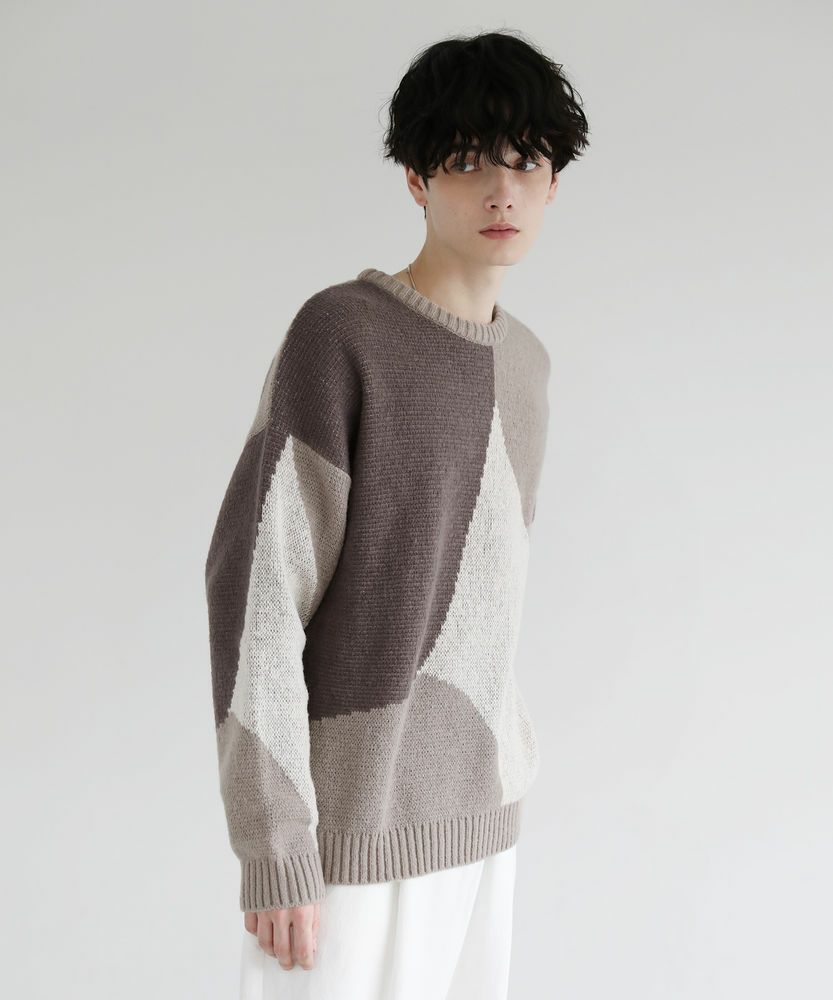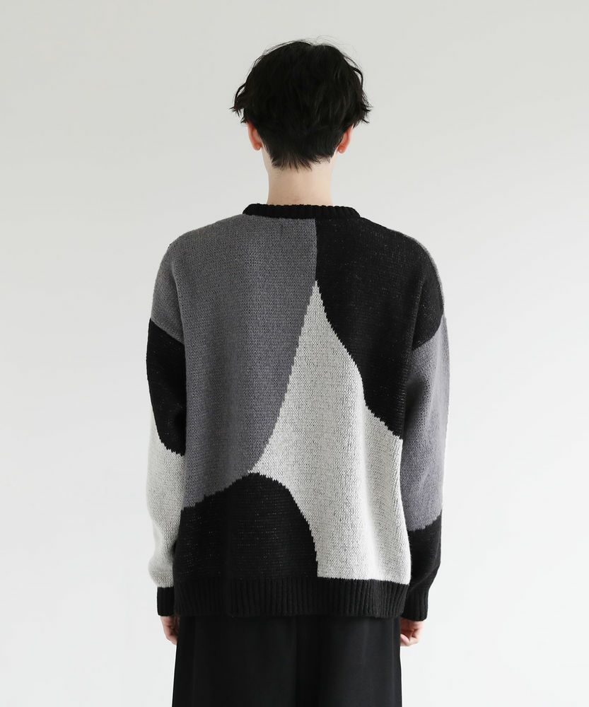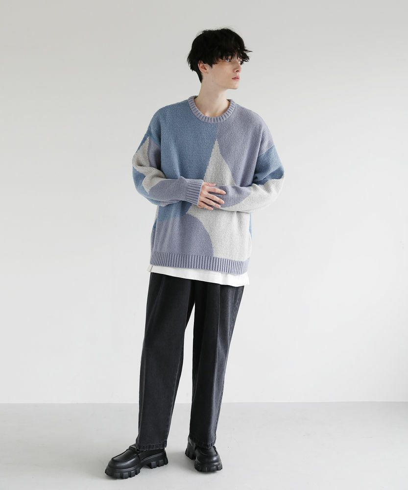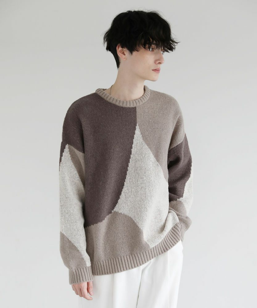 3. ビックシルエット変則柄ダブルジャガードクルーニット