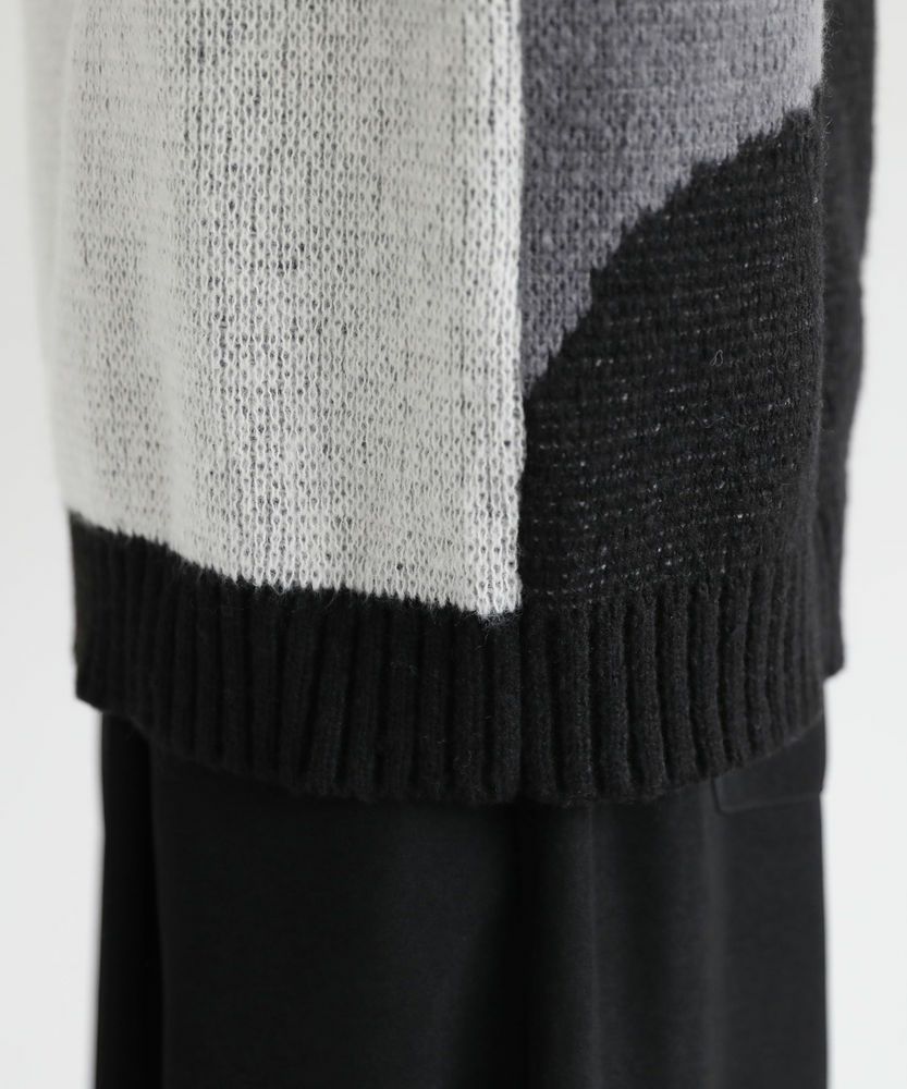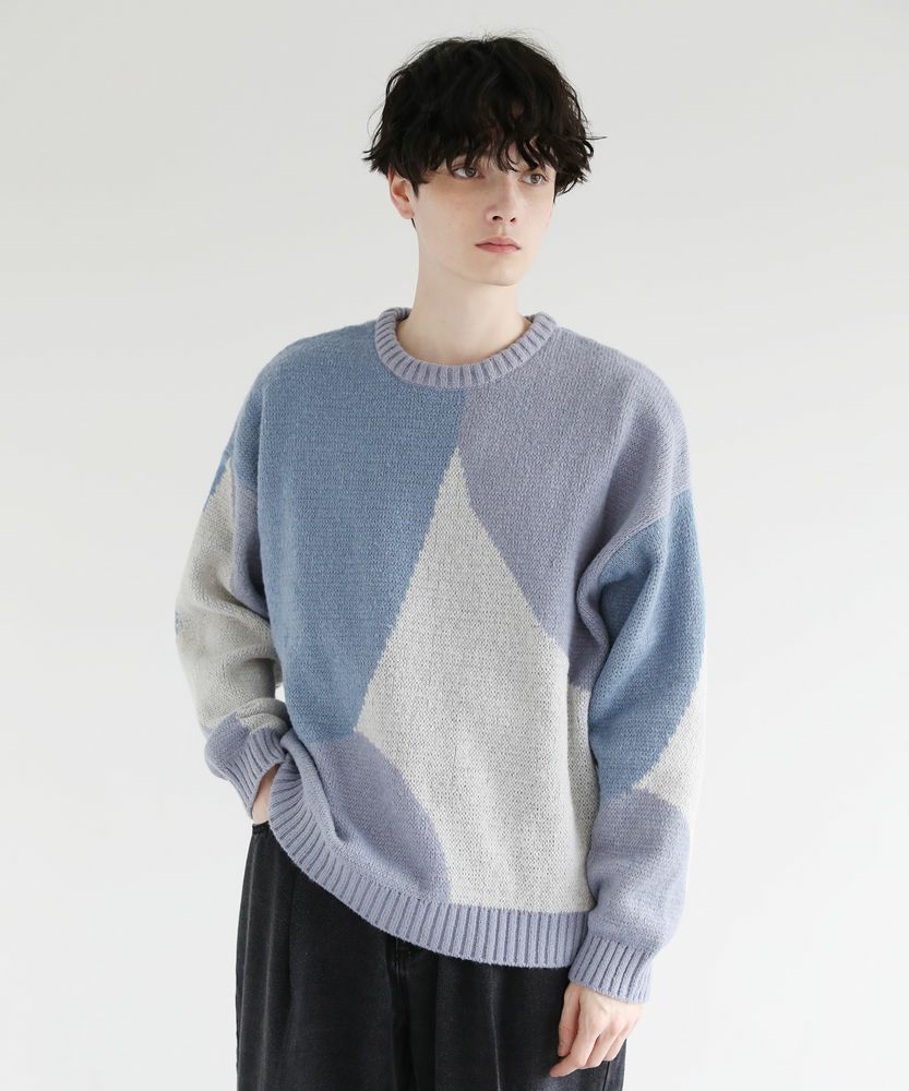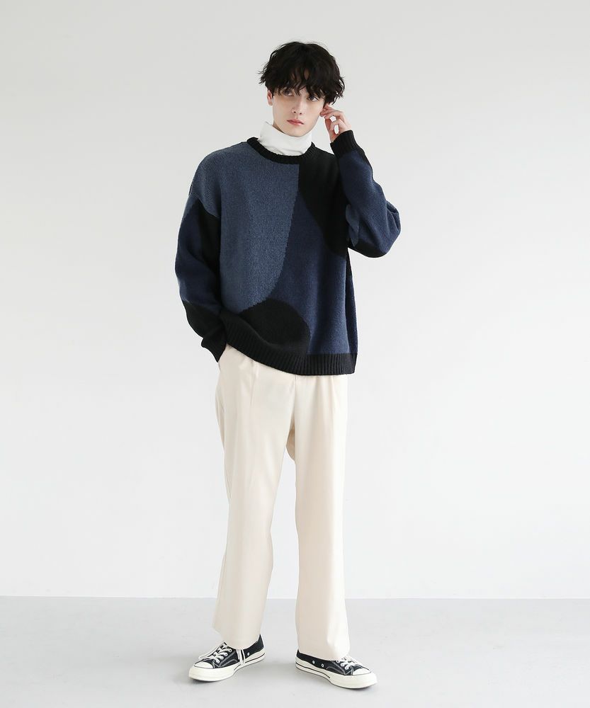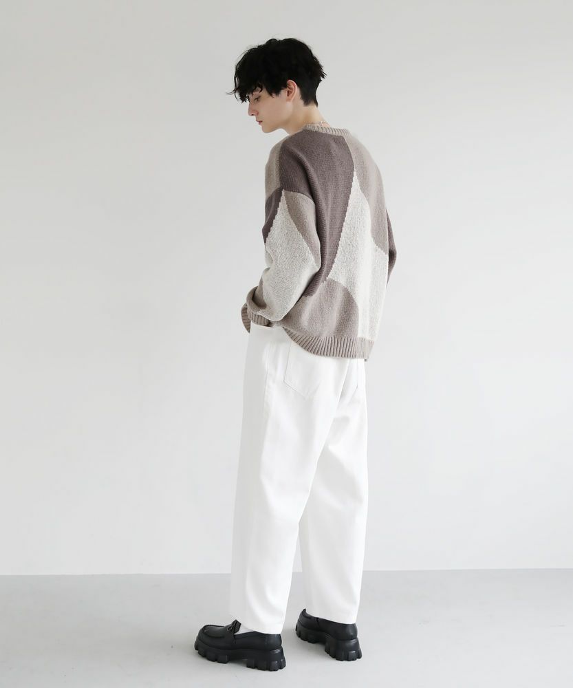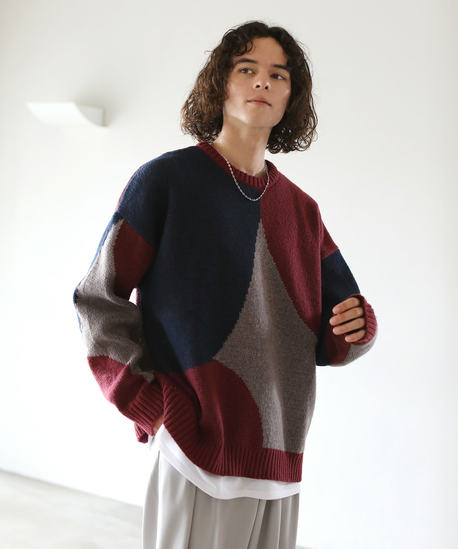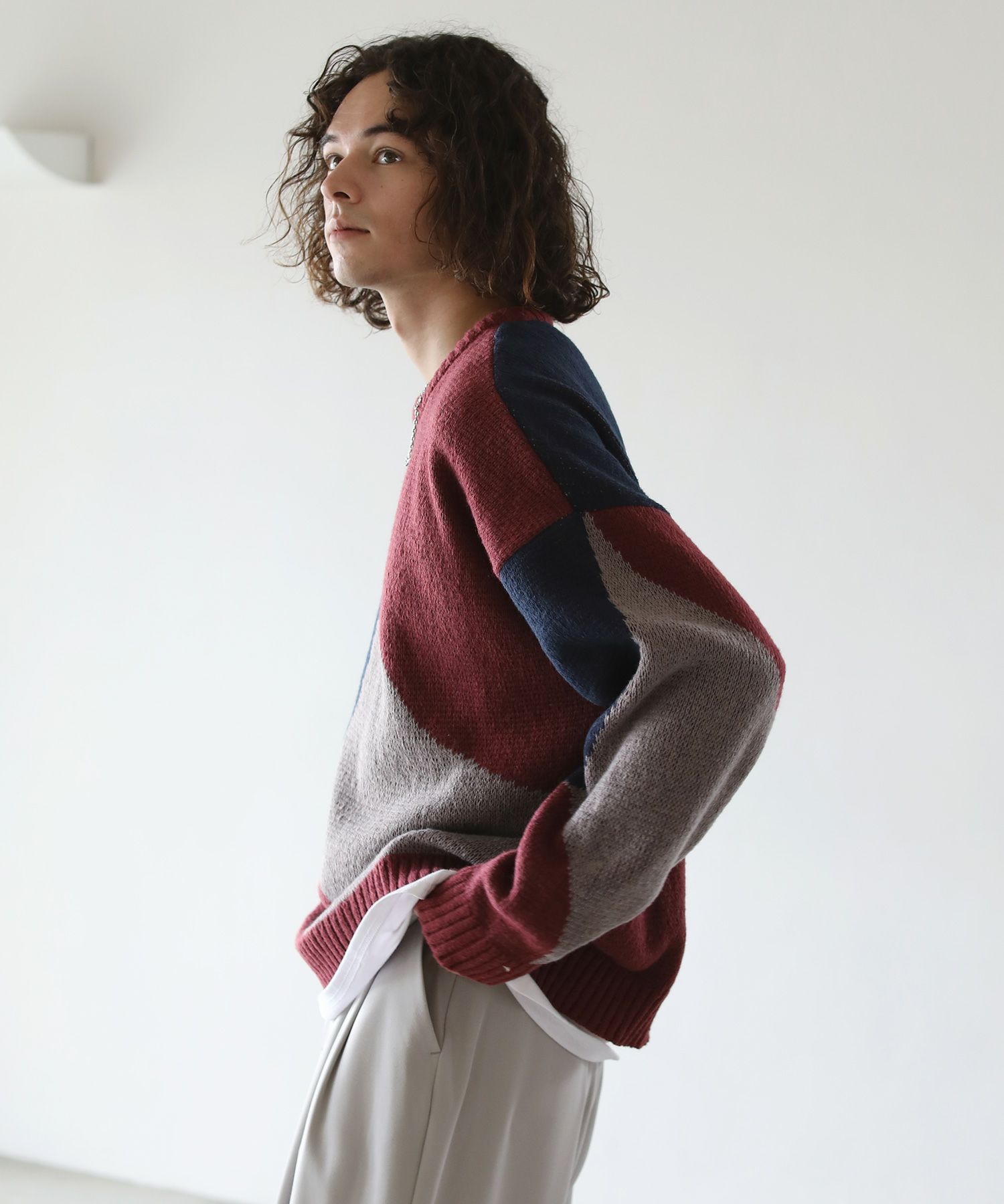 3. ビックシルエット変則柄ダブルジャガードクルーニット