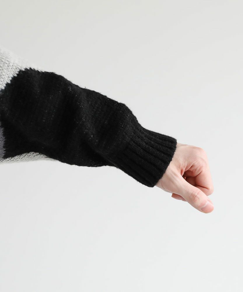 同系カラーで配色されたデザイン性の高い変則柄ニット。肩のラインが落ちたデザインで、リラックス感のあるたっぷりオーバーサイズです。もちもちとした肌触りと柔らかな素材でふくらみのある編地が特徴です。首元と裾はリブ仕様で、寒い季節には風の侵入を防いでくれます。秋冬に使いやすいカラー展開になっております。