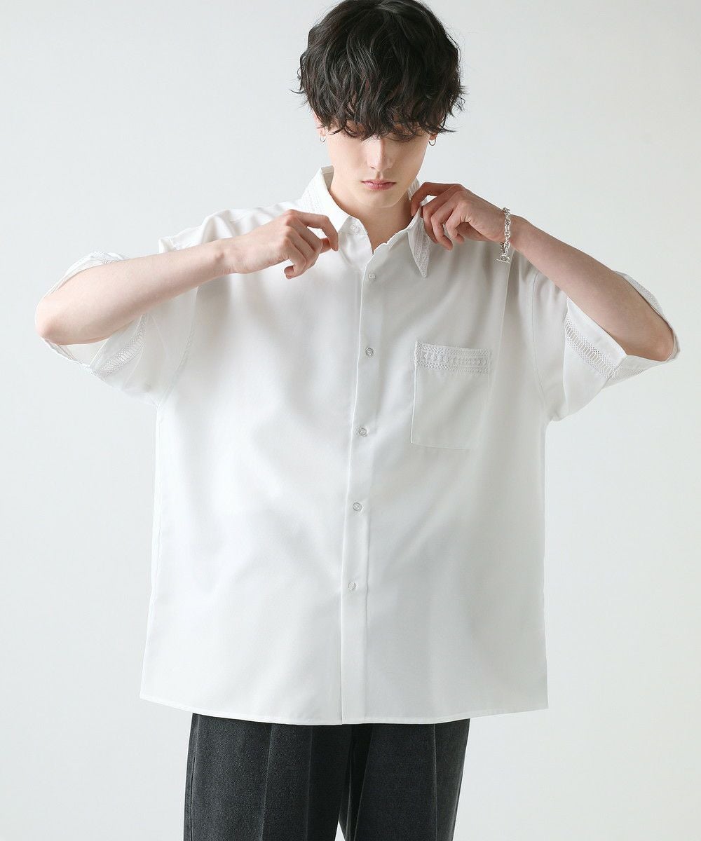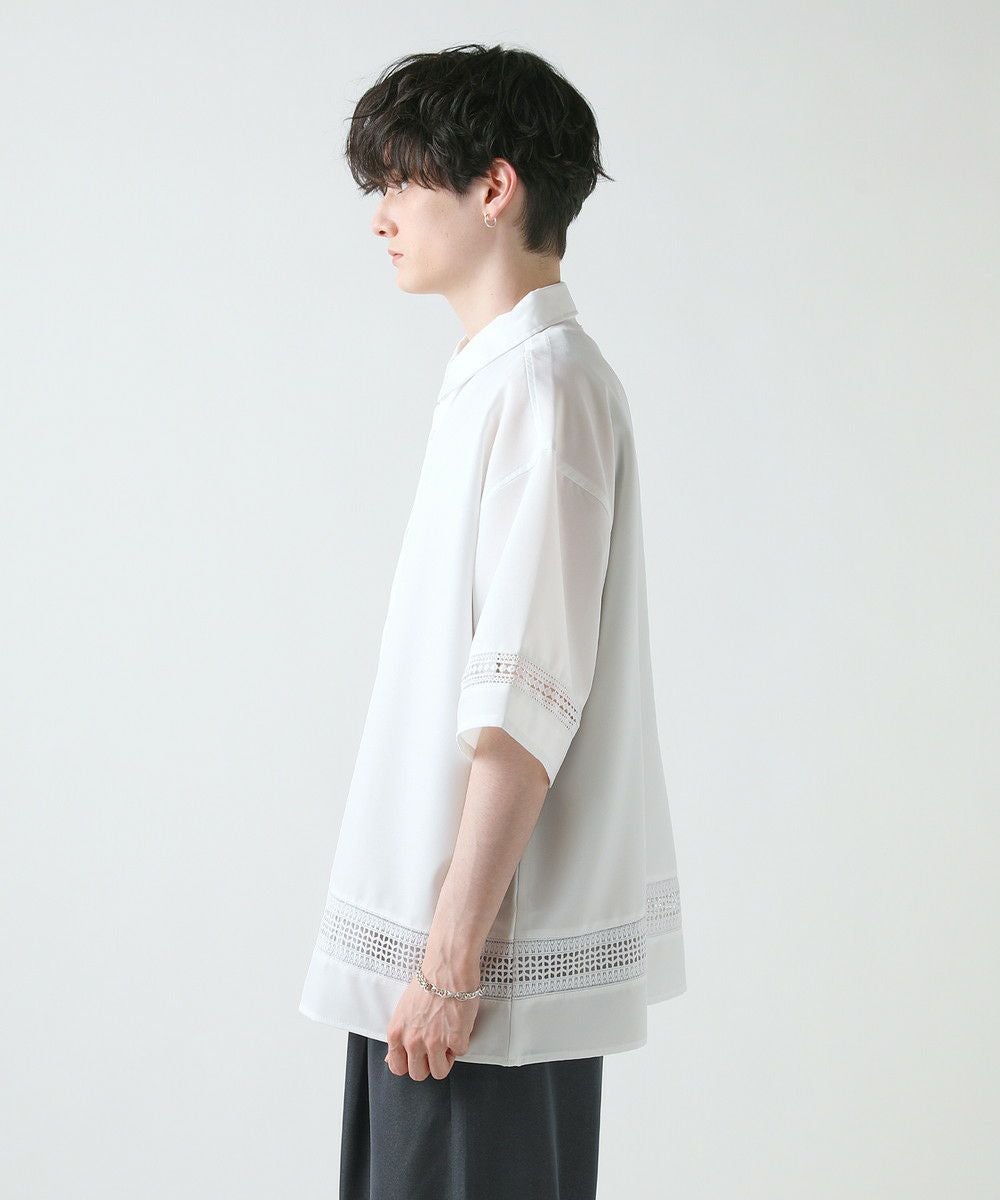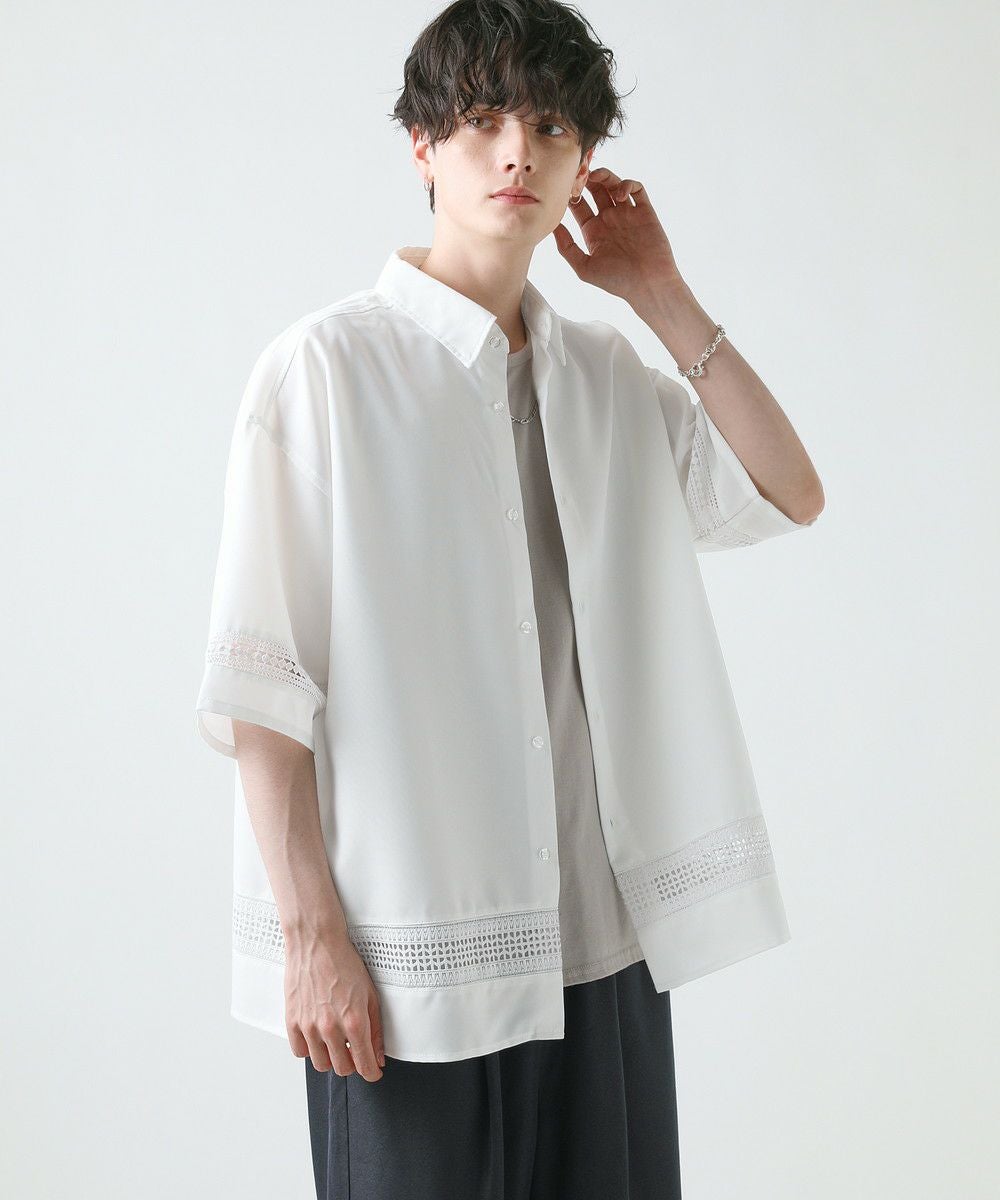 襟や裾、袖の切り替え部分にレースを施した華やかなシャツ。ワントーンに馴染みながらも、異素材のコントラストがメリハリと上品さをプラスします。袖や身幅をワイドに設定し、抜け感のある印象に仕上げました。レースのデザインと切り替え部分が異なるタイプA、Bの2種類展開。Aは襟、胸ポケット、袖口部分。Bは袖口、裾部分にレース切り替えが入っています。ホワイト、ブラックの2色展開で、お持ちのアイテムに取り入れやすくコーデを上品にまとめられます。