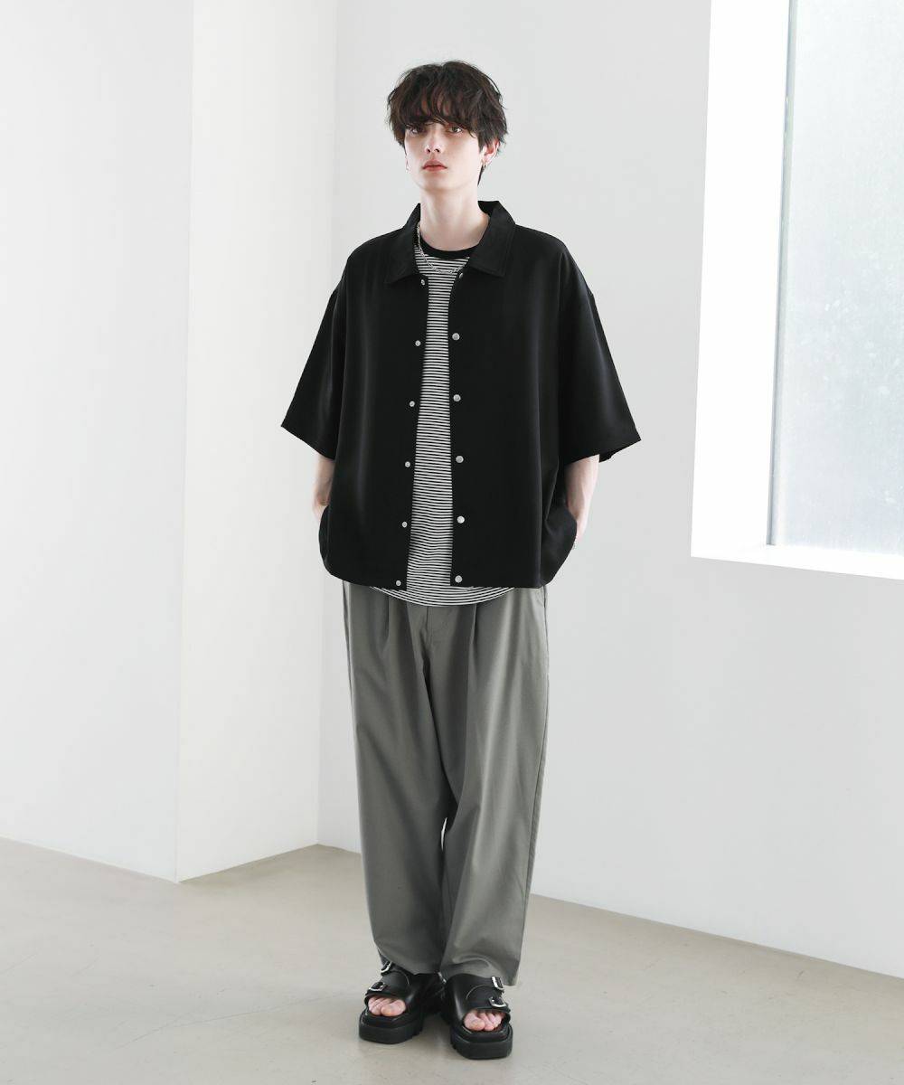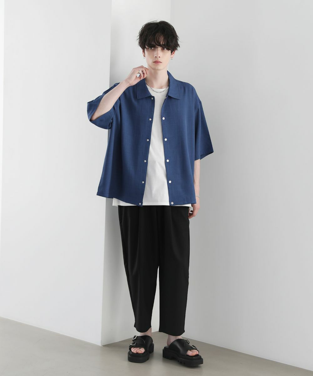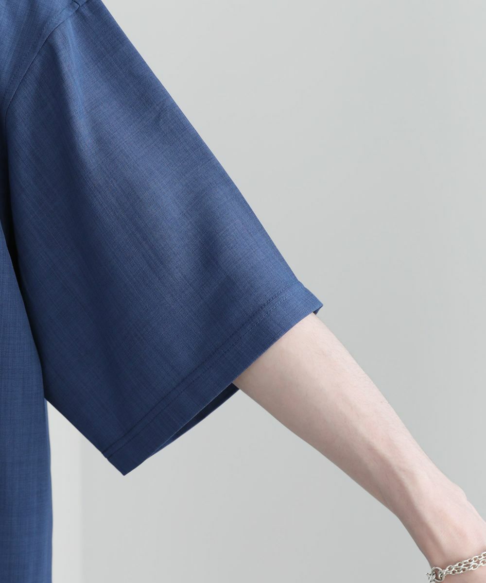 リネンの様なさらりとしたシャリ感&清涼感が特徴のポリエステル素材を使用。速乾性があり、夏でも涼しく着用できます。また、シワになりずらいのがポイントです。