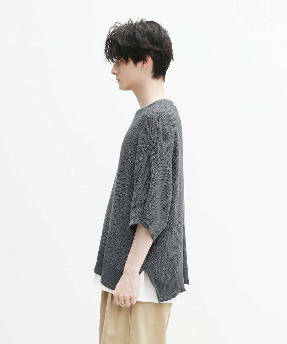 ウォッシャブル畔編みサイドスリット5分袖ニット