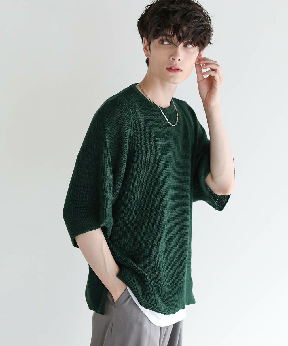 ウォッシャブル畔編みサイドスリット5部袖ニット