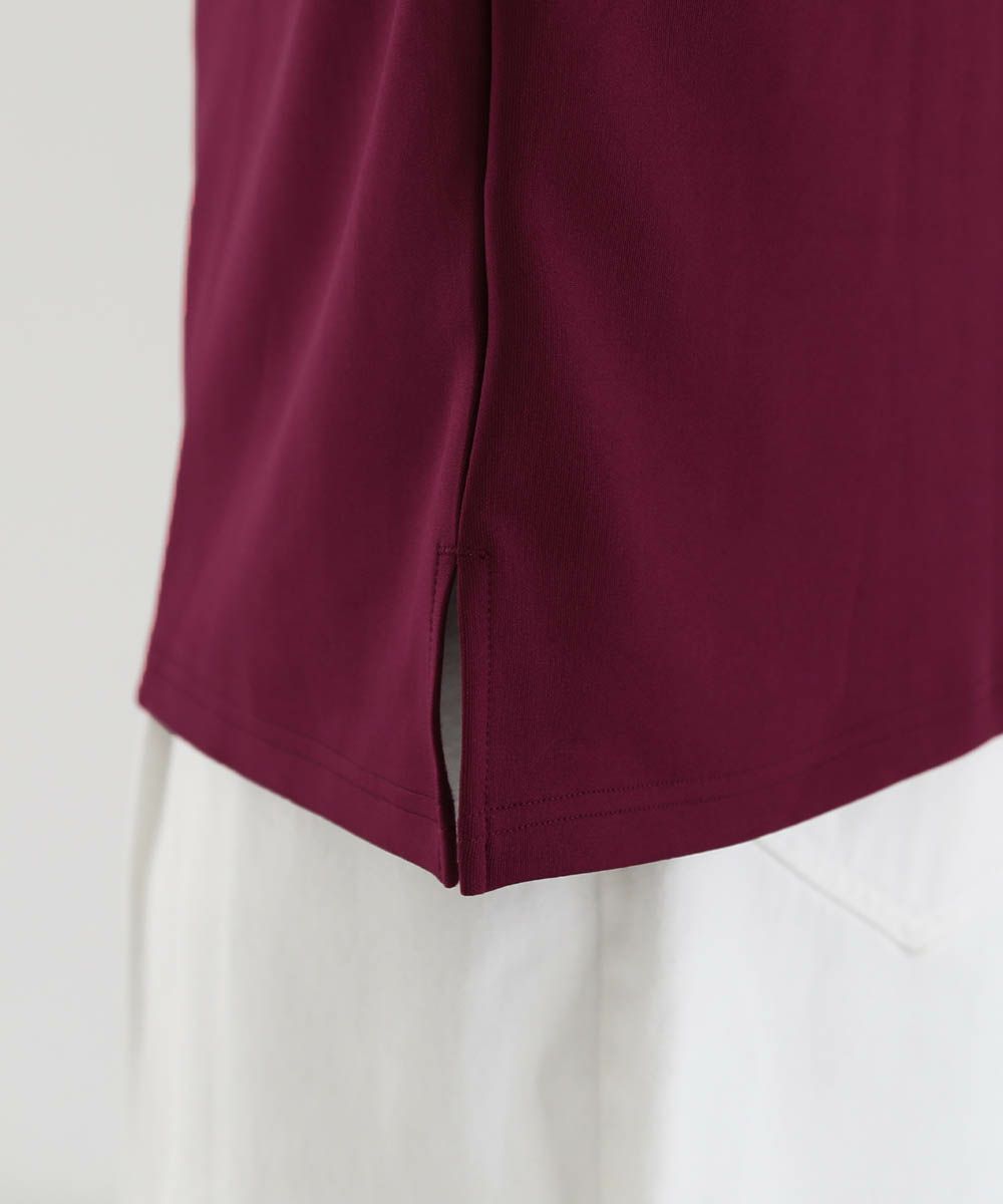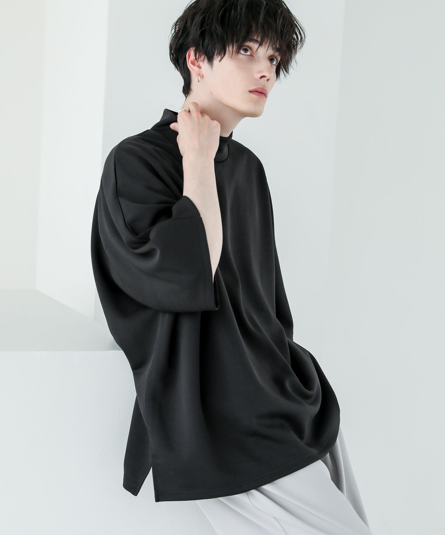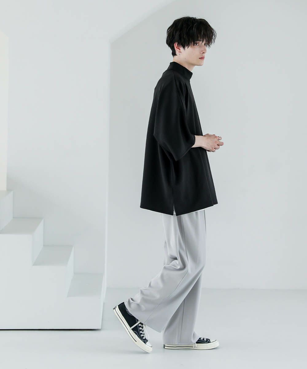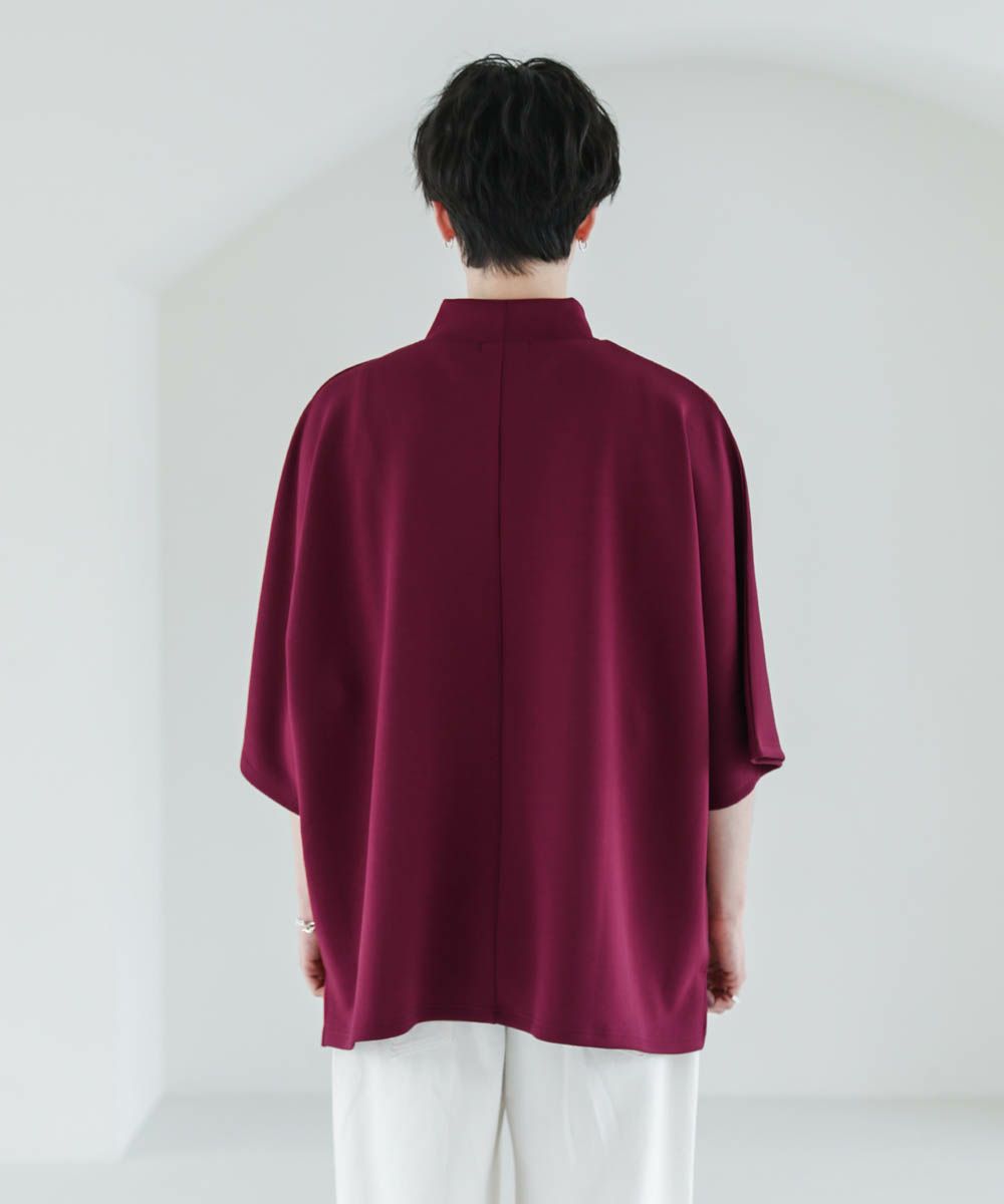 どんな着こなしにも使いやすく、1枚でコーディネートが決まる半袖モックネックプルオーバー。ドルマンスリーブ&ワイドな袖が立体感のあるシルエット。ゆったりとしたオーバーサイズと締め付け感のない首元が程よい抜け感を生み出してくれるアイテムです。サイドスリット入りでインナーとのレイヤードも決まります。空気を含んだようなふくらみと適度なハリのあるポンチ素材は伸縮性に優れており楽な着心地が魅力。ほんのりと光沢感があり、シンプルなアイテムながら1枚で上品でキレイめな印象を与えてくれます。