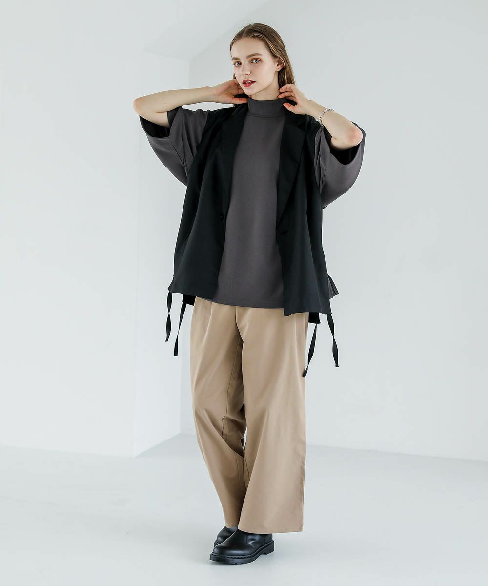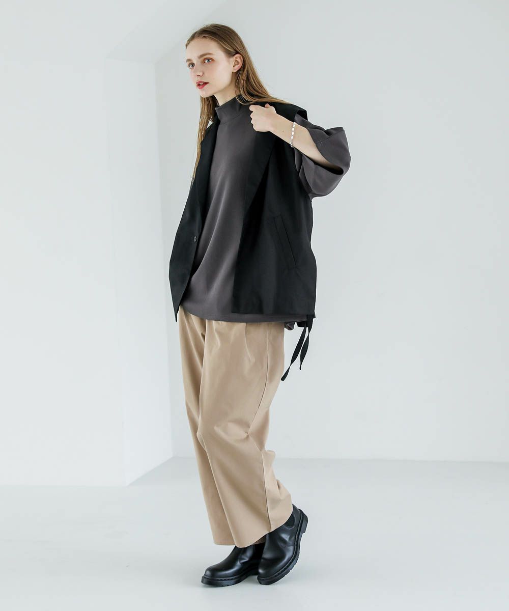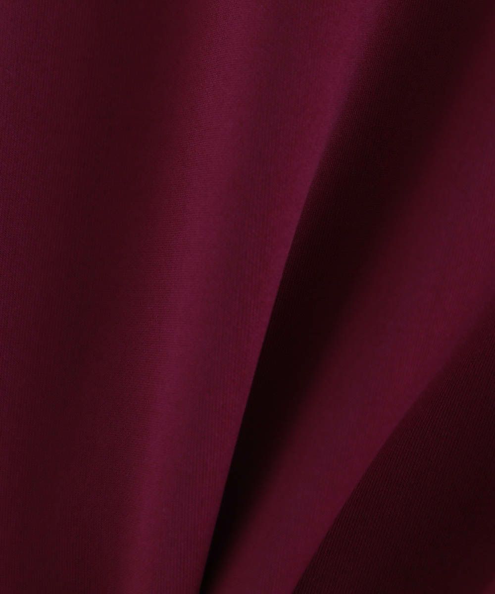 伸縮性のある柔らかなポンチ素材を使用しています。軽い着心地で動きやすく快適な着心地。程よい光沢感と艶感がありキレイめな雰囲気で着用いただけます。シワになりにくくご自宅でのケアも簡単なのも嬉しいポイント。