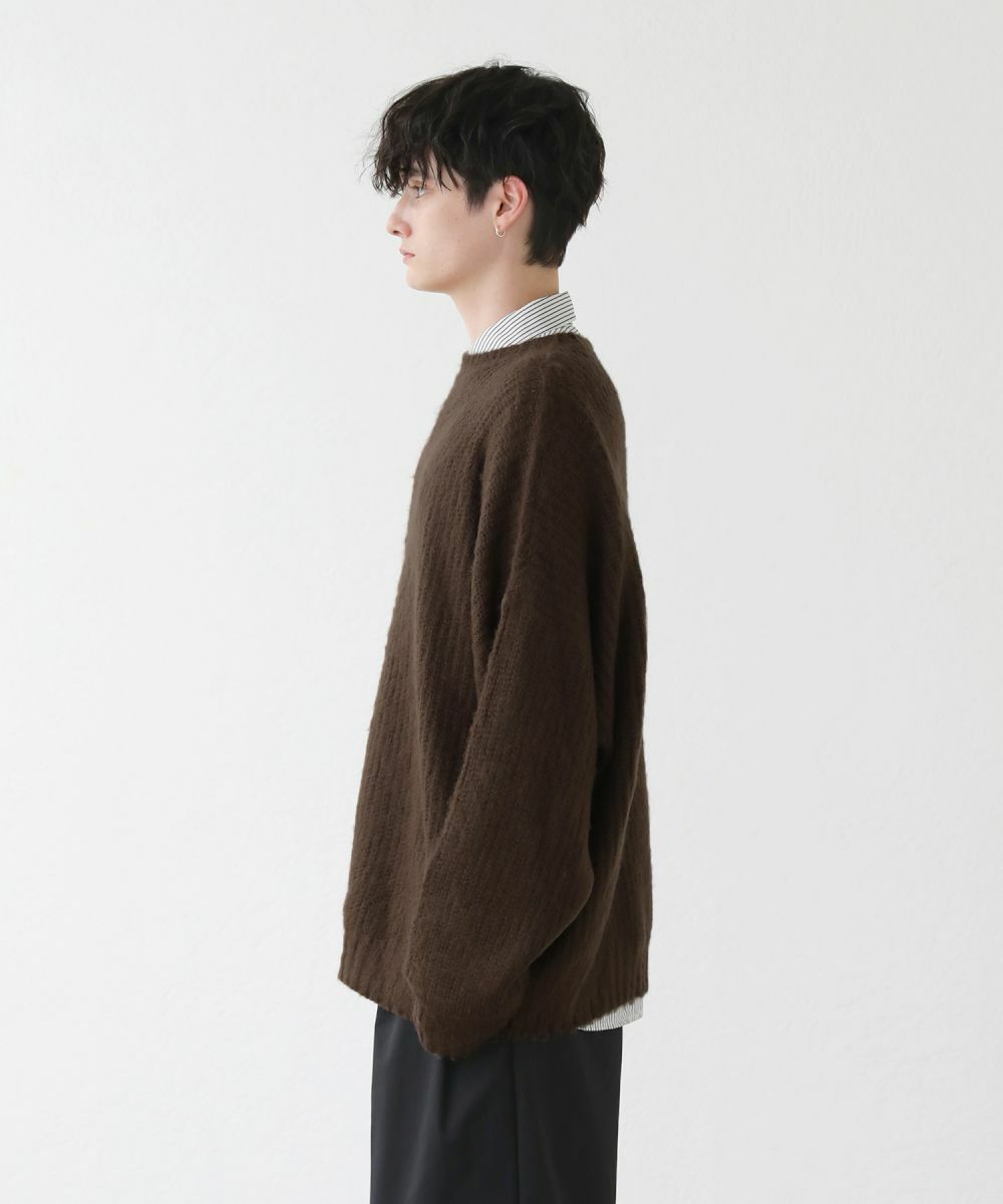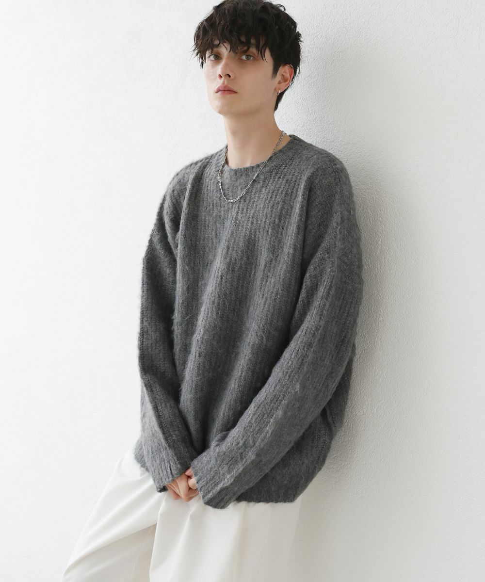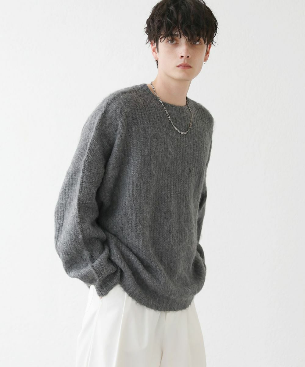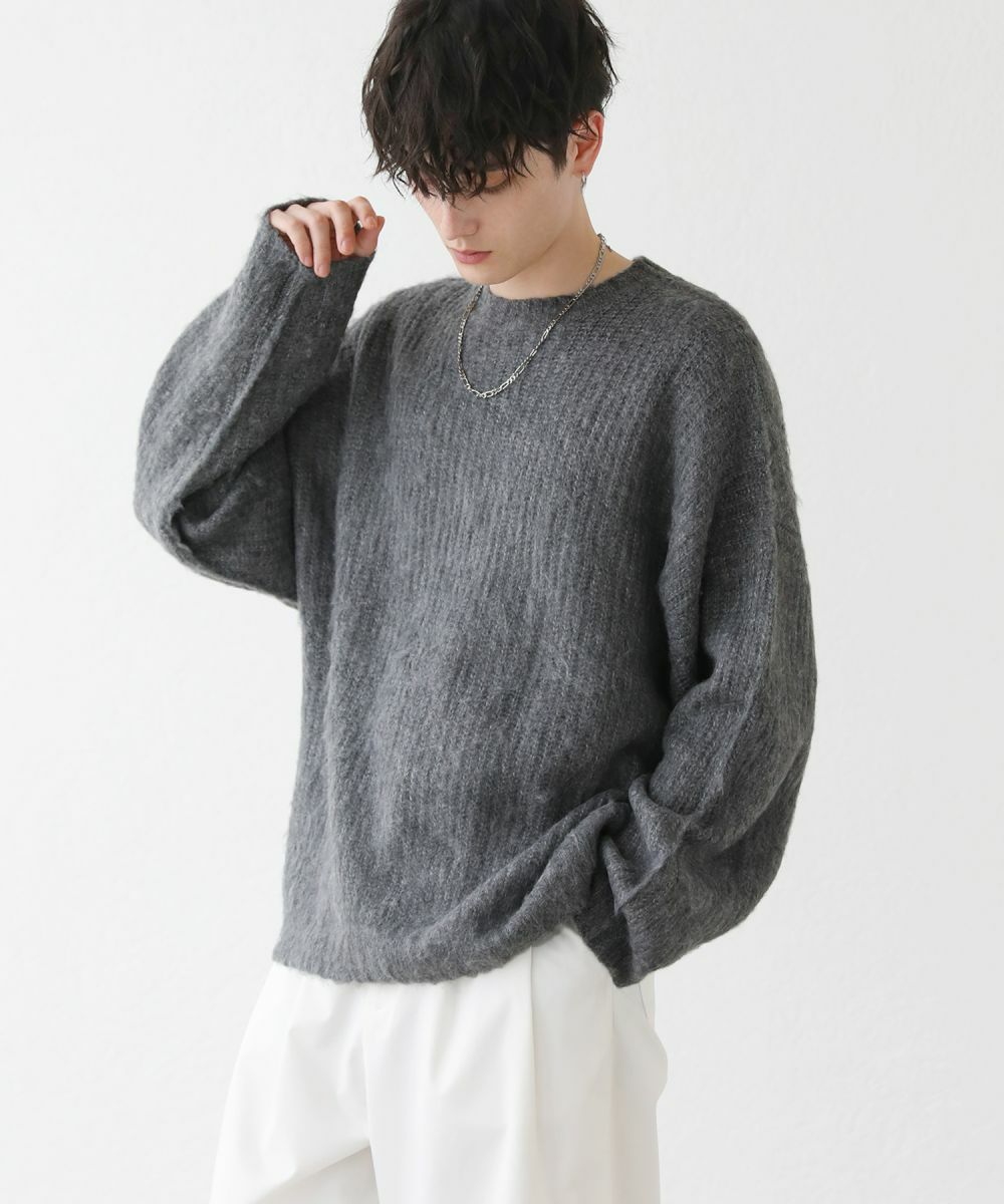 モヘアのような柔らかい肌触りのクルーネックニット。毛足の長いフワッとした質感で、見た目にも季節感と存在感のあるアイテムです。ゆとりのある身幅にドルマン風のデザインでゆったりと着用でき、リラックス感漂う雰囲気。保温性のあるアクリル100%生地で作られているため、寒い季節も暖かく過ごせます。単色のベーシックなデザインで、1枚あると秋から春先まで着回すことのできる便利な一着。定番のブラックやオフホワイトに加え、秋冬らしい深みのある杢グレー、ダークブラウン、ブルーグレーの5色展開です。ベーシックで着回しできるニットのため、色違いで揃えるのもおすすめです。