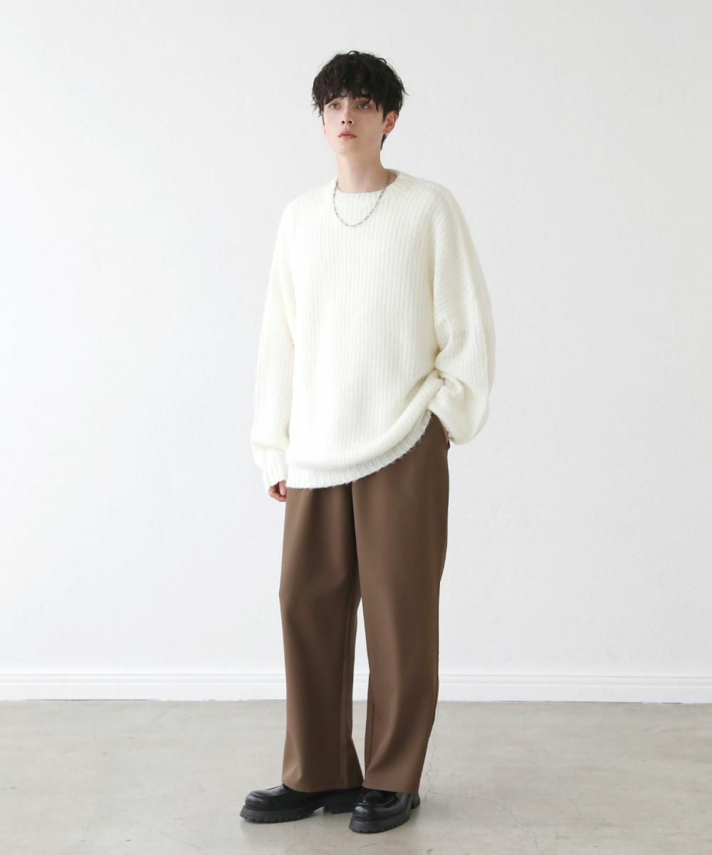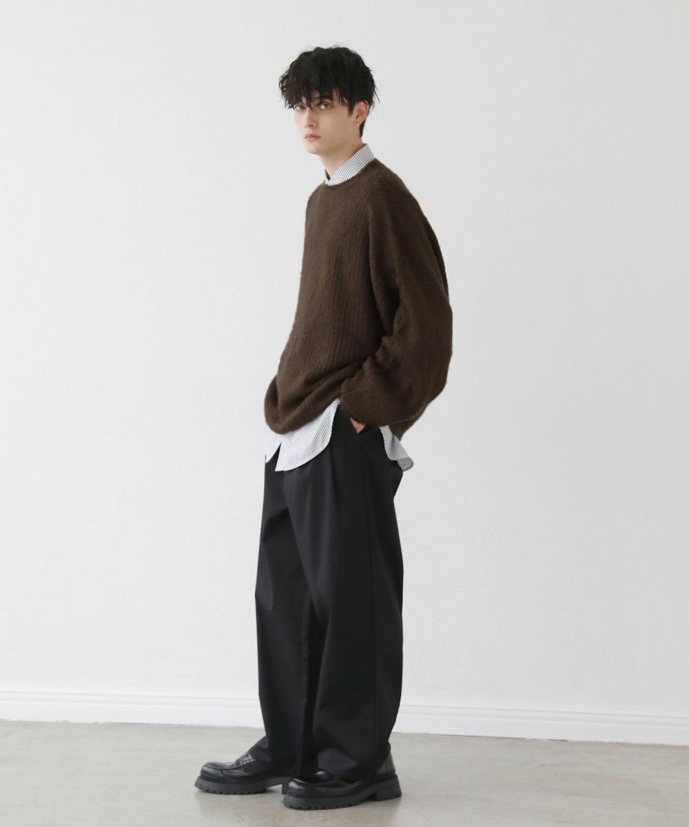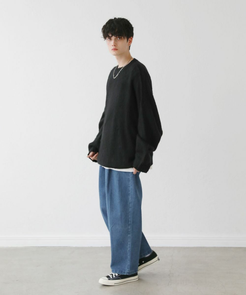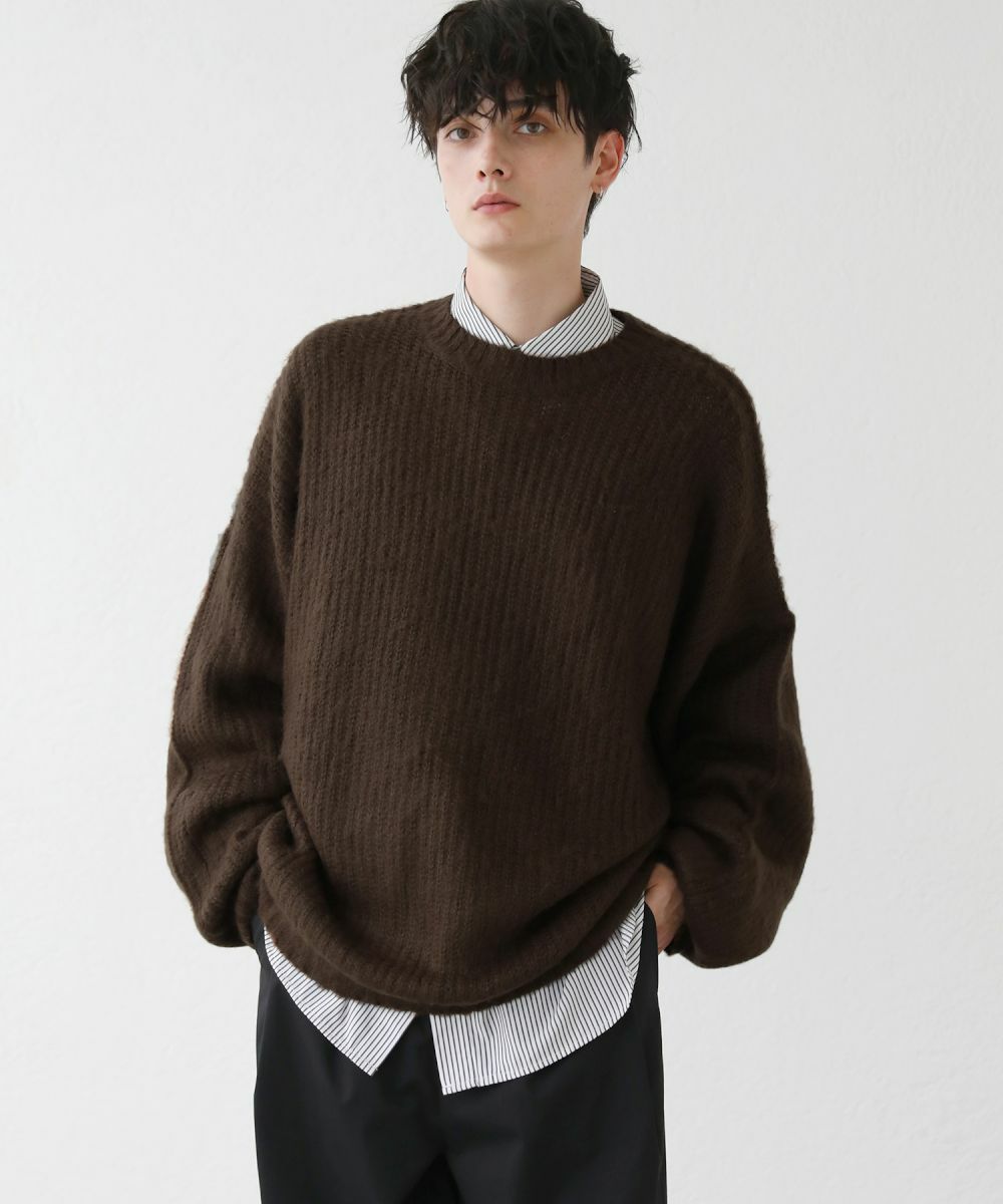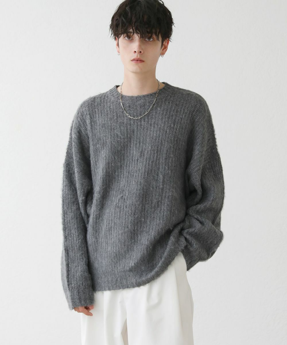 モヘアのような柔らかい肌触りのクルーネックニット。毛足の長いフワッとした質感で、見た目にも季節感と存在感のあるアイテムです。ゆとりのある身幅にドルマン風のデザインでゆったりと着用でき、リラックス感漂う雰囲気。保温性のあるアクリル100%生地で作られているため、寒い季節も暖かく過ごせます。単色のベーシックなデザインで、1枚あると秋から春先まで着回すことのできる便利な一着。定番のブラックやオフホワイトに加え、秋冬らしい深みのある杢グレー、ダークブラウン、ブルーグレーの5色展開です。ベーシックで着回しできるニットのため、色違いで揃えるのもおすすめです。