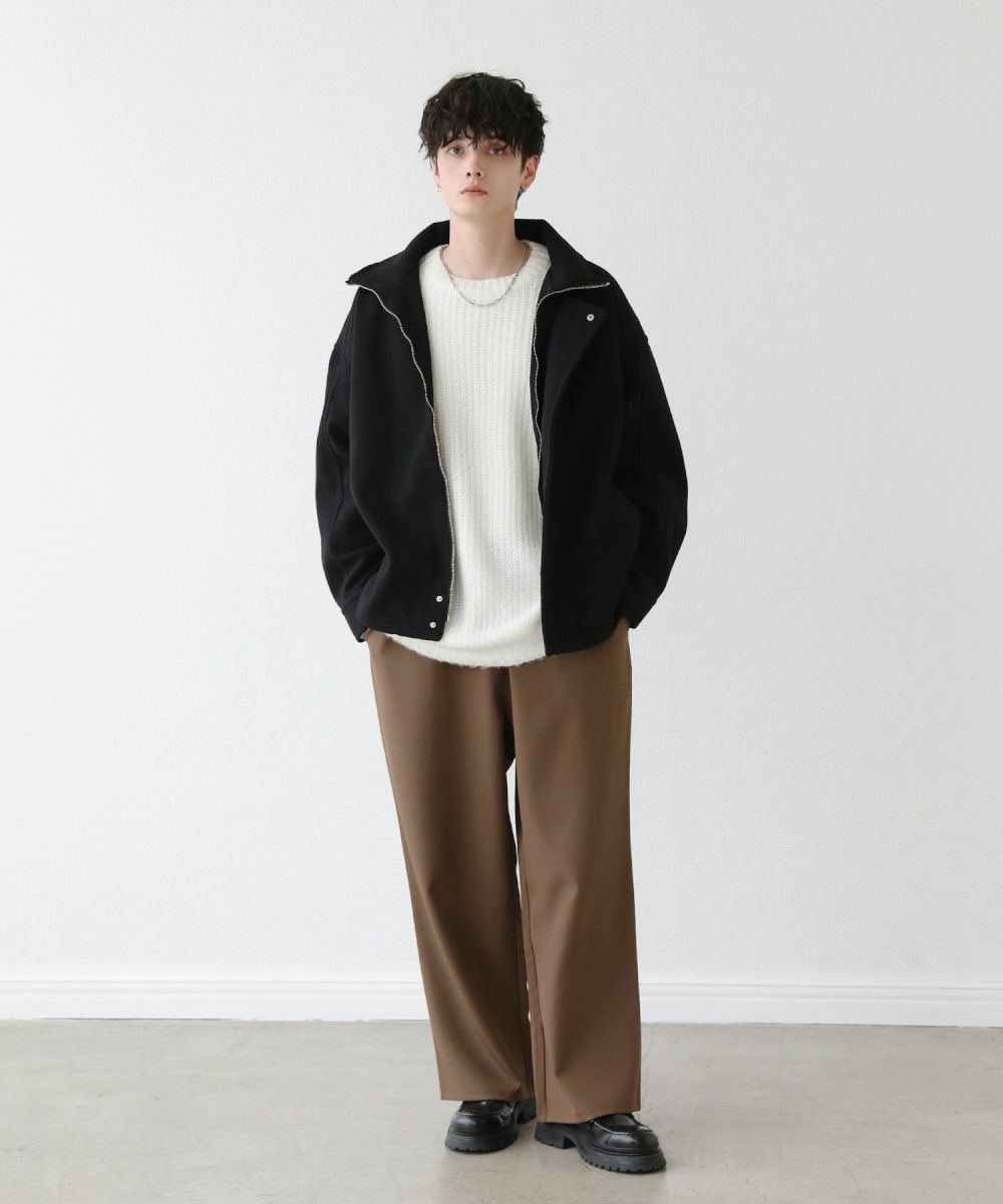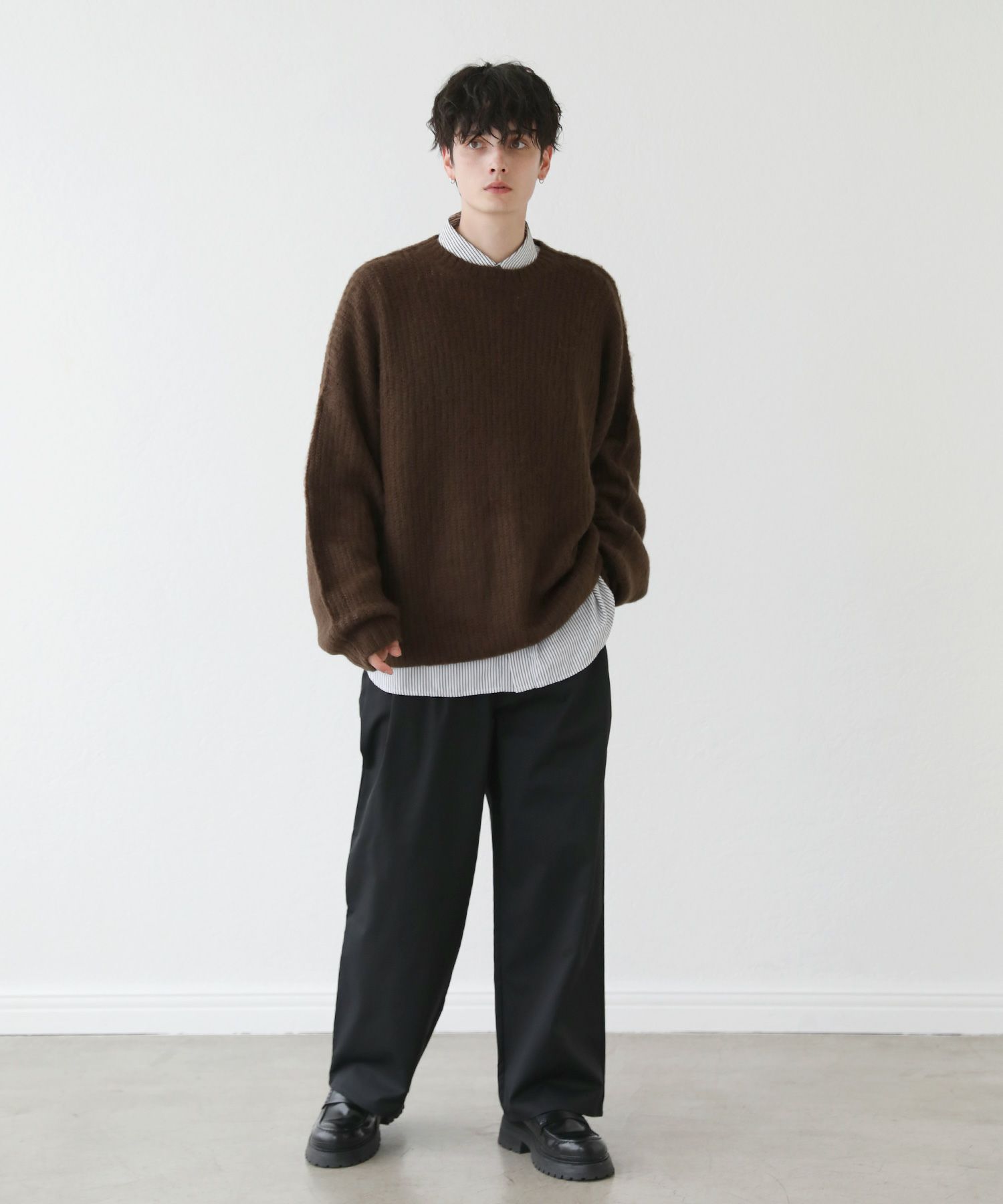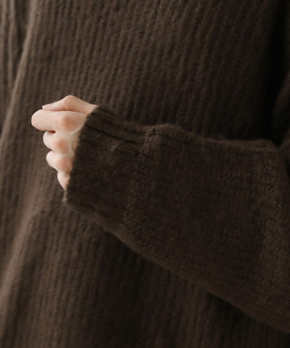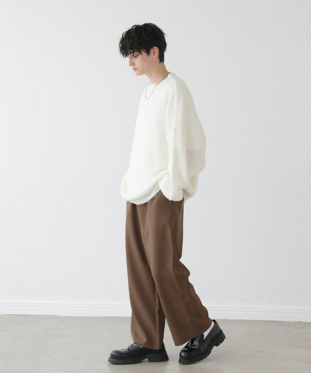 モヘアのような柔らかい肌触りのクルーネックニット。毛足の長いフワッとした質感で、見た目にも季節感と存在感のあるアイテムです。ゆとりのある身幅にドルマン風のデザインでゆったりと着用でき、リラックス感漂う雰囲気。保温性のあるアクリル100%生地で作られているため、寒い季節も暖かく過ごせます。単色のベーシックなデザインで、1枚あると秋から春先まで着回すことのできる便利な一着。定番のブラックやオフホワイトに加え、秋冬らしい深みのある杢グレー、ダークブラウン、ブルーグレーの5色展開です。ベーシックで着回しできるニットのため、色違いで揃えるのもおすすめです。