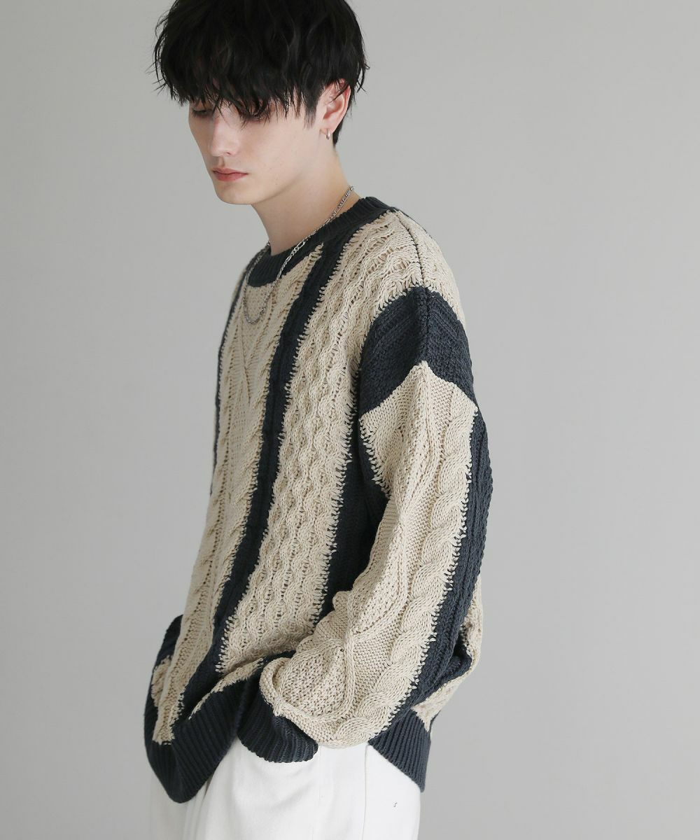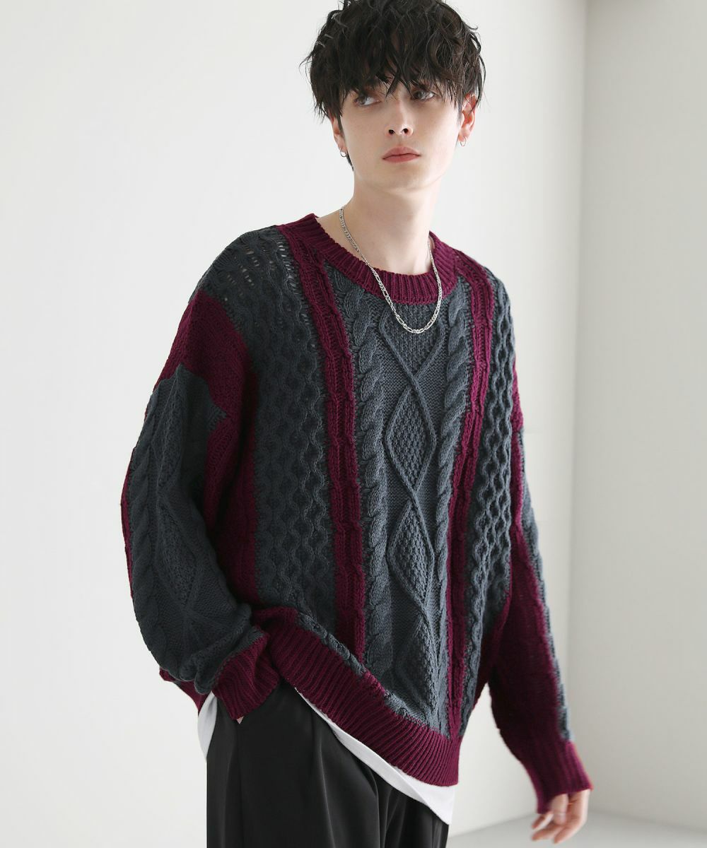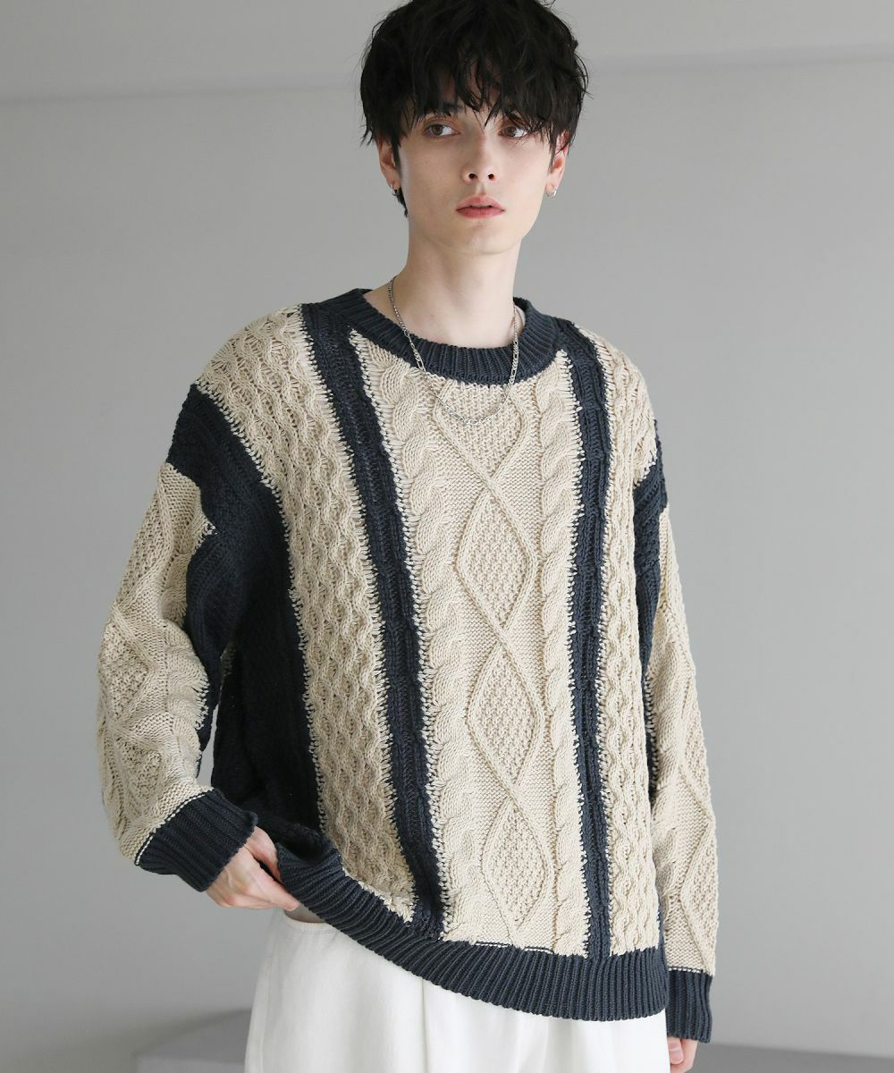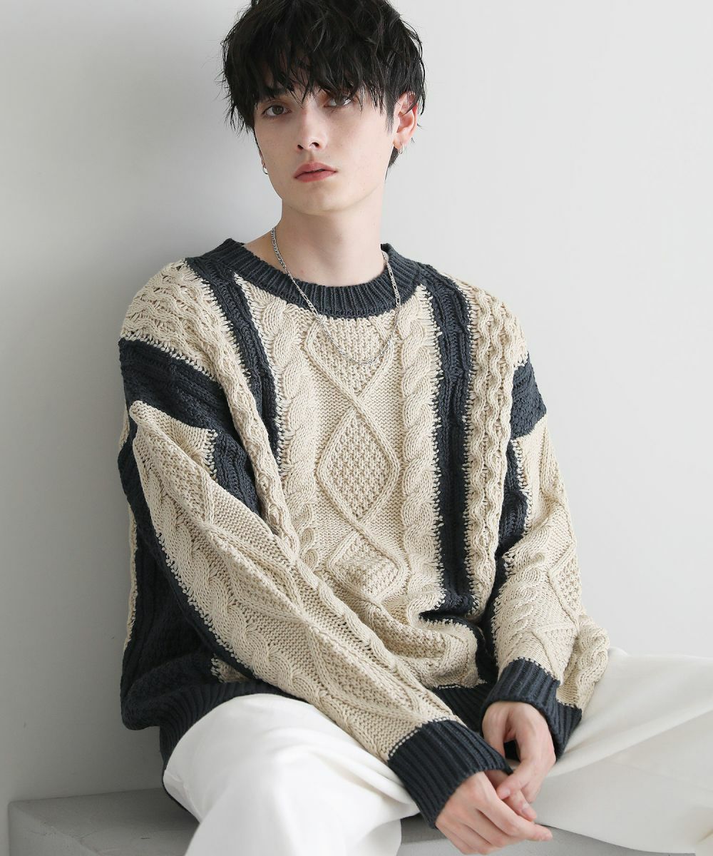 ビッグシルエットでゆったりと着こなせる配色ケーブルニット。ケーブル柄の切り替えがアクセントになり、無地でありながらも存在感のあるアイテムです。肩幅、身幅に余裕を持たせたオーバーサイズで、合わせるだけでトレンド感のあるコーデに。首元と裾はリブ仕様で、寒い季節には風の侵入を防いでくれます。秋冬に使いやすいカラー展開になっております。