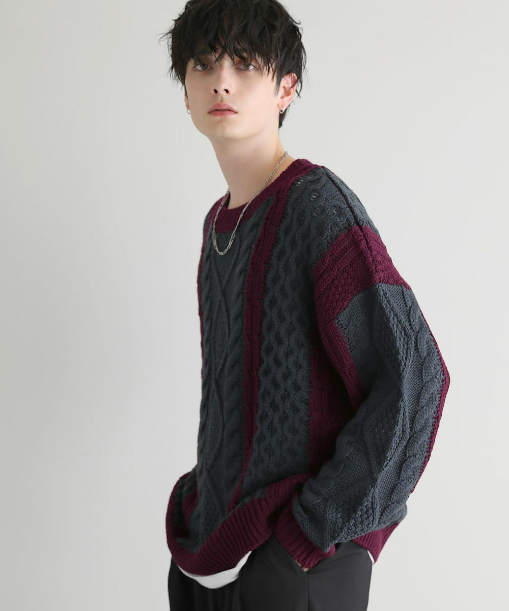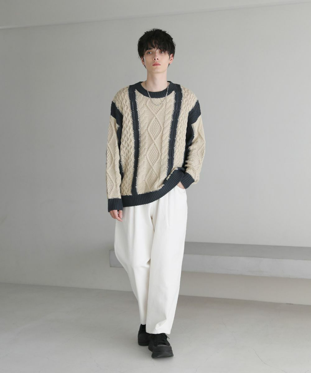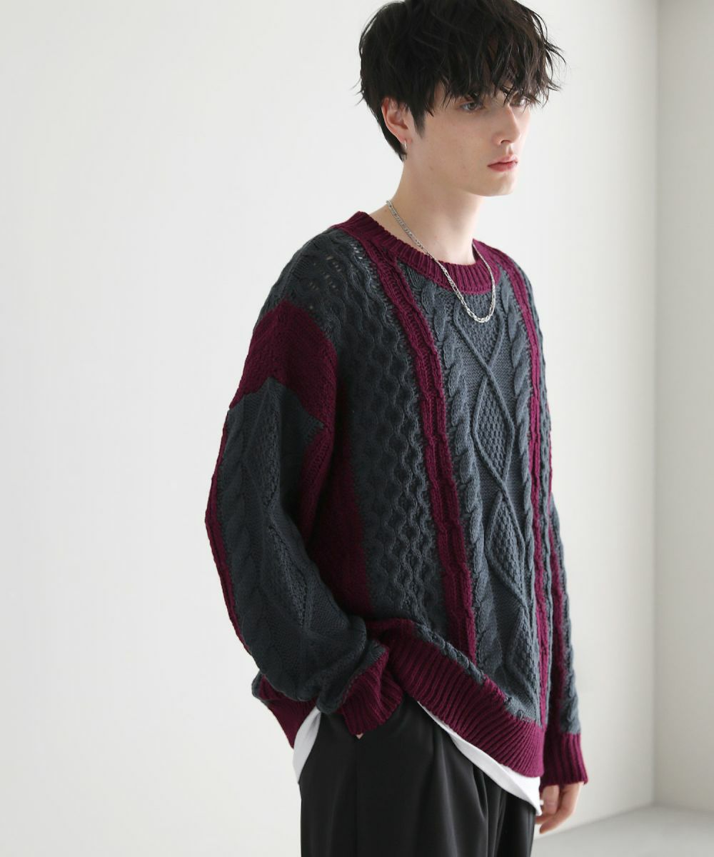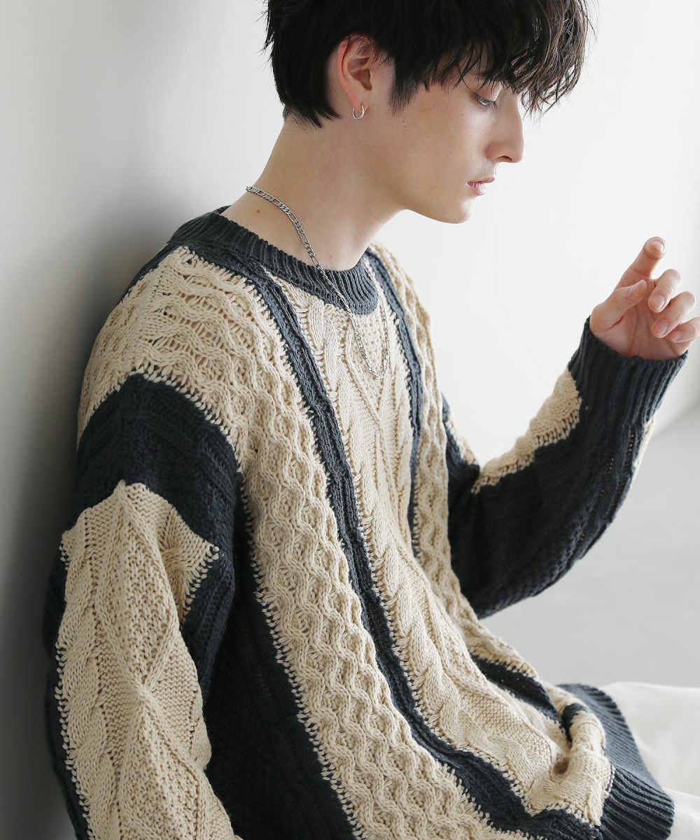 ビッグシルエットでゆったりと着こなせる配色ケーブルニット。ケーブル柄の切り替えがアクセントになり、無地でありながらも存在感のあるアイテムです。肩幅、身幅に余裕を持たせたオーバーサイズで、合わせるだけでトレンド感のあるコーデに。首元と裾はリブ仕様で、寒い季節には風の侵入を防いでくれます。秋冬に使いやすいカラー展開になっております。