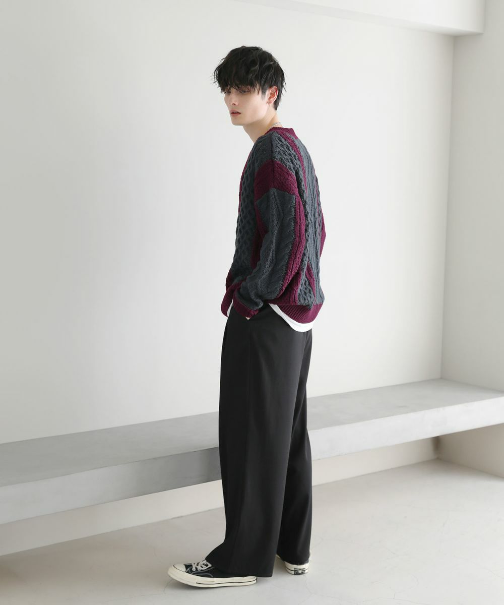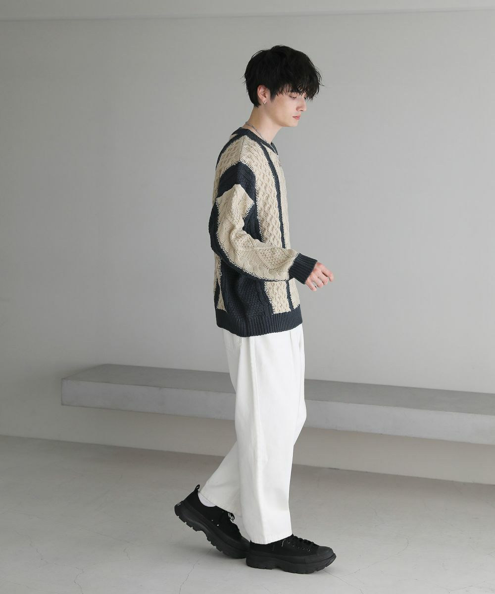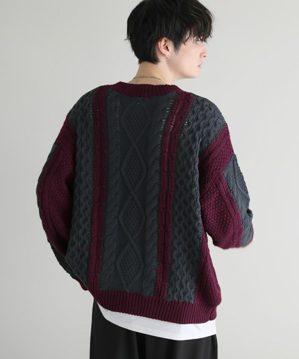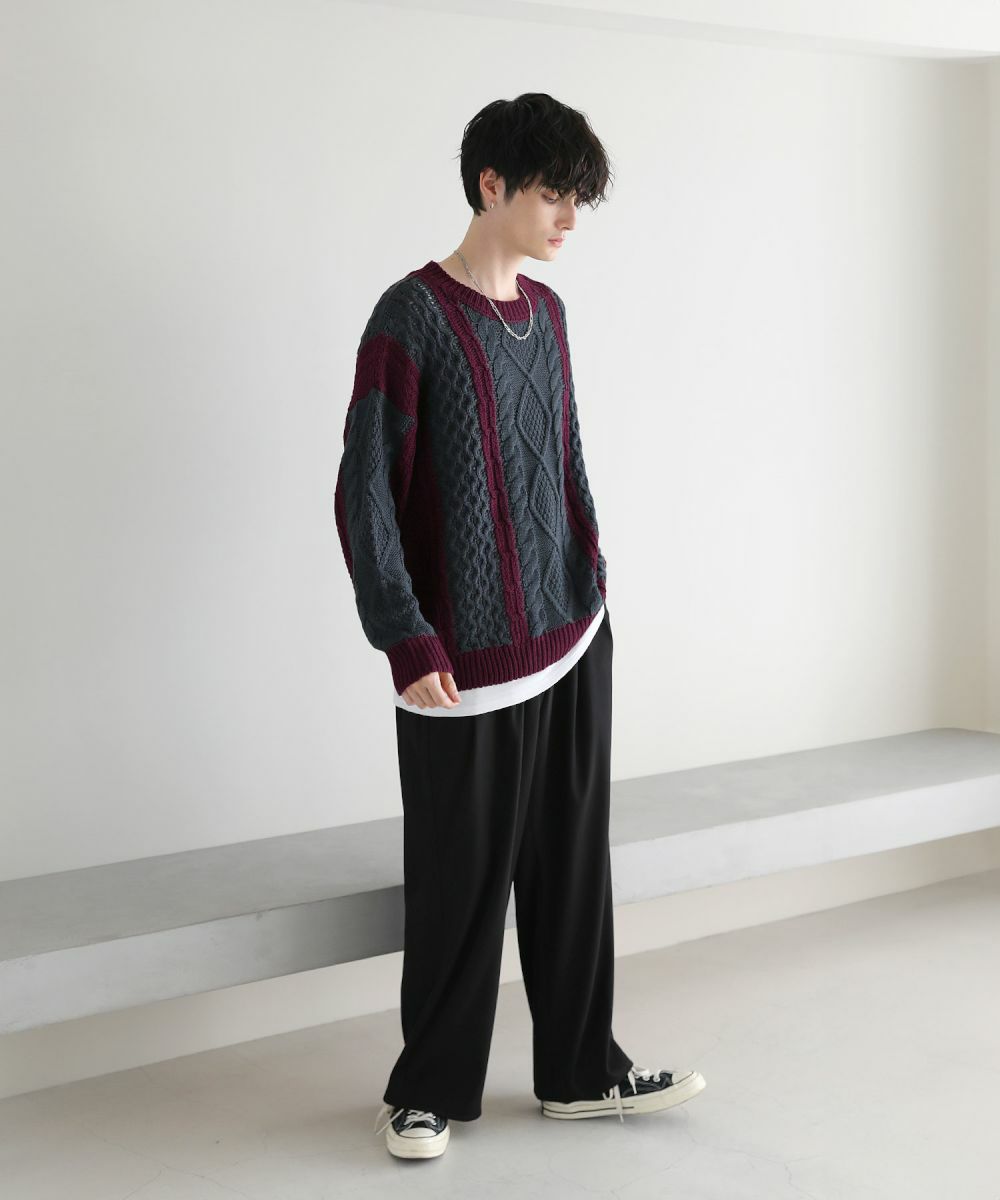 ビッグシルエットでゆったりと着こなせる配色ケーブルニット。ケーブル柄の切り替えがアクセントになり、無地でありながらも存在感のあるアイテムです。肩幅、身幅に余裕を持たせたオーバーサイズで、合わせるだけでトレンド感のあるコーデに。首元と裾はリブ仕様で、寒い季節には風の侵入を防いでくれます。秋冬に使いやすいカラー展開になっております。