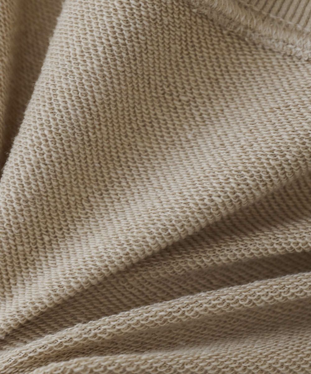 綿とポリエステルを混紡した軽い着心地の裏毛スウェットを使用しています。柔らかい肌触りで、肌馴染みの良い快適な着心地です。