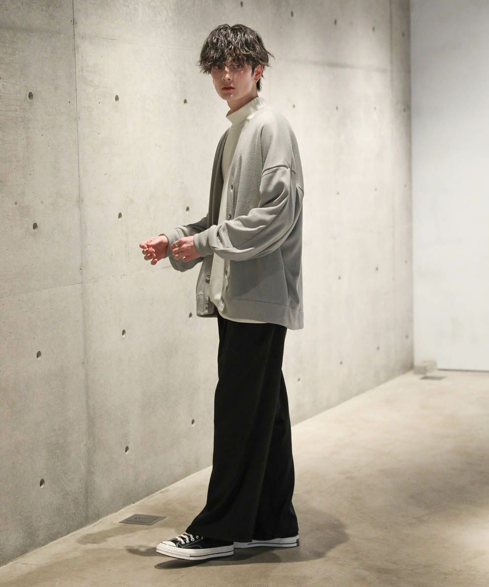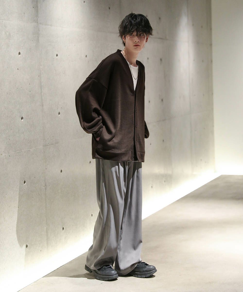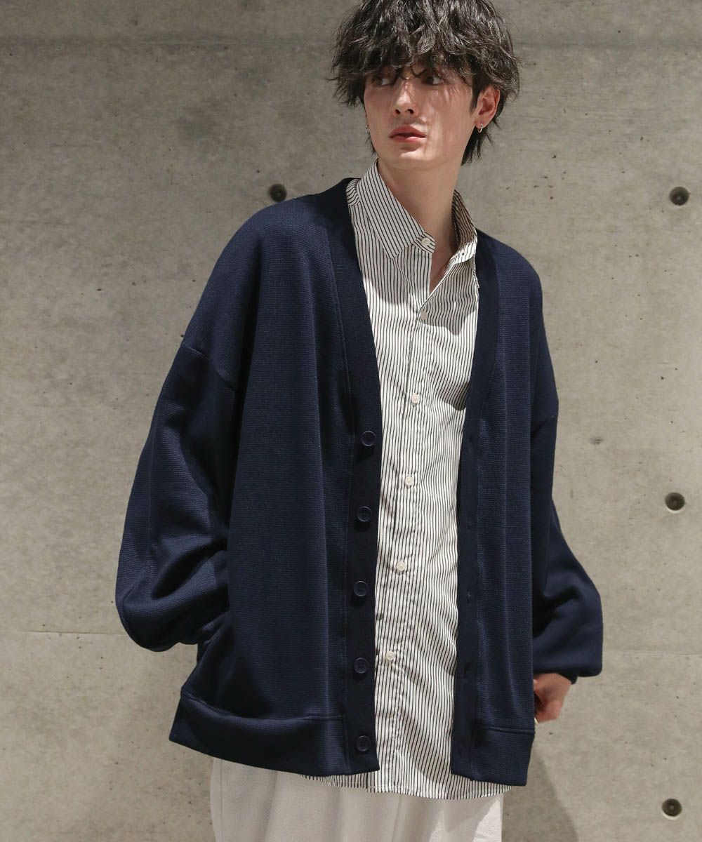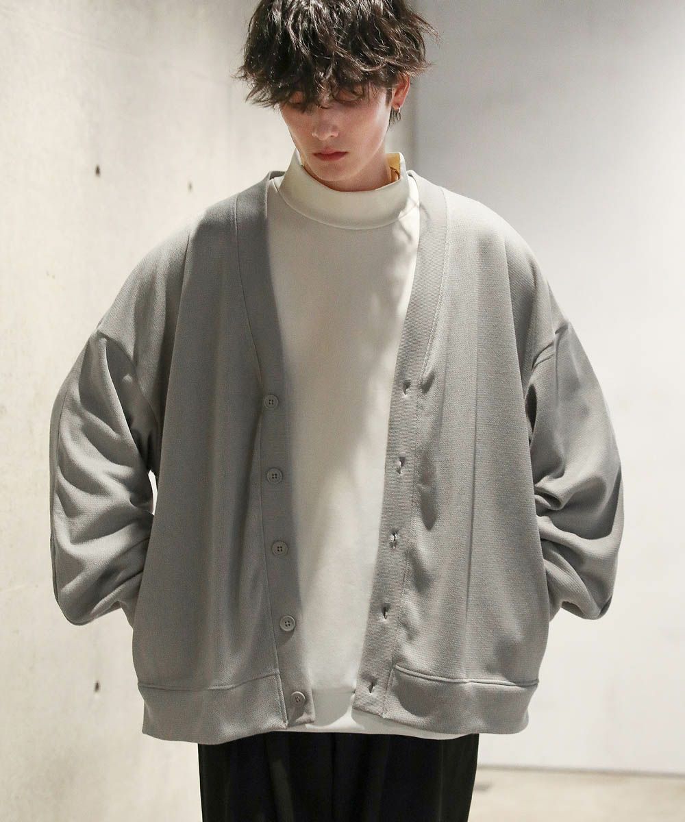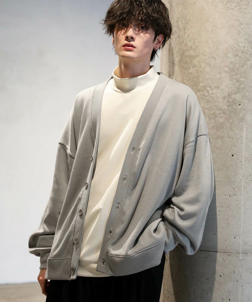 落ち感とドレープ感が醸し出すこなれた雰囲気が魅力のカーディガン。ハイゲージで編んだミラノリブを使用ししており、生地表面の微光沢が上品な印象をプラスします。ゆったりとした身幅とドロップショルダーに、たまり袖がアクセントになった1着。また、顔周りをスッキリと見せるVネックを採用。インナーとのレイヤードも楽しめ、着回し力の高いアイテムです。